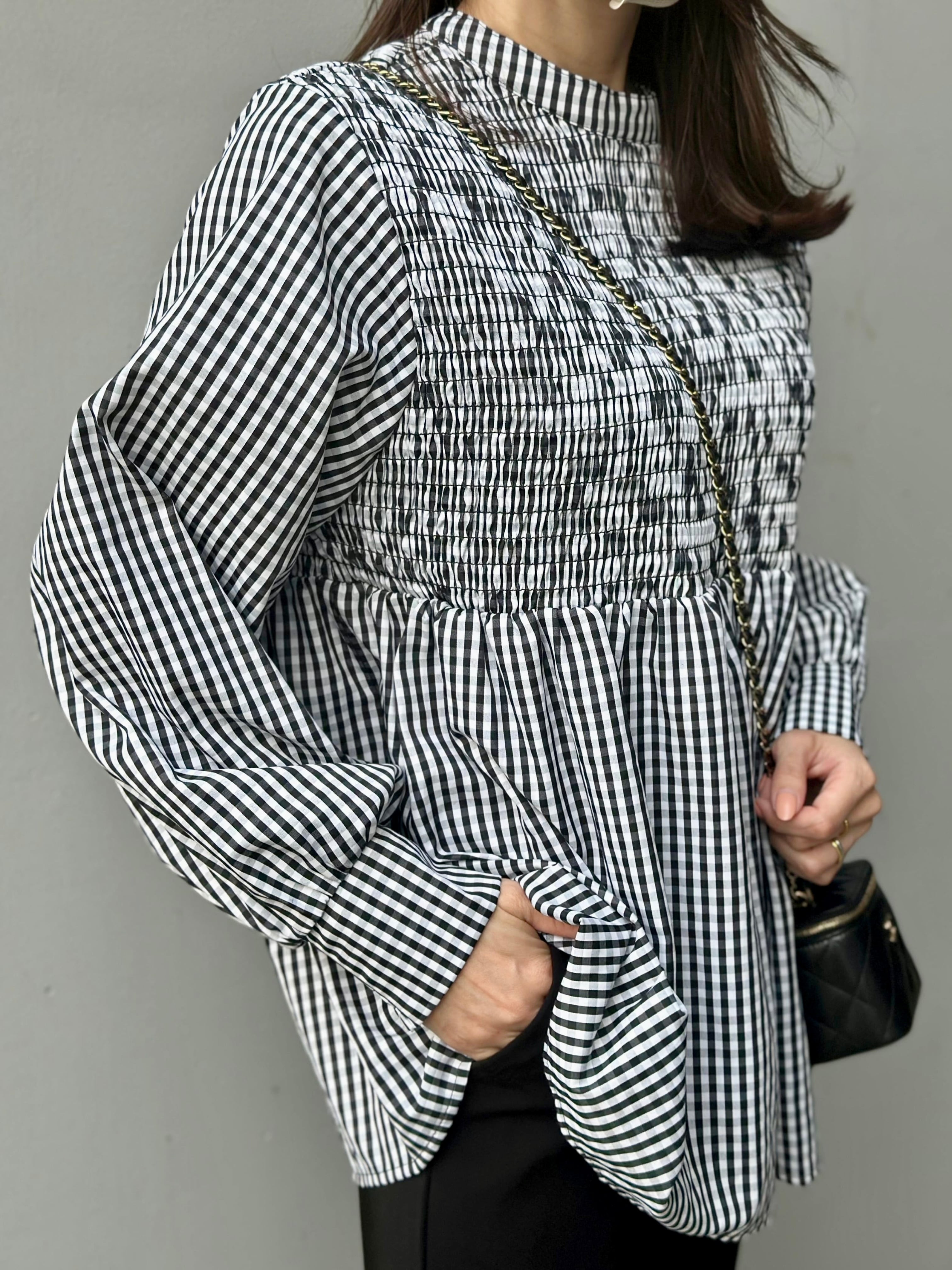 3colorsギンガムチェックシャーリングブラウス(長袖)