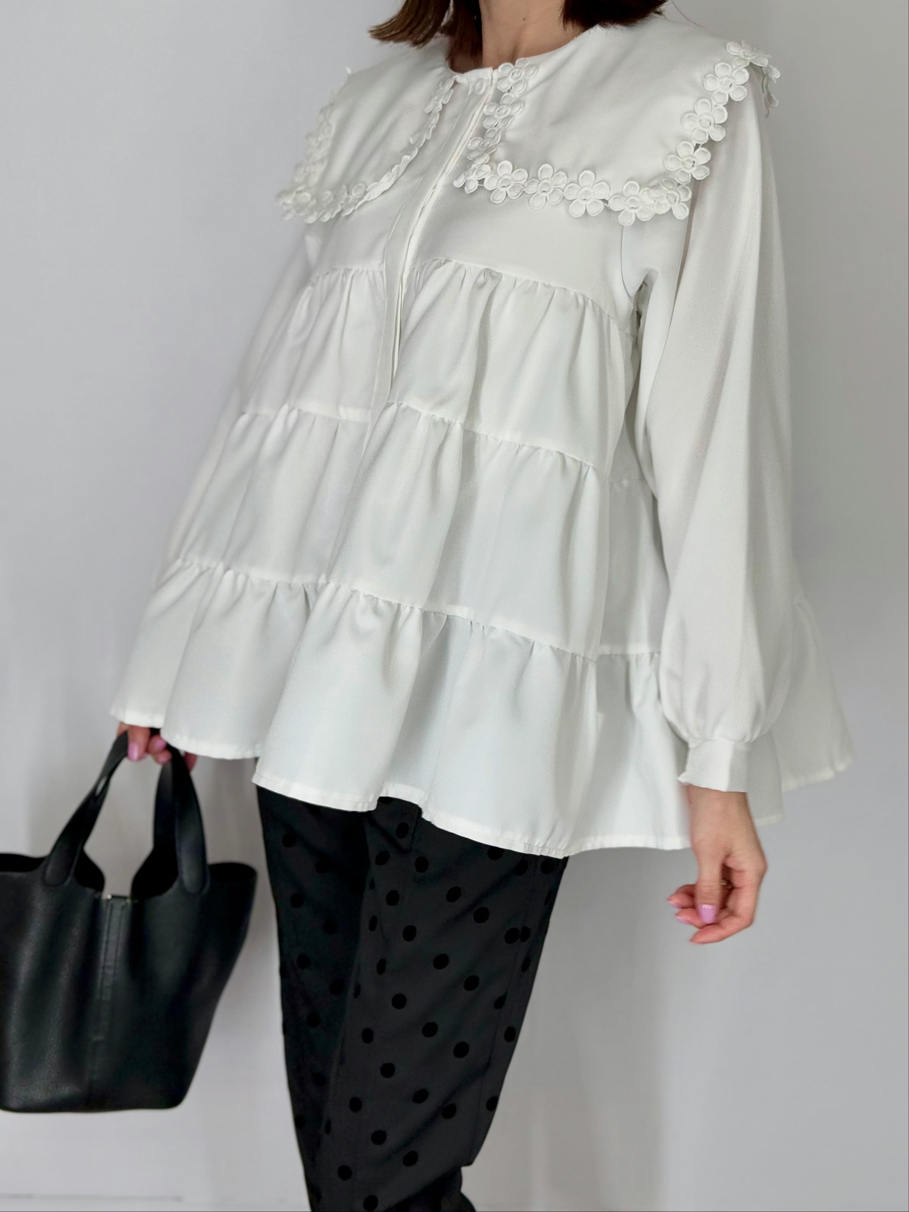 大きめのフラワーカラーがポイントになり、シンプルなボトムスと合わせるだけで”映える”主役級ブラウスになります!