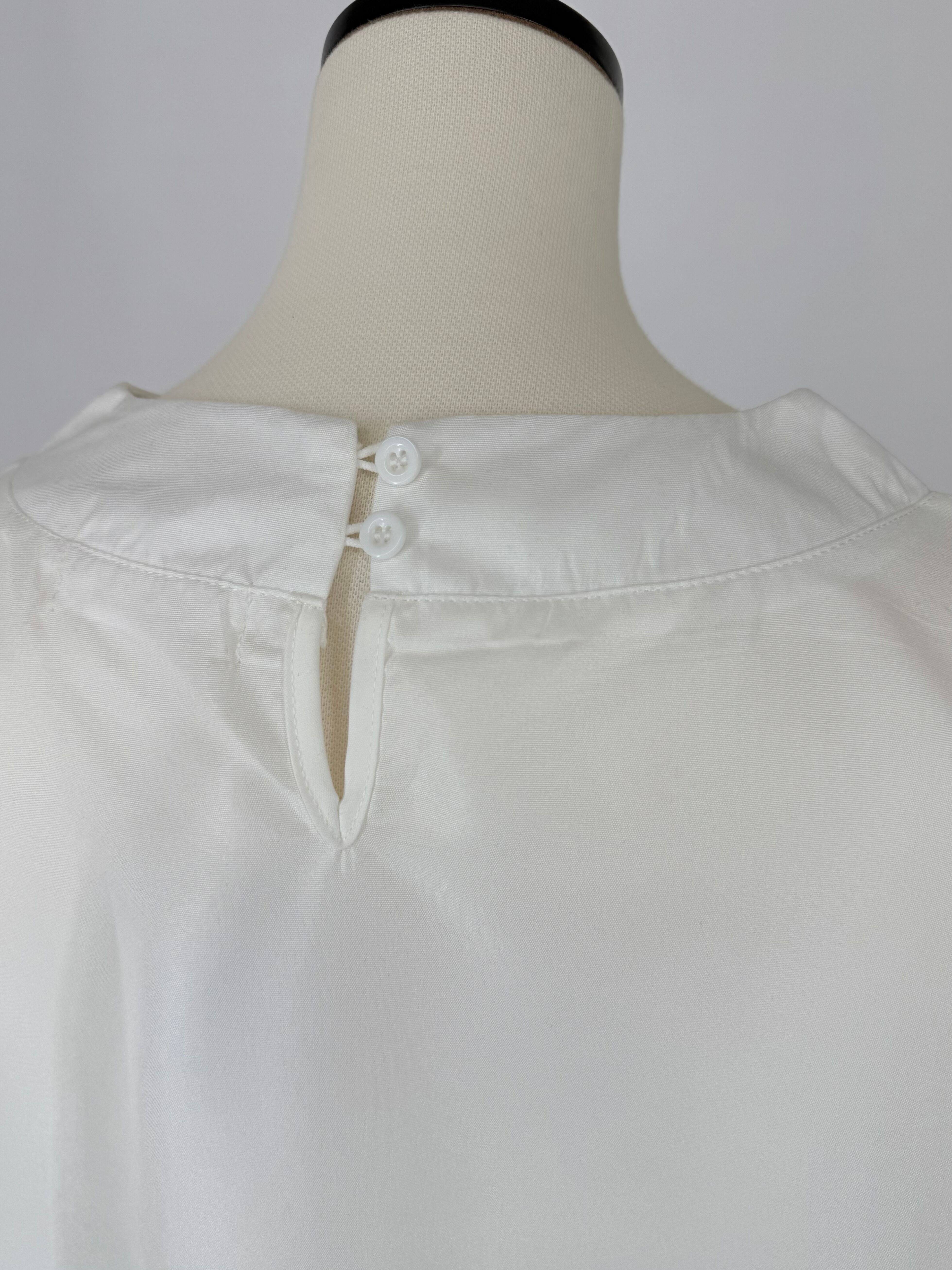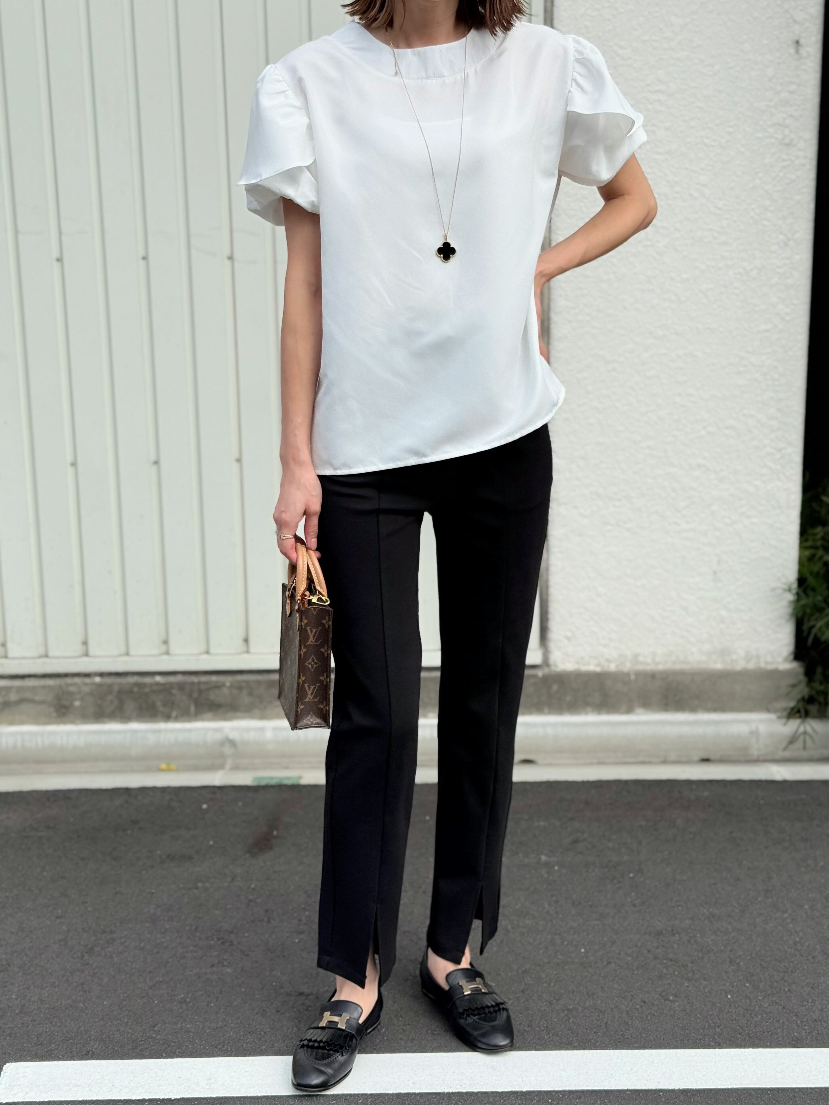 花びらのように重なるペタルスリーブが印象的な、大人の華やぎトップス。