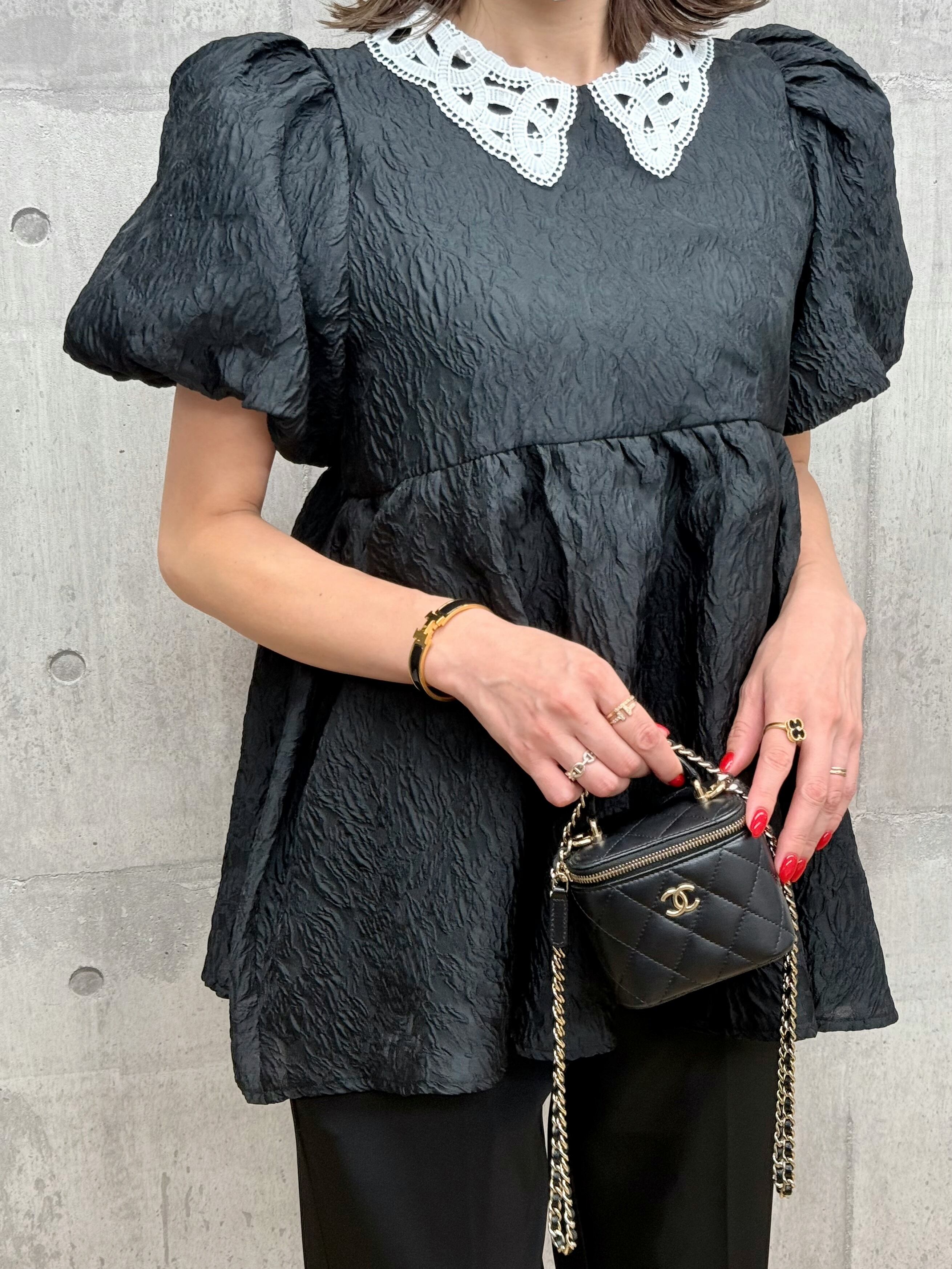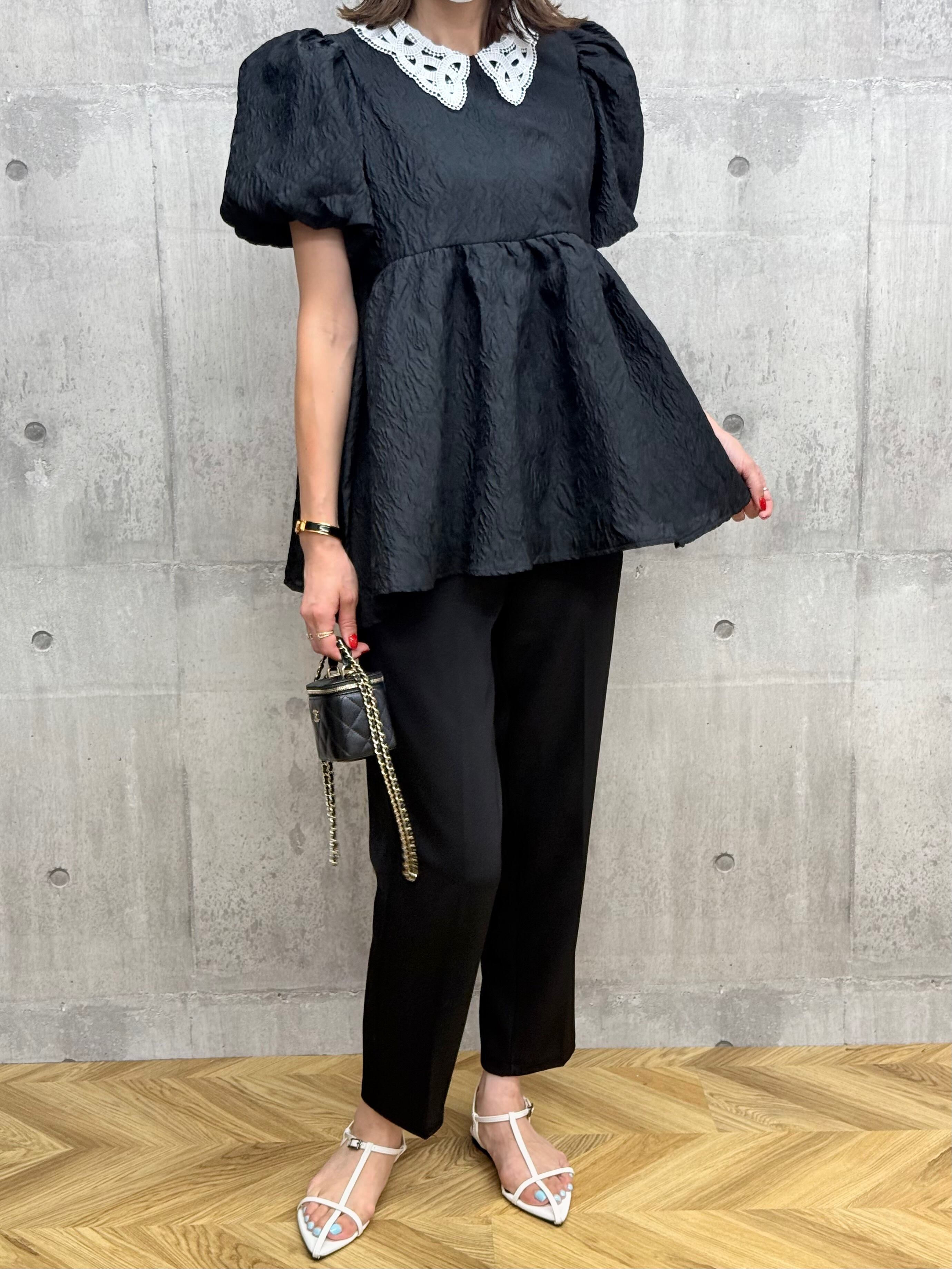ふんわりと広がるシルエットに、刺繍レースのバイカラー襟が映える一枚。