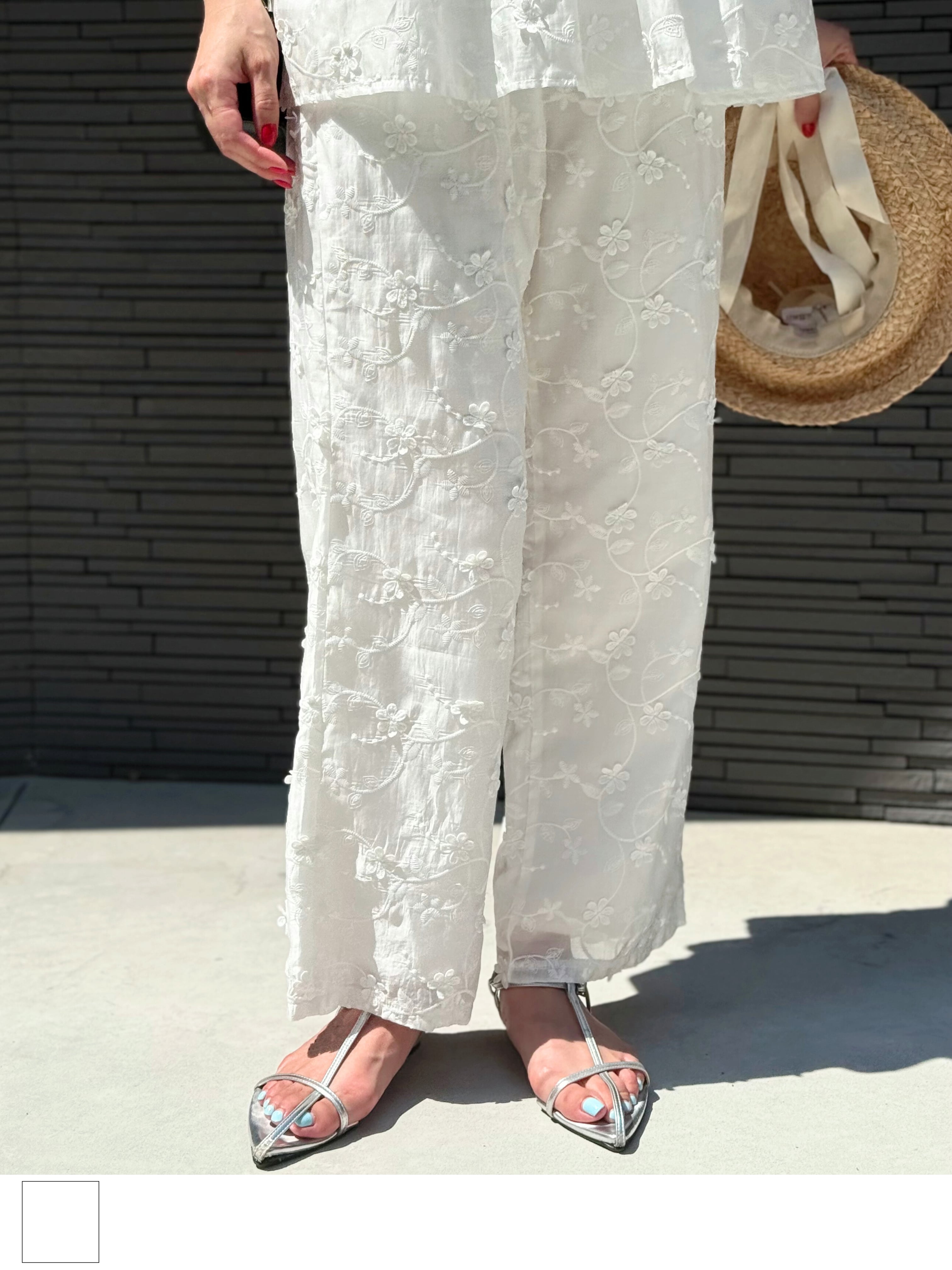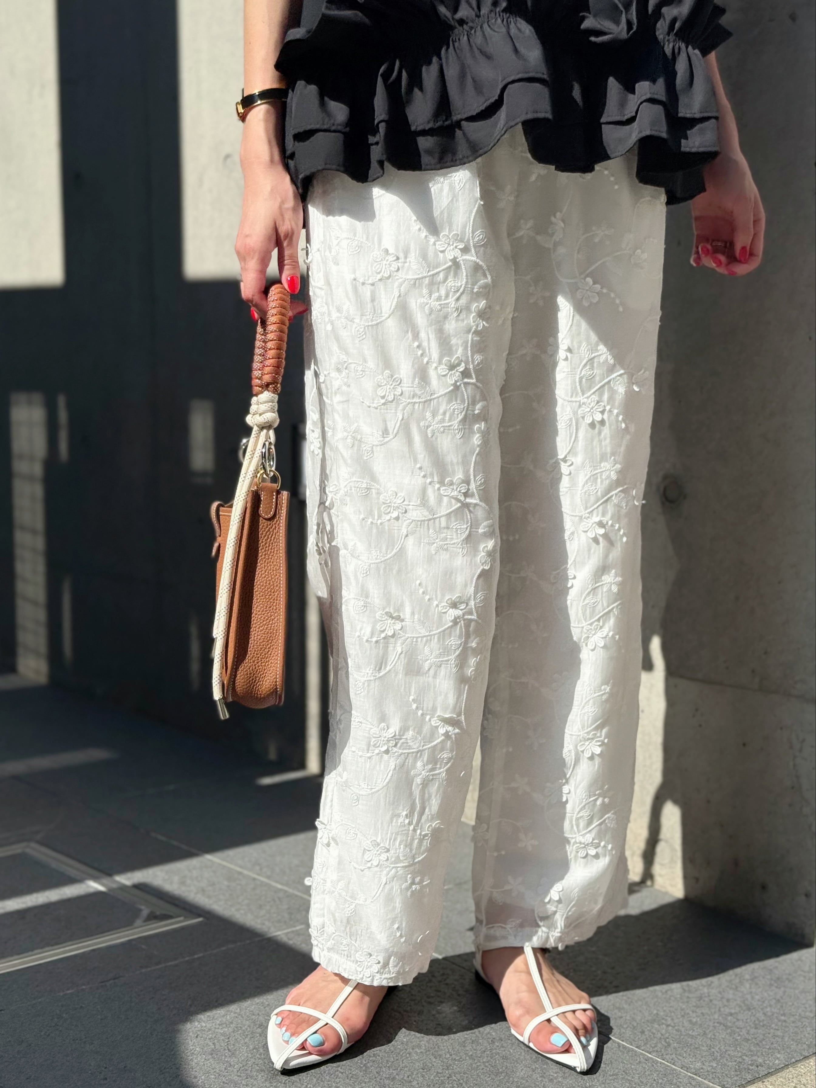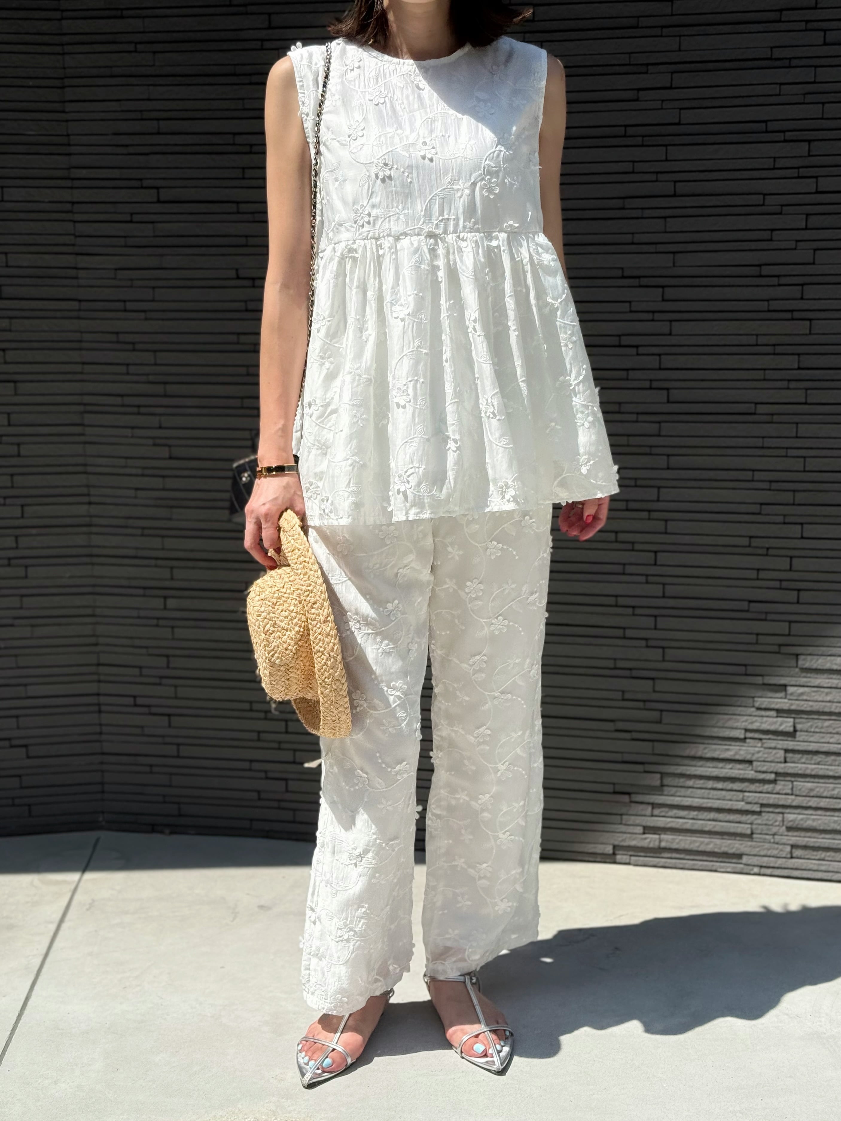 同素材の『リュクスホワイトフラワートップス』と合わせて、気負わず“きれいめセットアップ”が完成します。