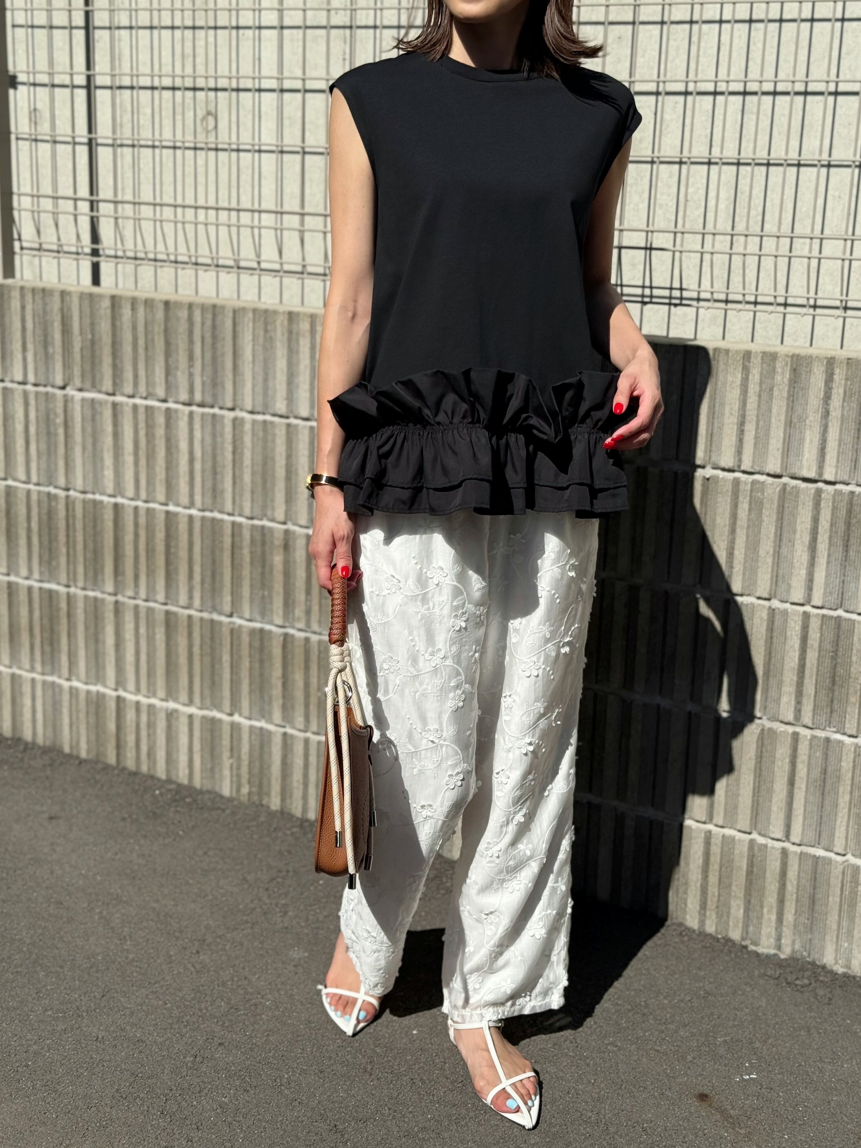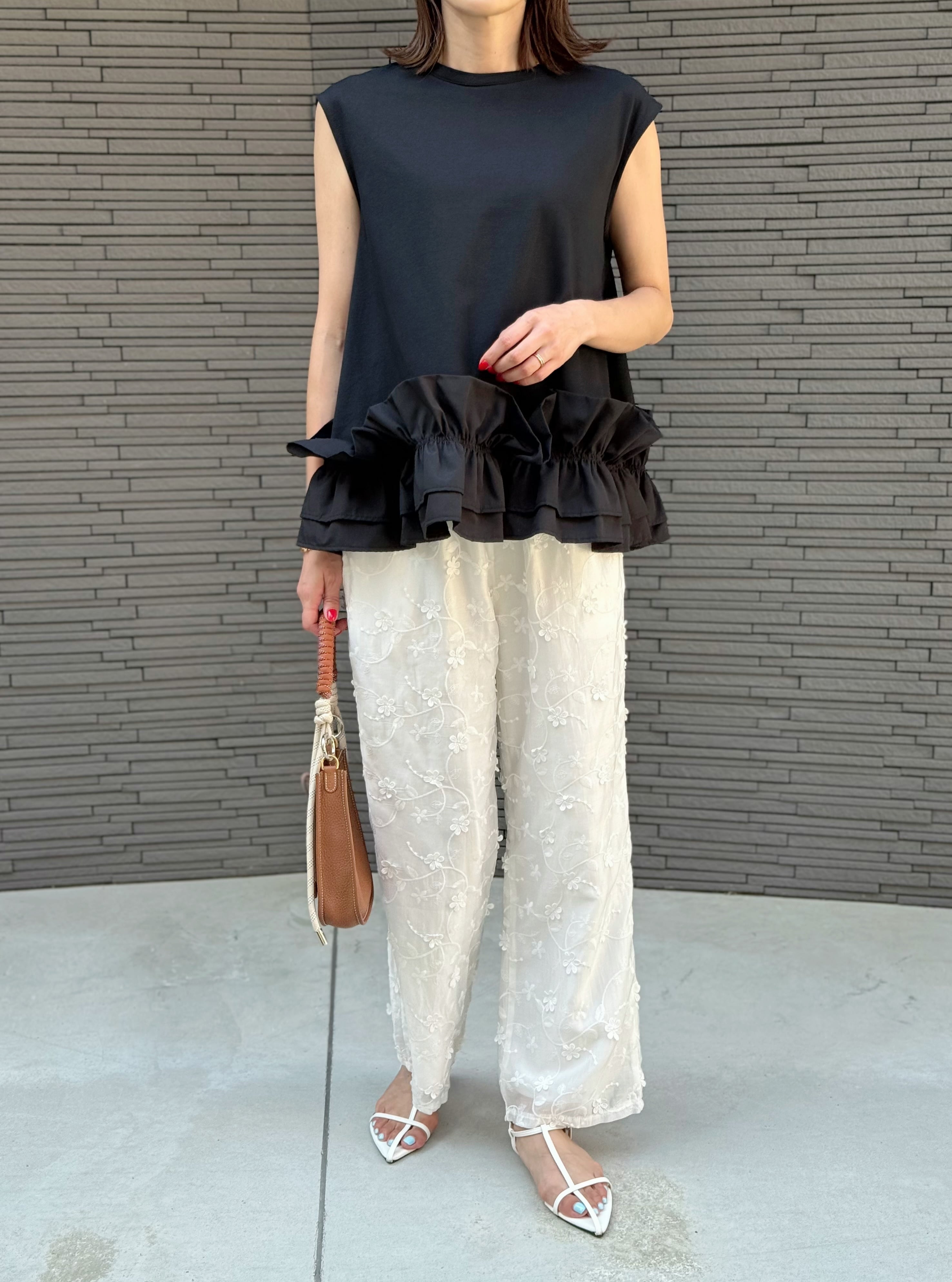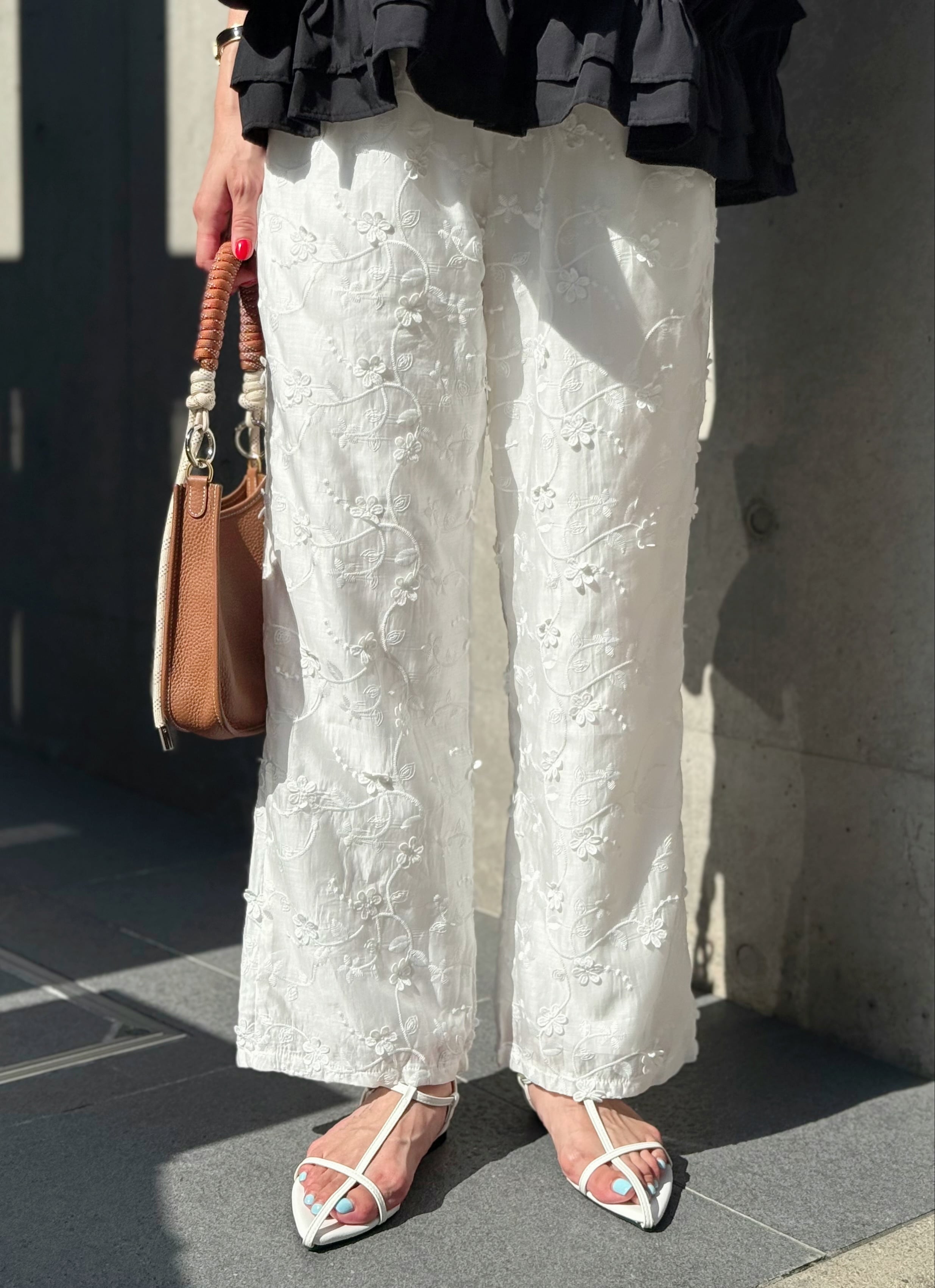 同素材の『リュクスホワイトフラワートップス』と合わせて、気負わず“きれいめセットアップ”が完成します。