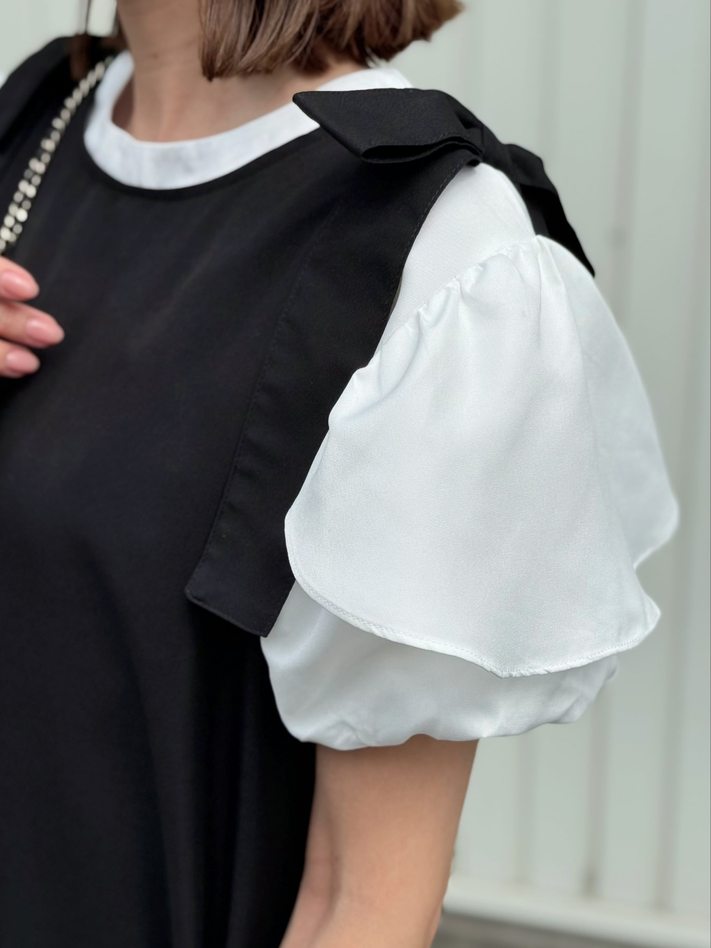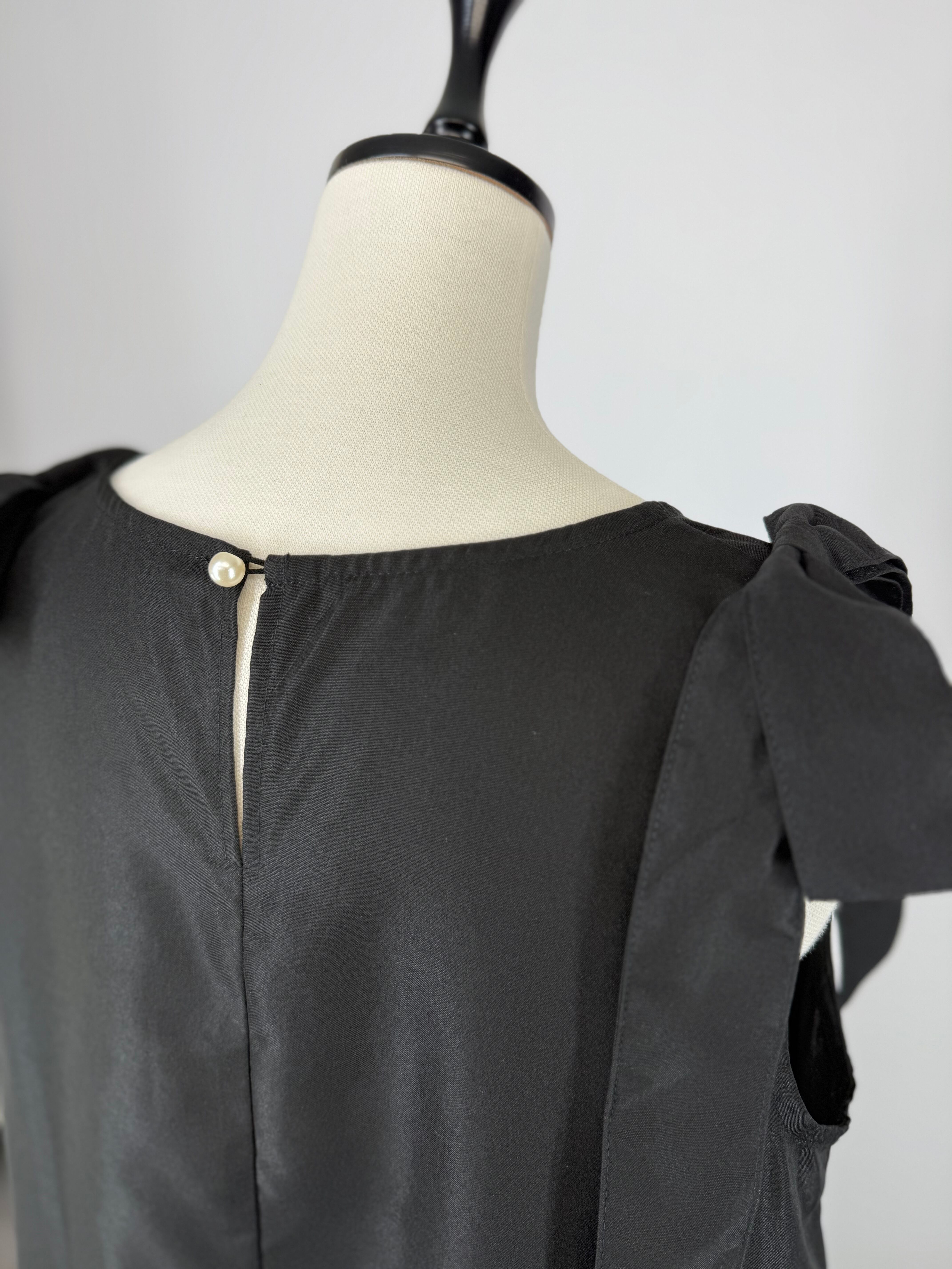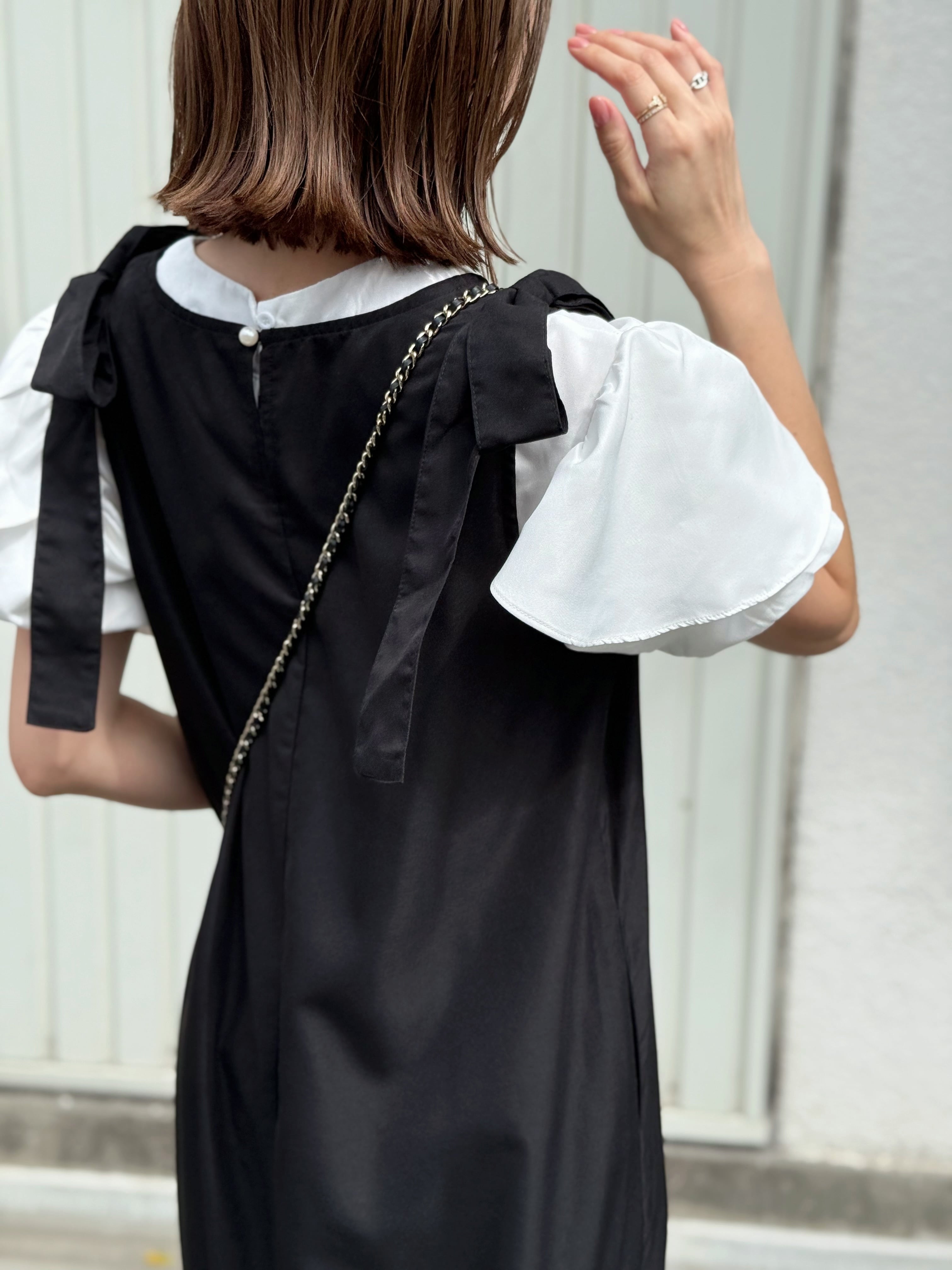 肩にあしらわれた大胆なリボンが、顔周りに華やぎと視線を集め、一枚で主役級の存在感を放ちます。