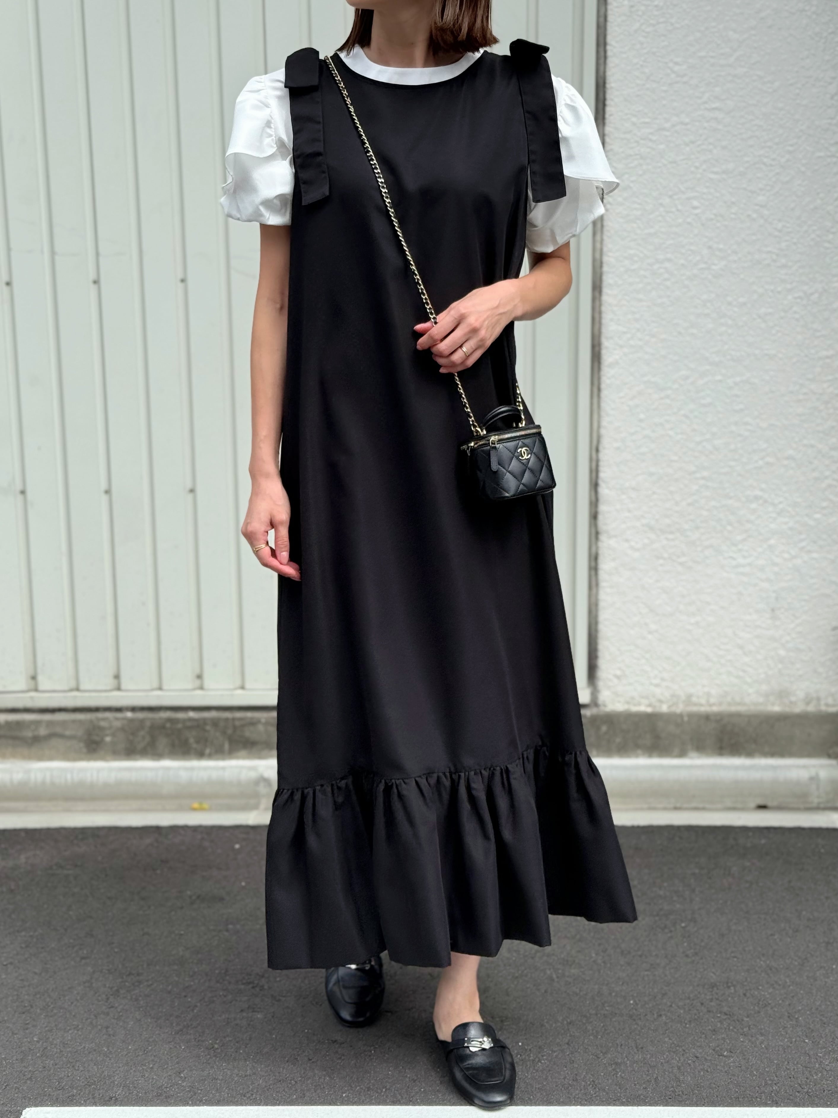 裾にかけてのさりげないフリルや、シックなブラックカラーが、大人の女性にふさわしい上品さをプラスします。