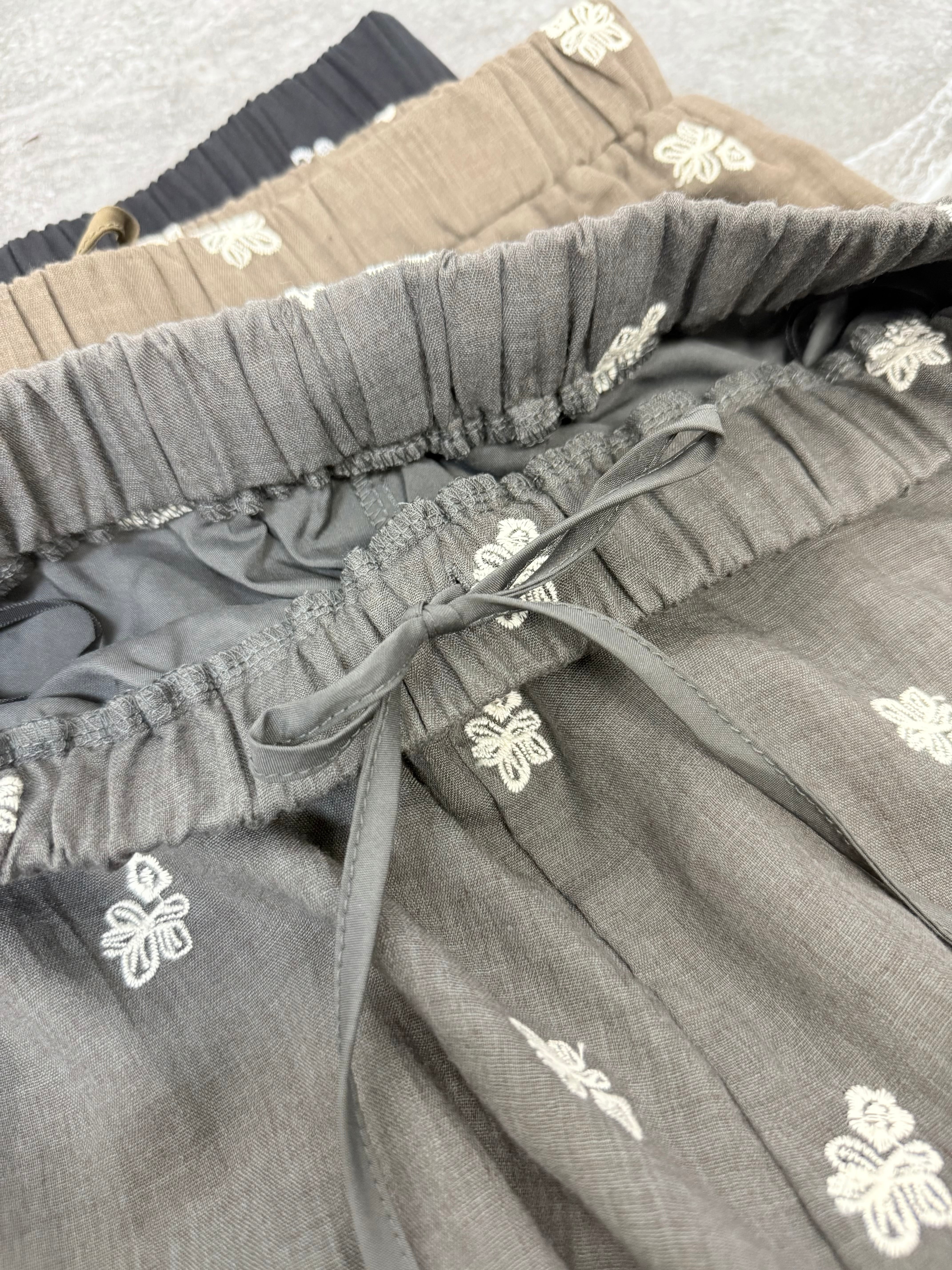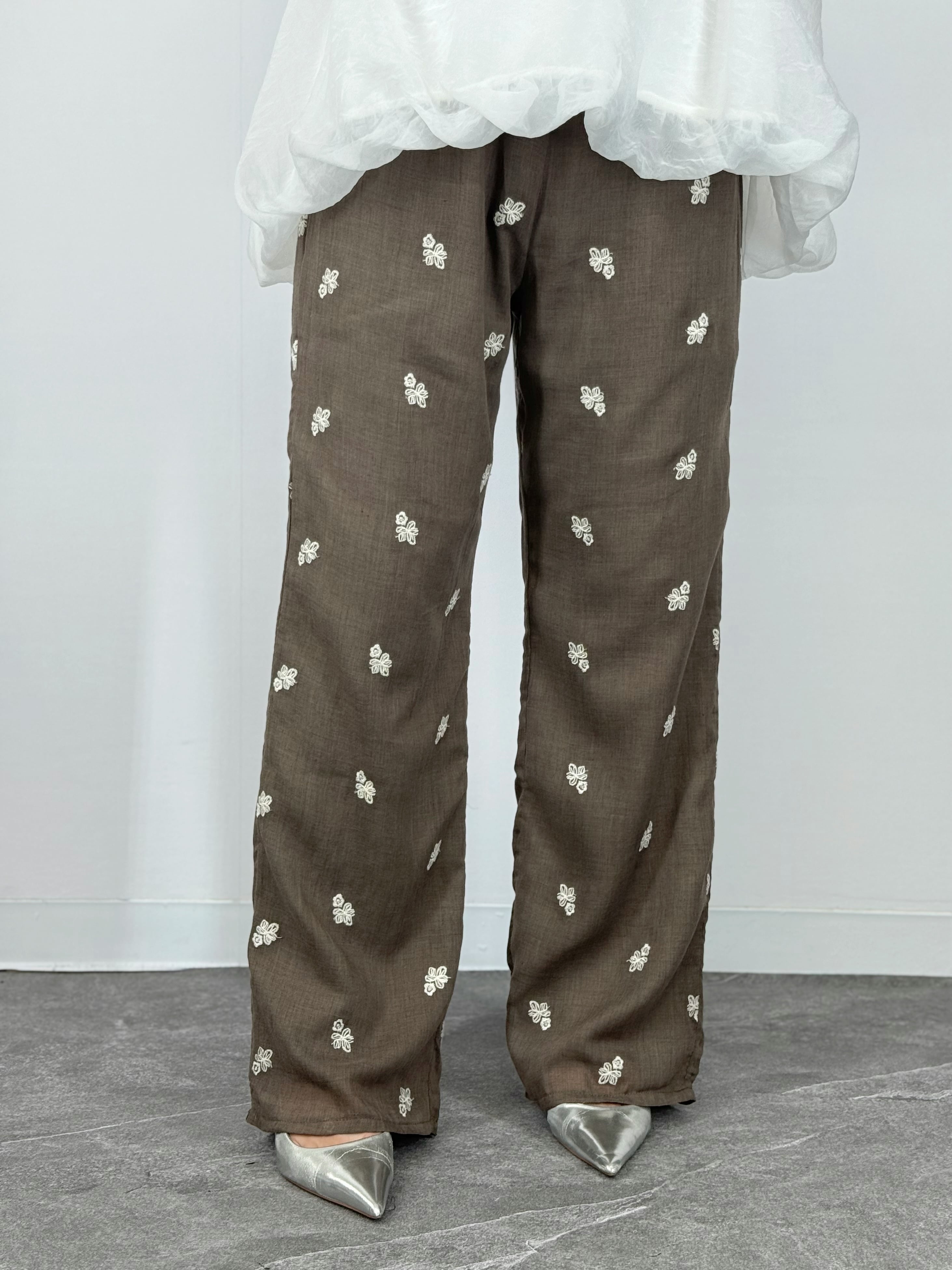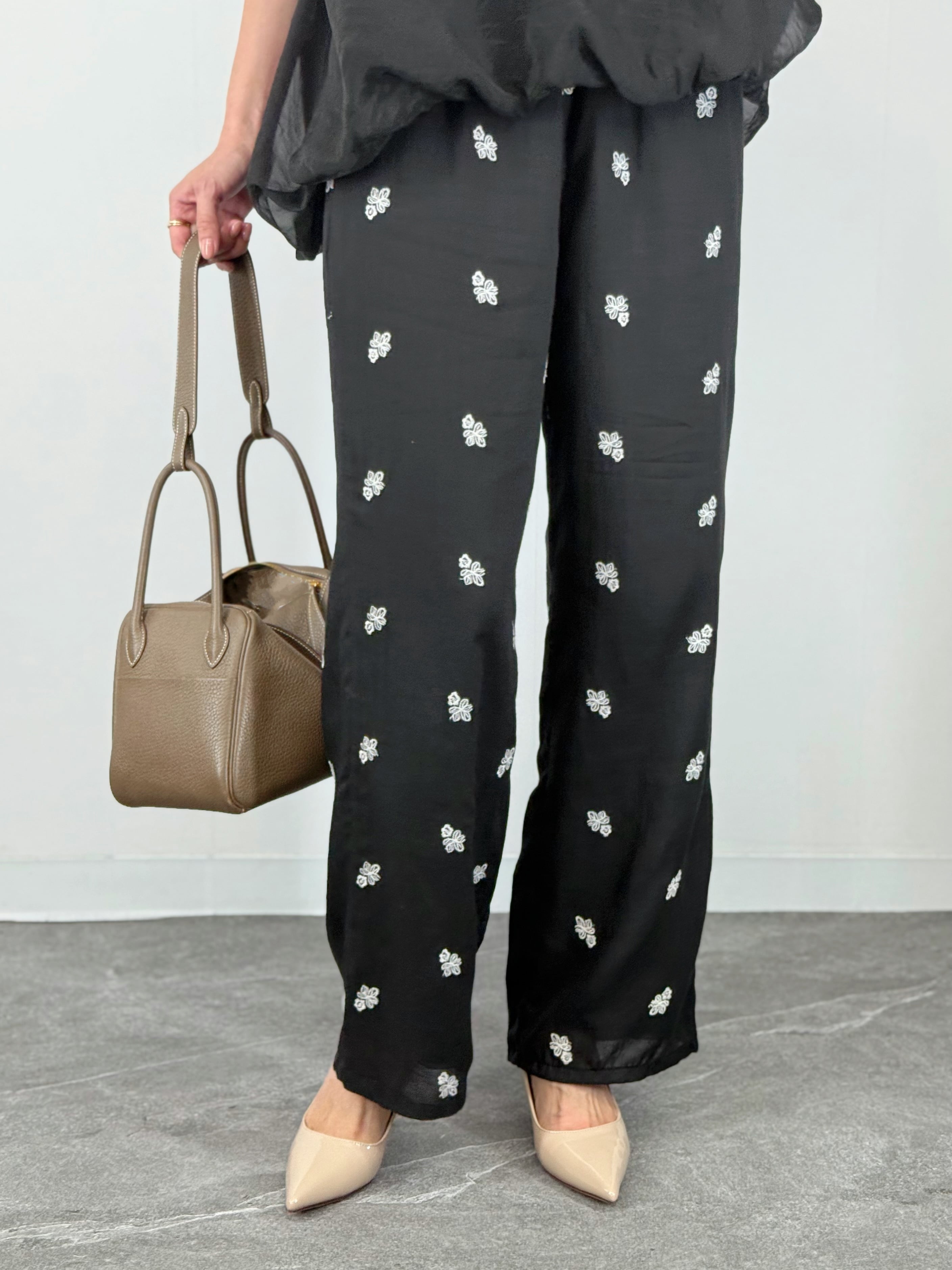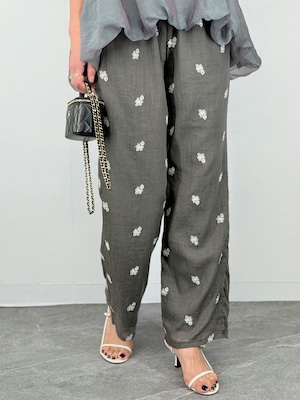 晩夏に似合う、繊細なフラワー刺繍が目を惹くワイドパンツ。
