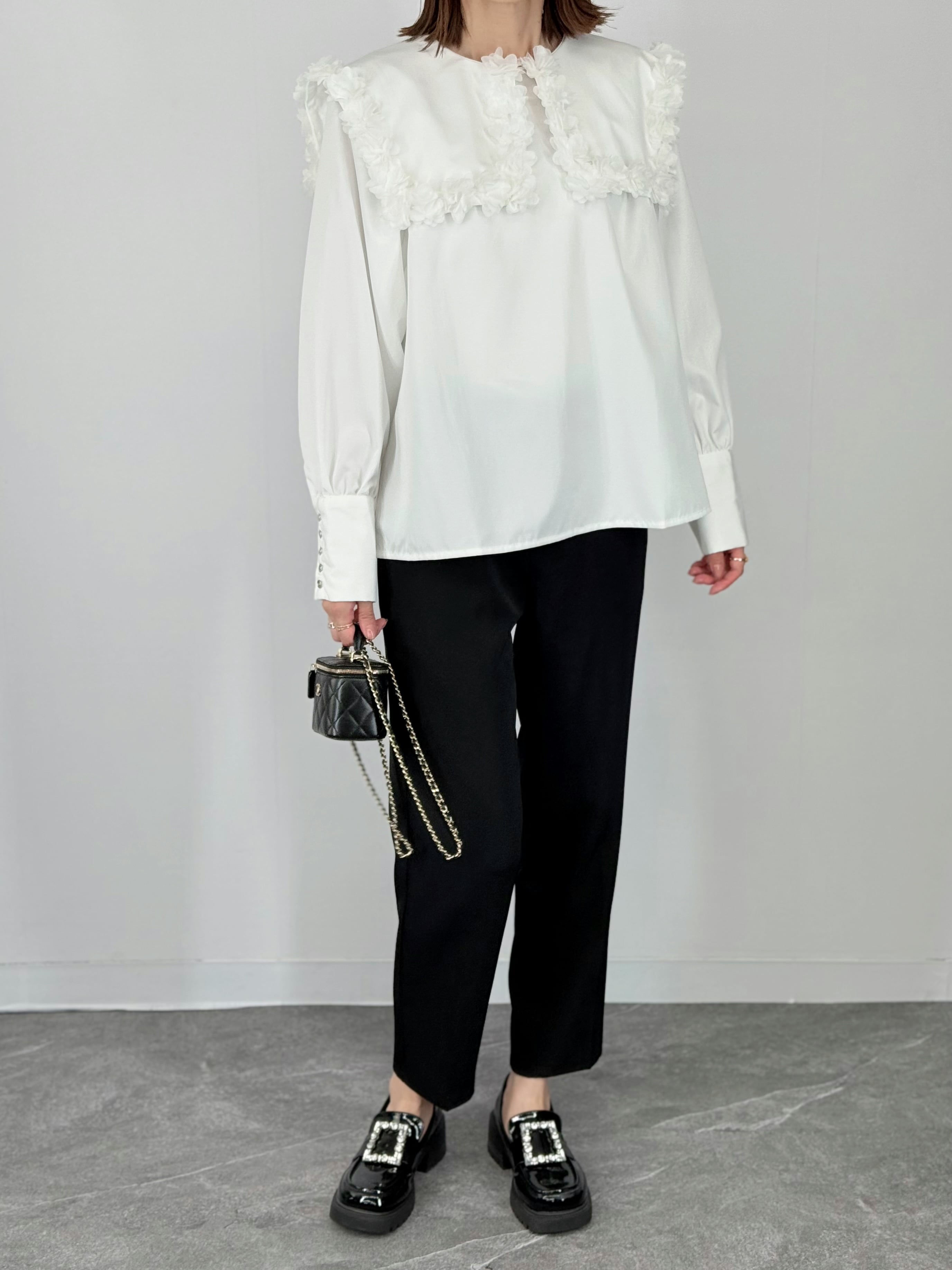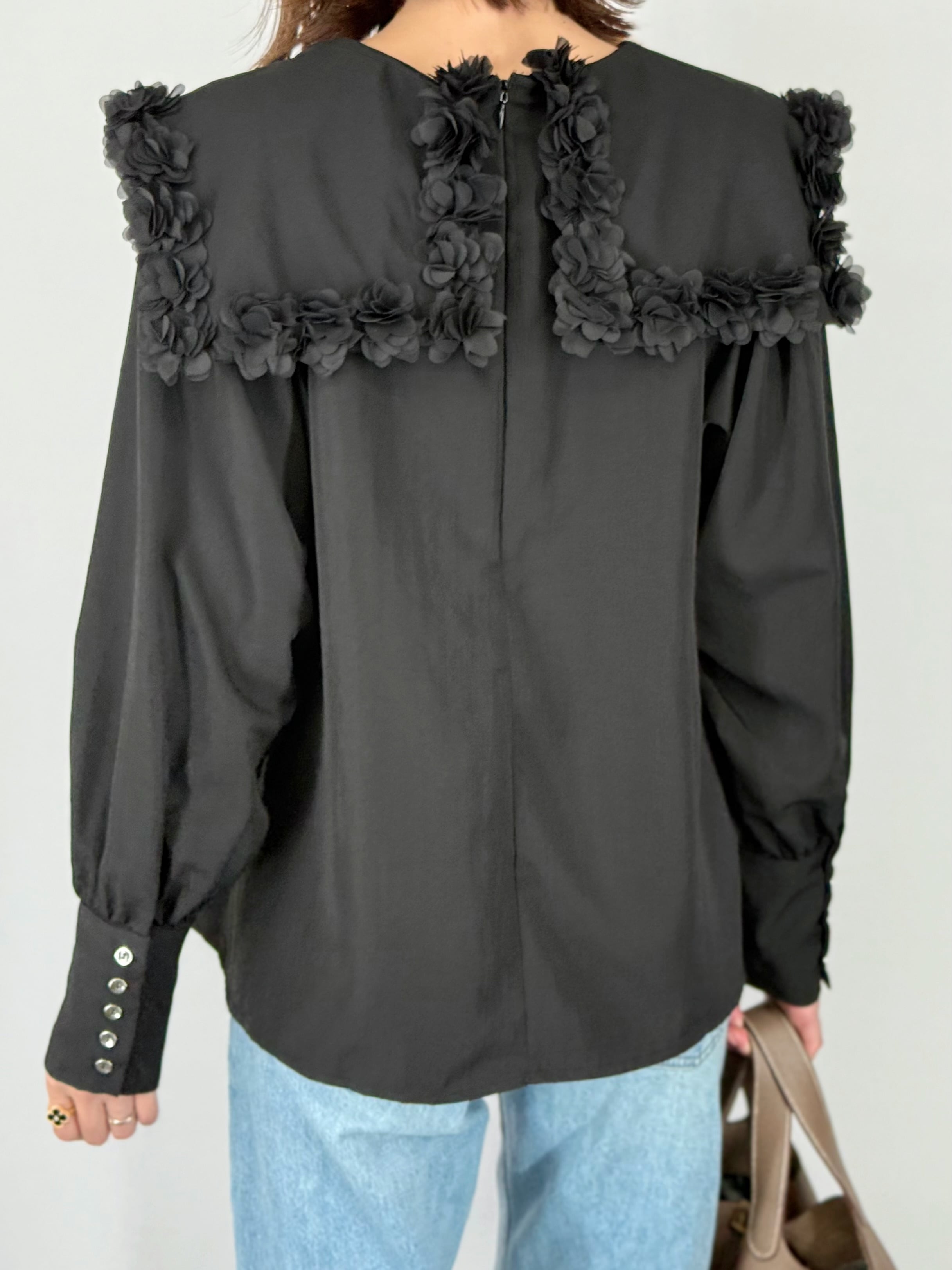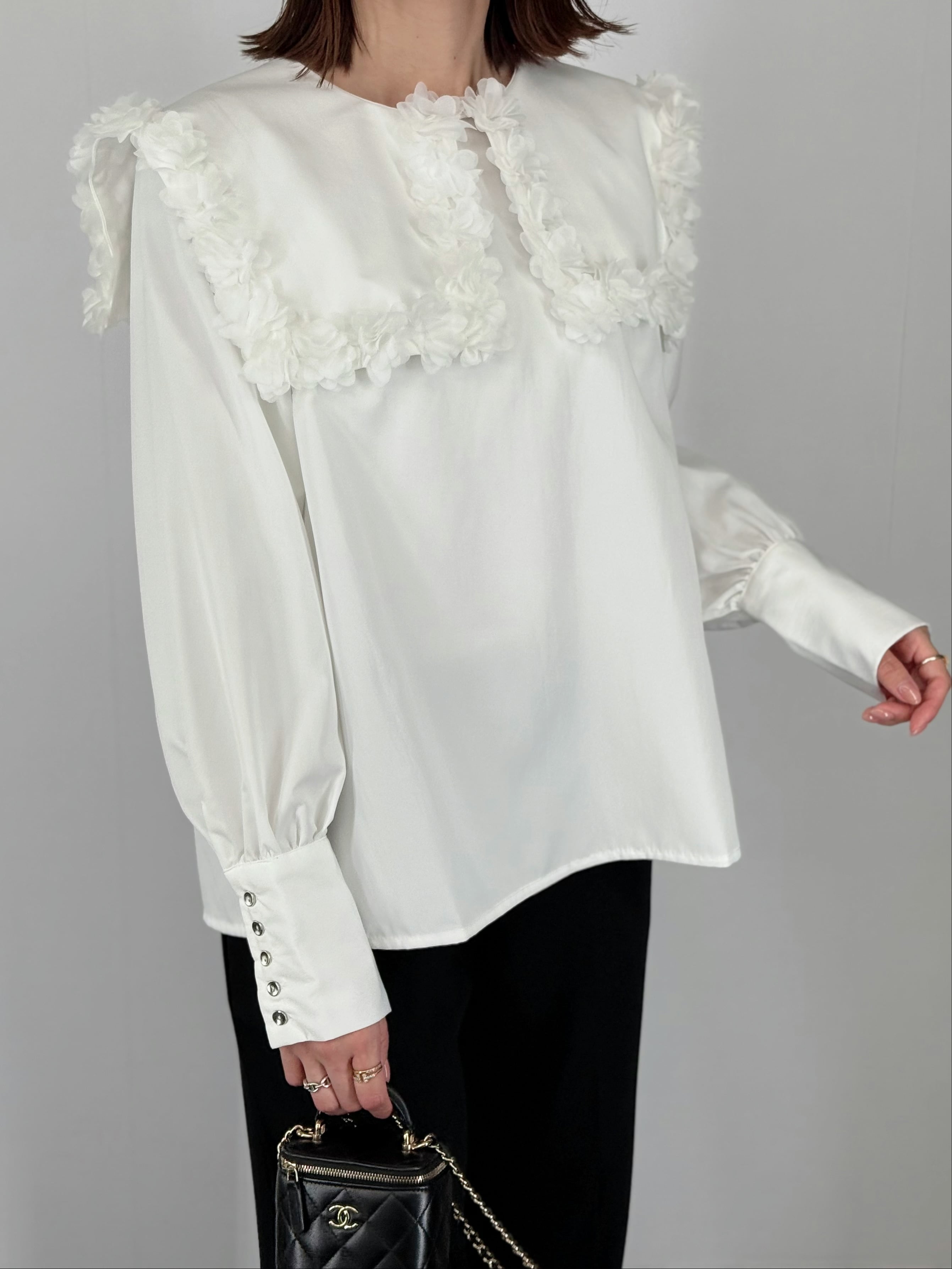 立体的なフラワーモチーフをあしらった、大きめのセーラーカラー魅力のブラウス。