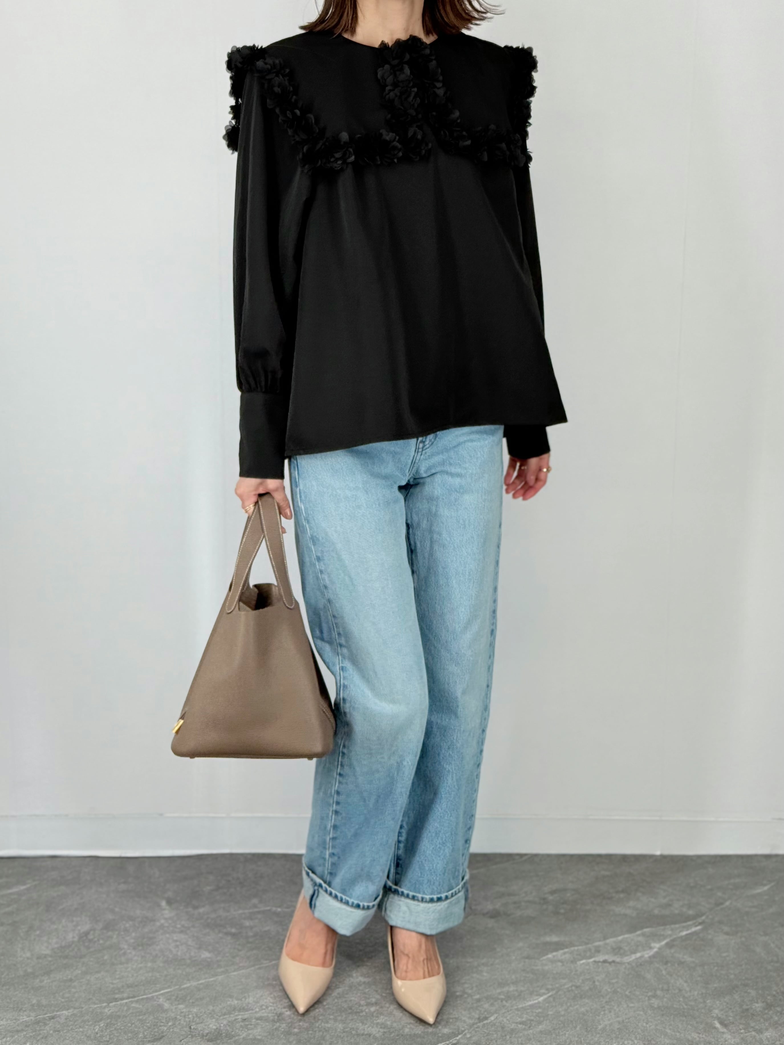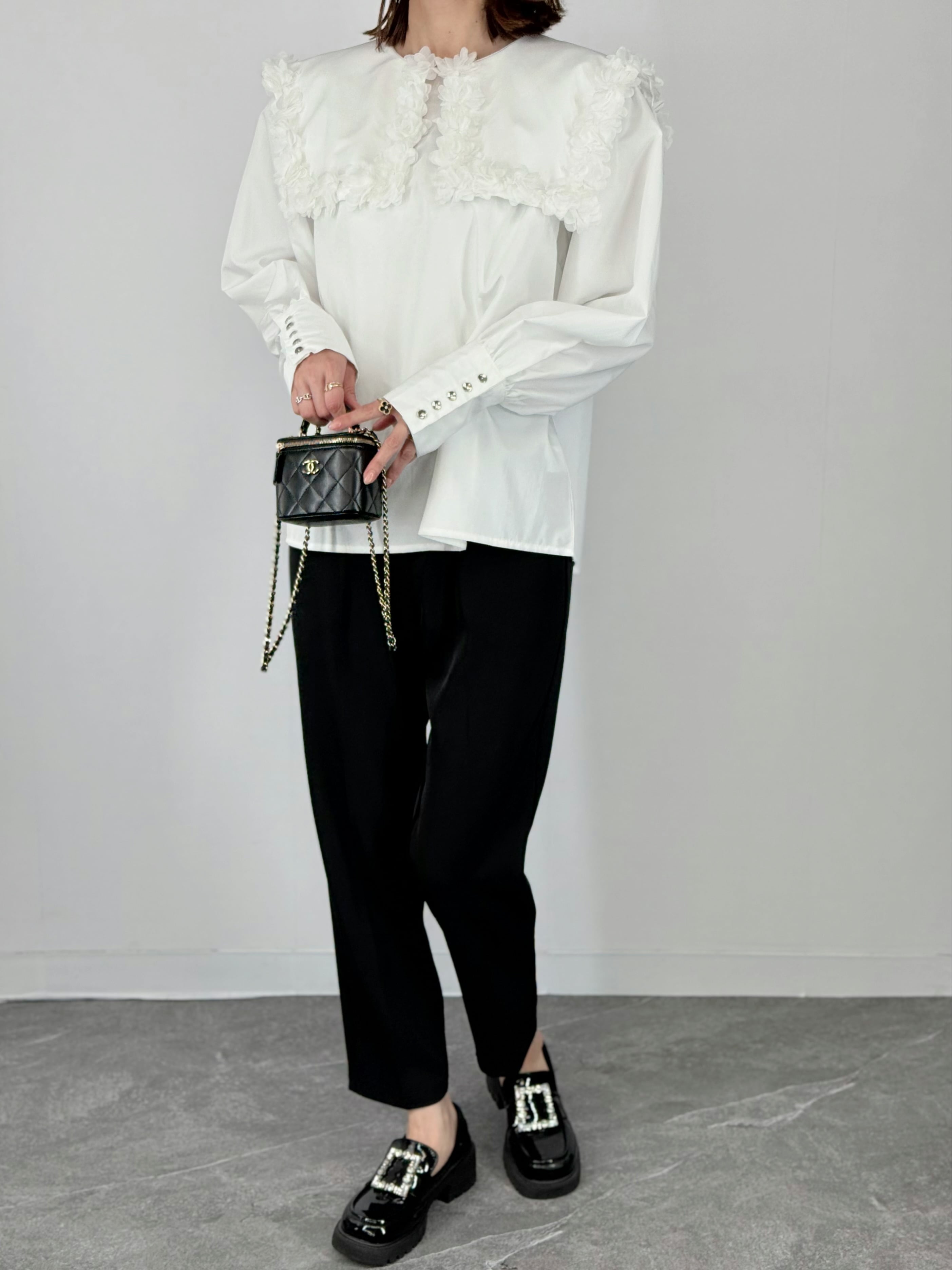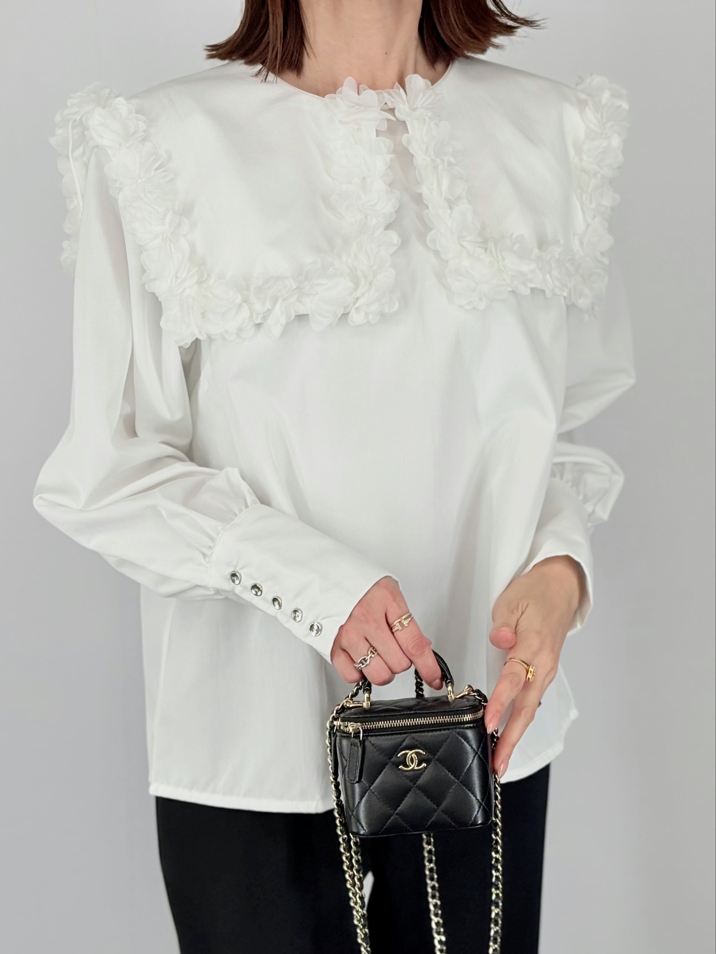 立体的なフラワーモチーフをあしらった、大きめのセーラーカラー魅力のブラウス。