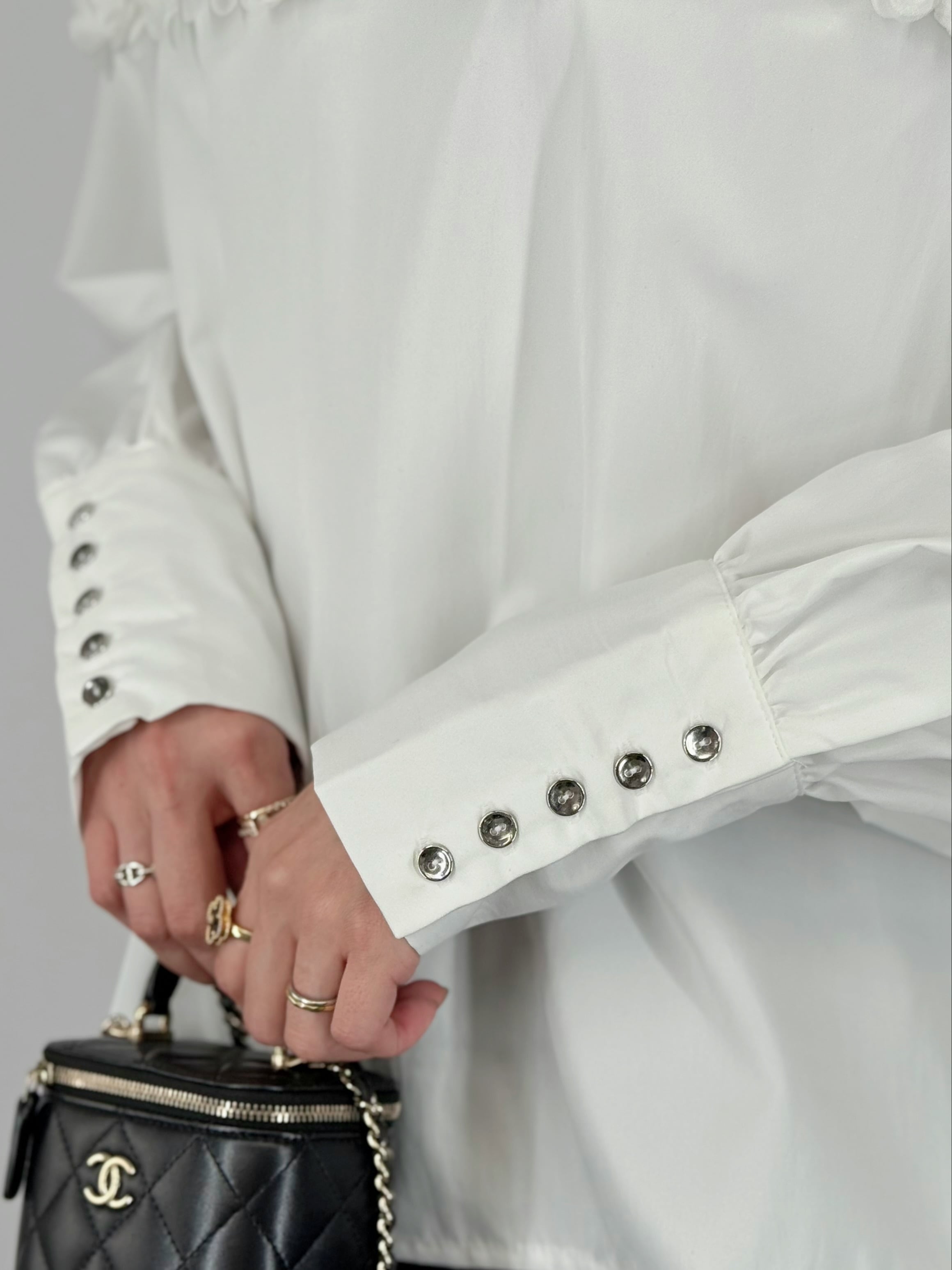 ふんわりとした袖と、袖口にあしらわれたゴールドボタンが、クラシックな雰囲気をプラス◎