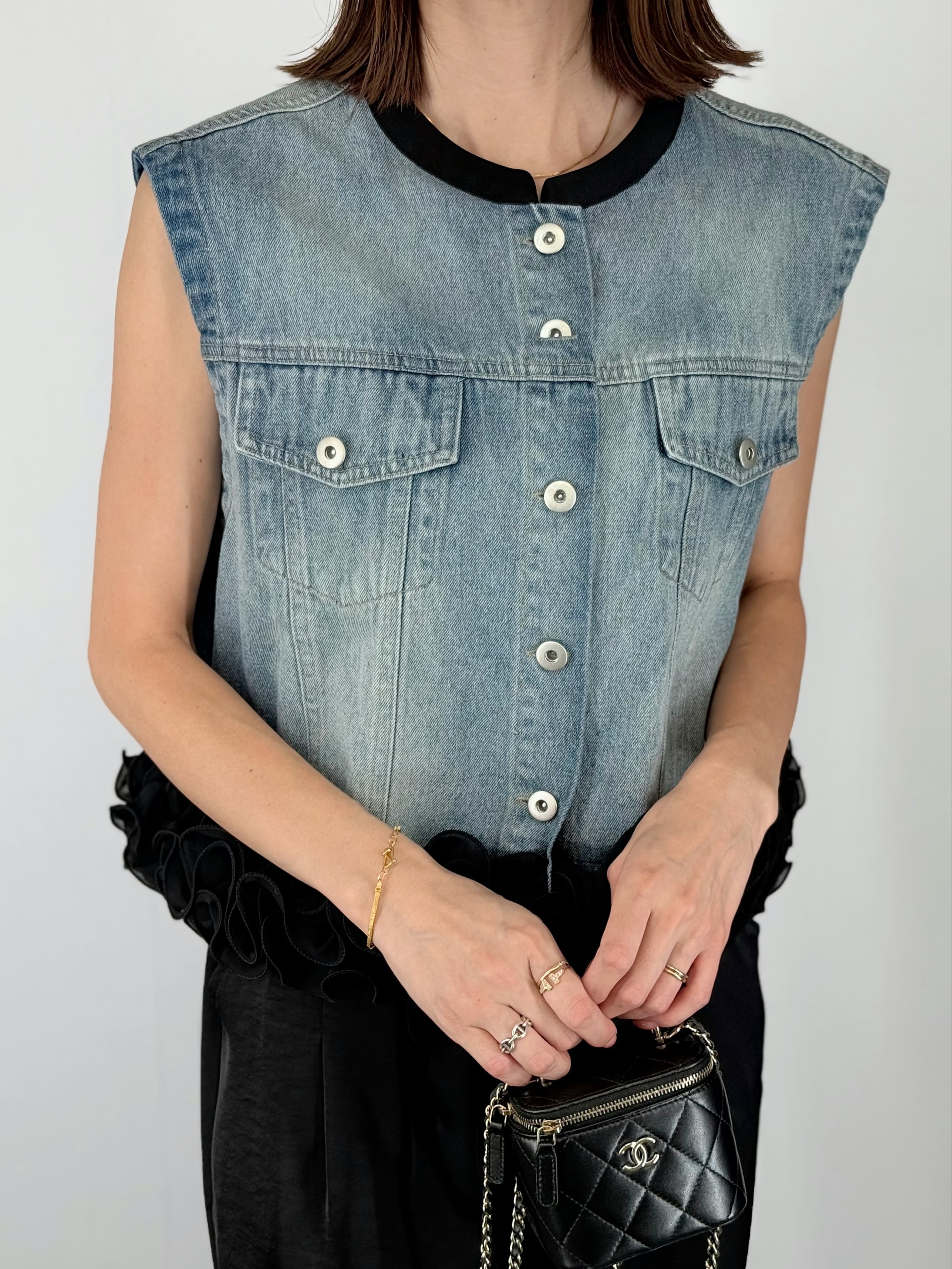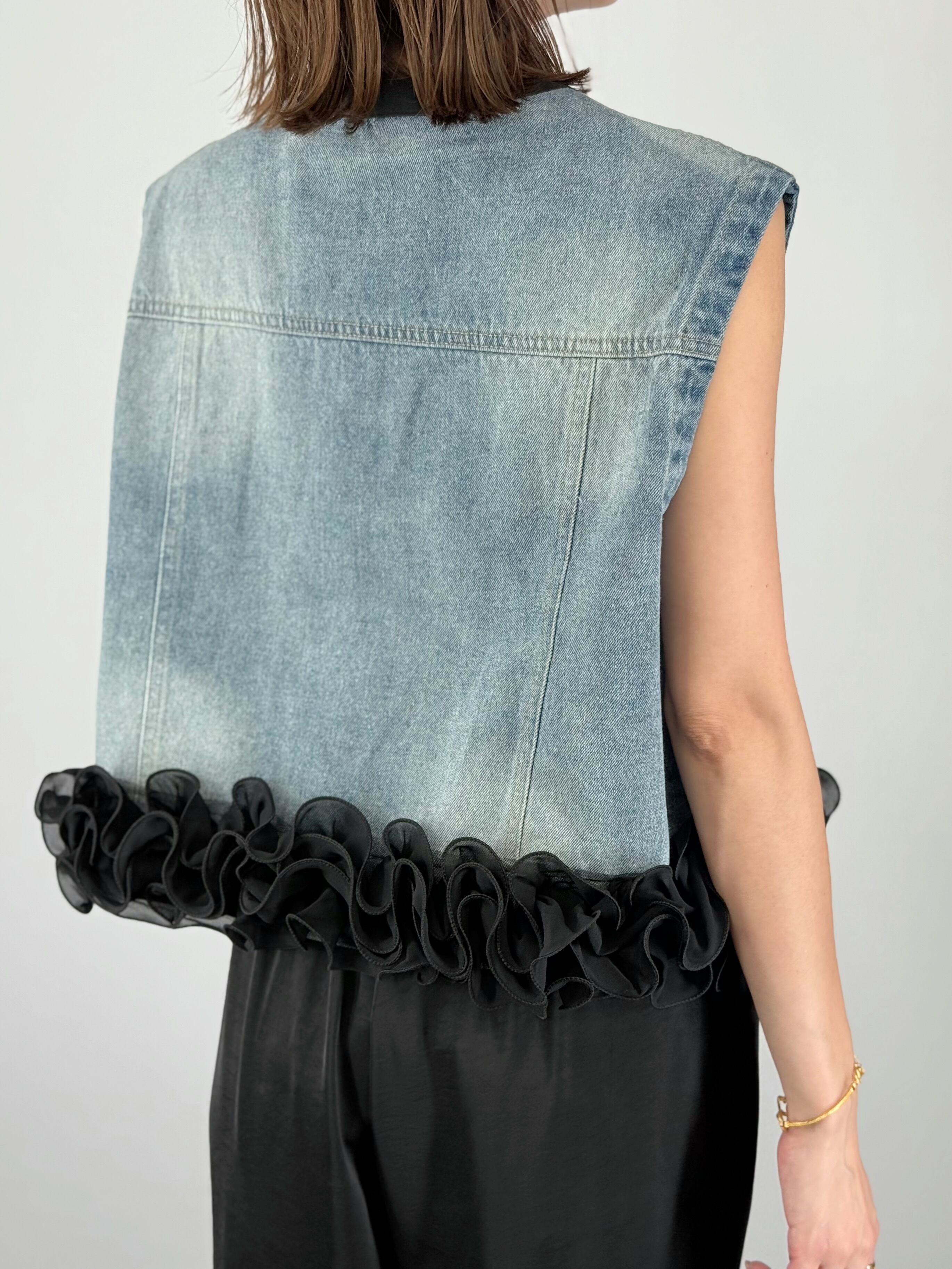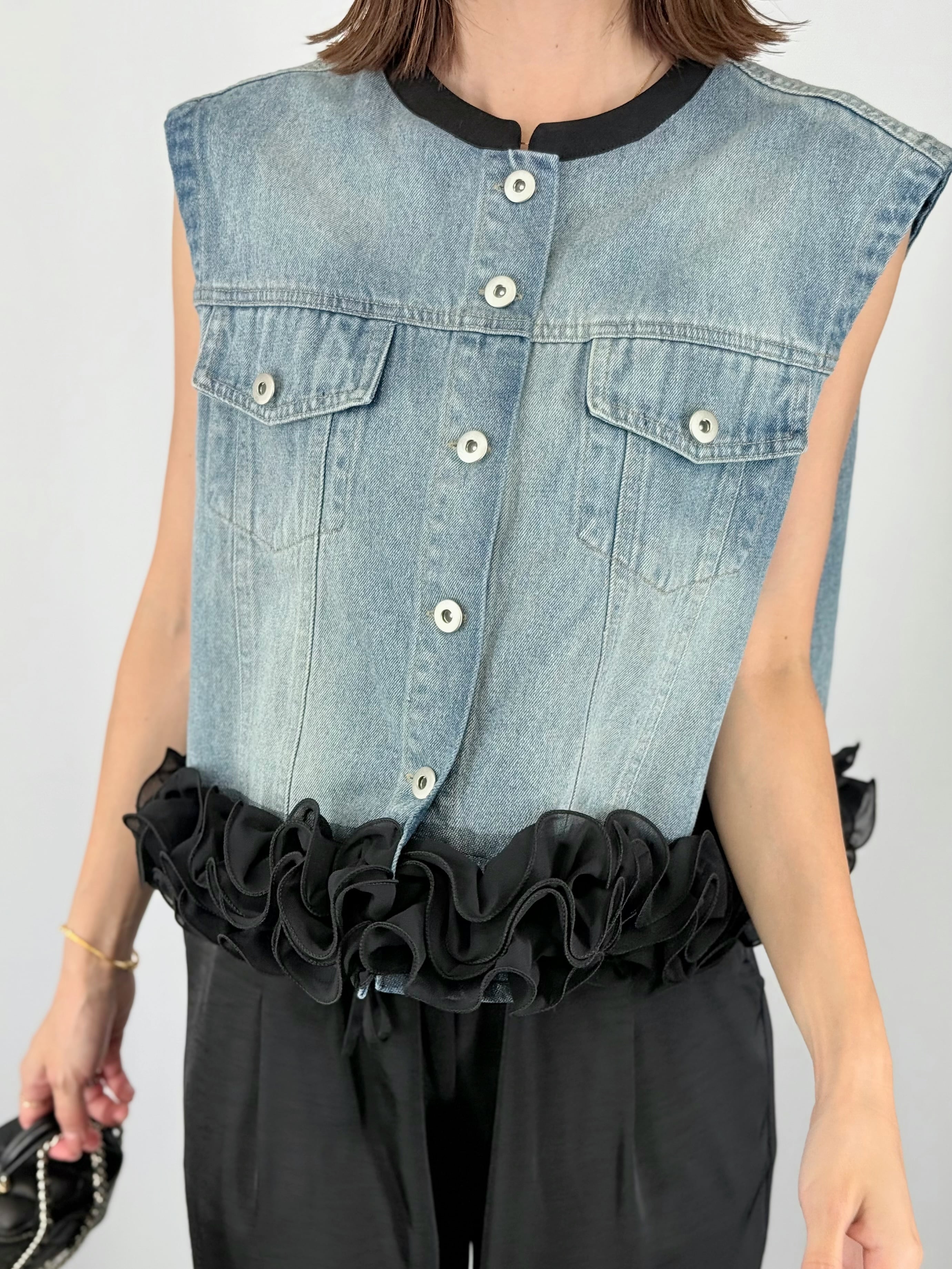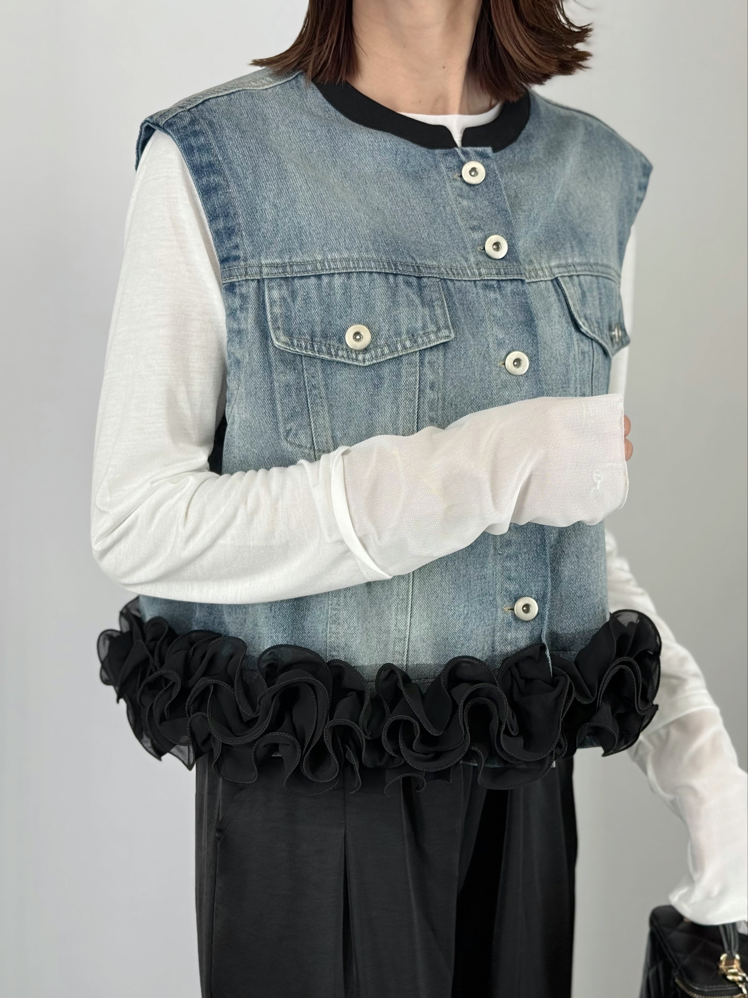裾に施された繊細なチュールフリルが、ハードなデニムに女性らしい甘さをプラス。
