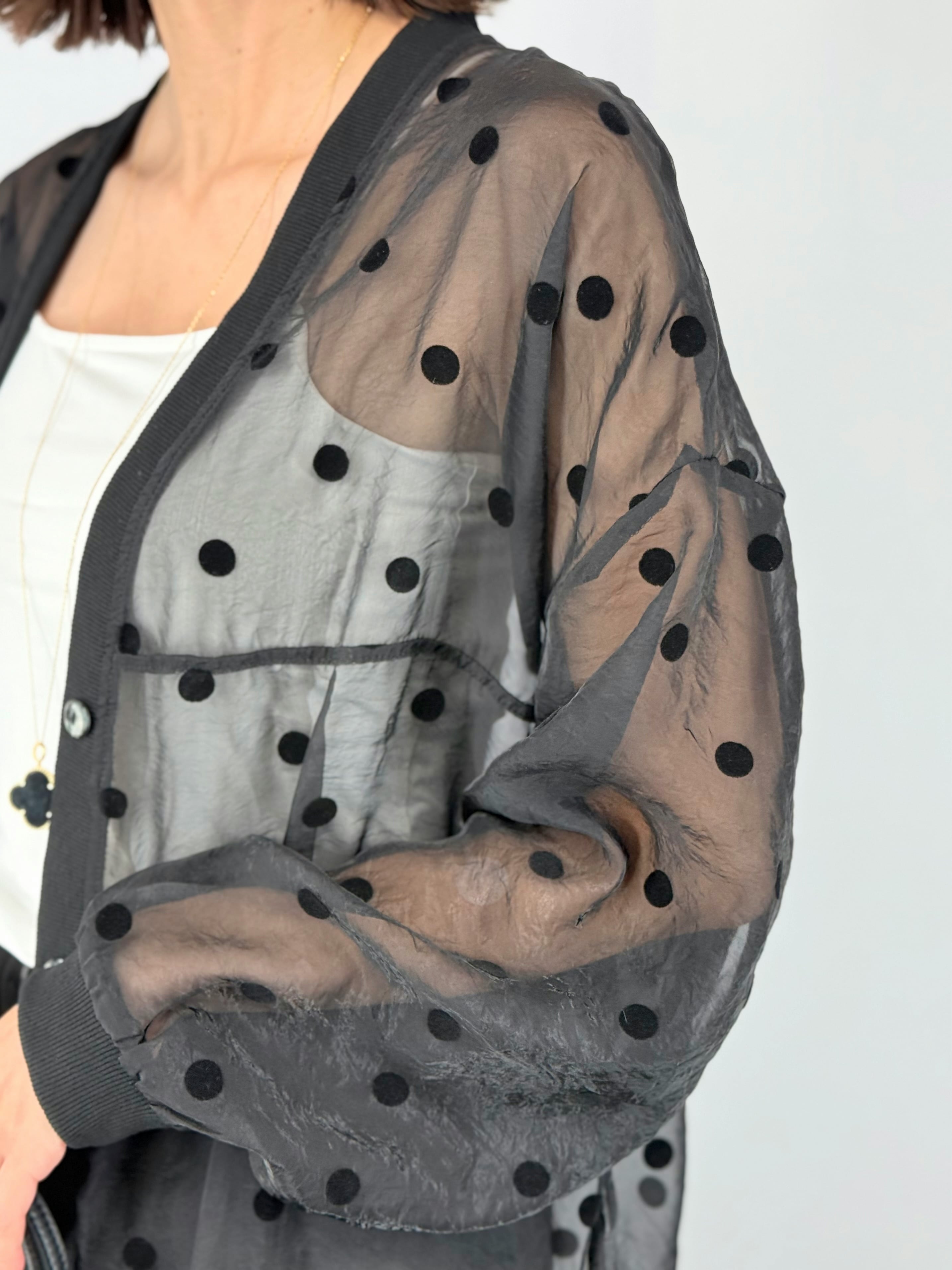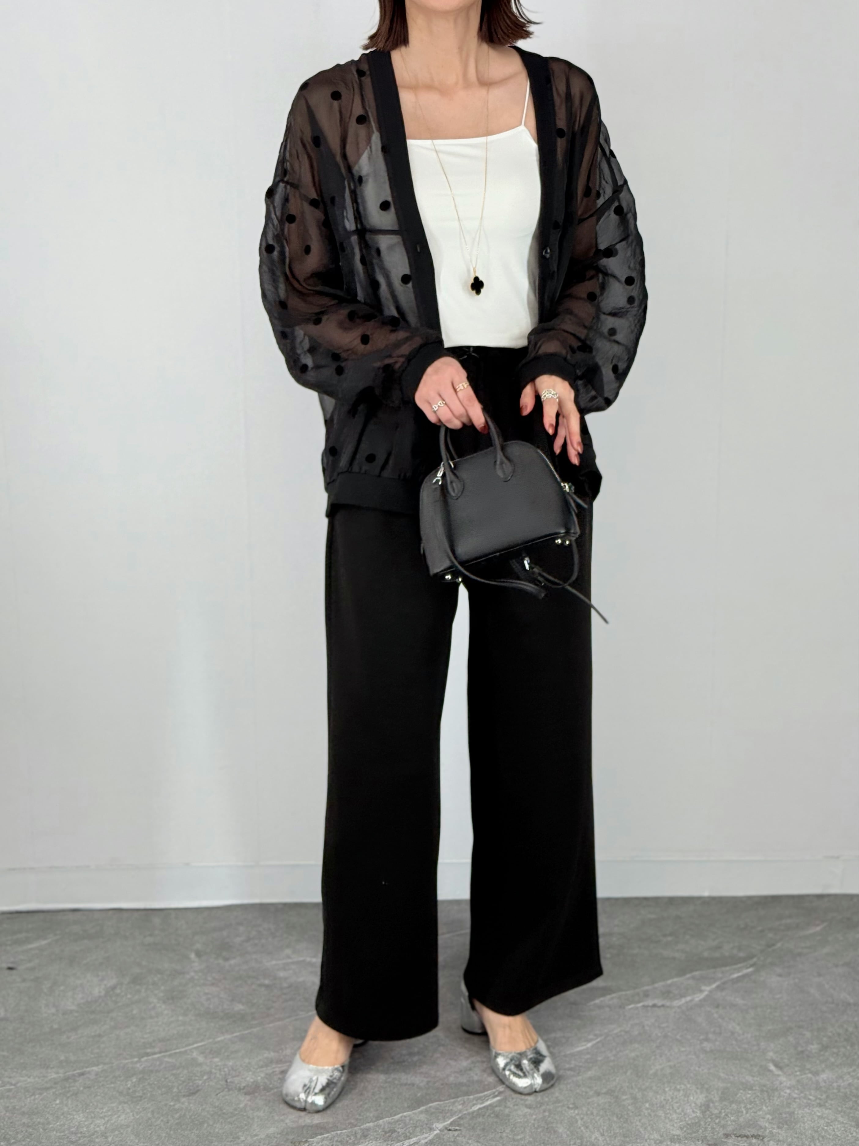 軽やかなシアー素材に、甘すぎないドット柄をあしらい、大人の上品な印象に。
