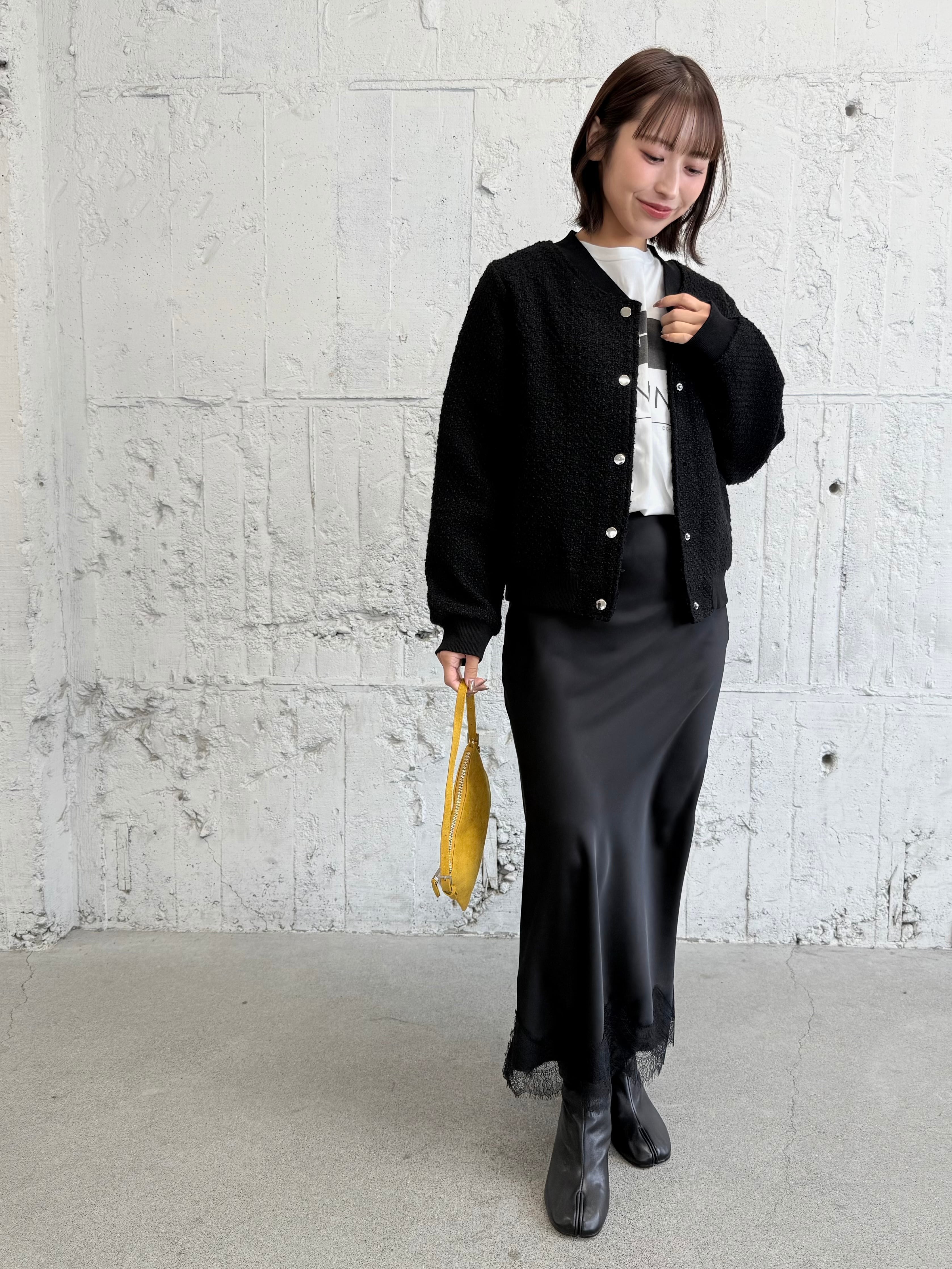 エレガントなツイードにカジュアルな要素をミックスすることで、甘すぎない大人のトレンドスタイルが完成します。