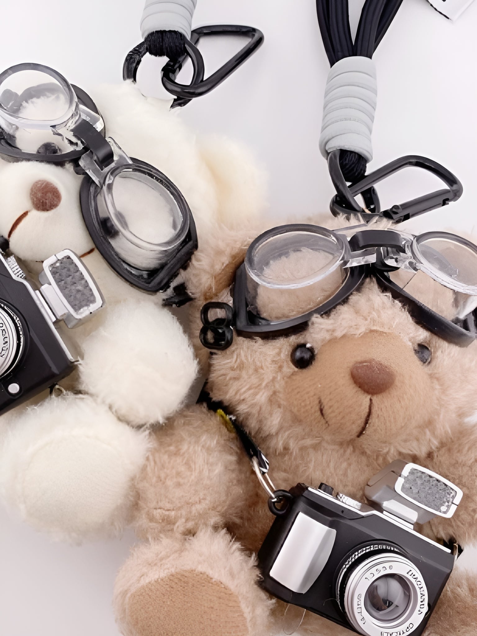 レトロなゴーグルとミニチュアカメラを身につけた、遊び心あふれるクマのぬいぐるみチャーム。