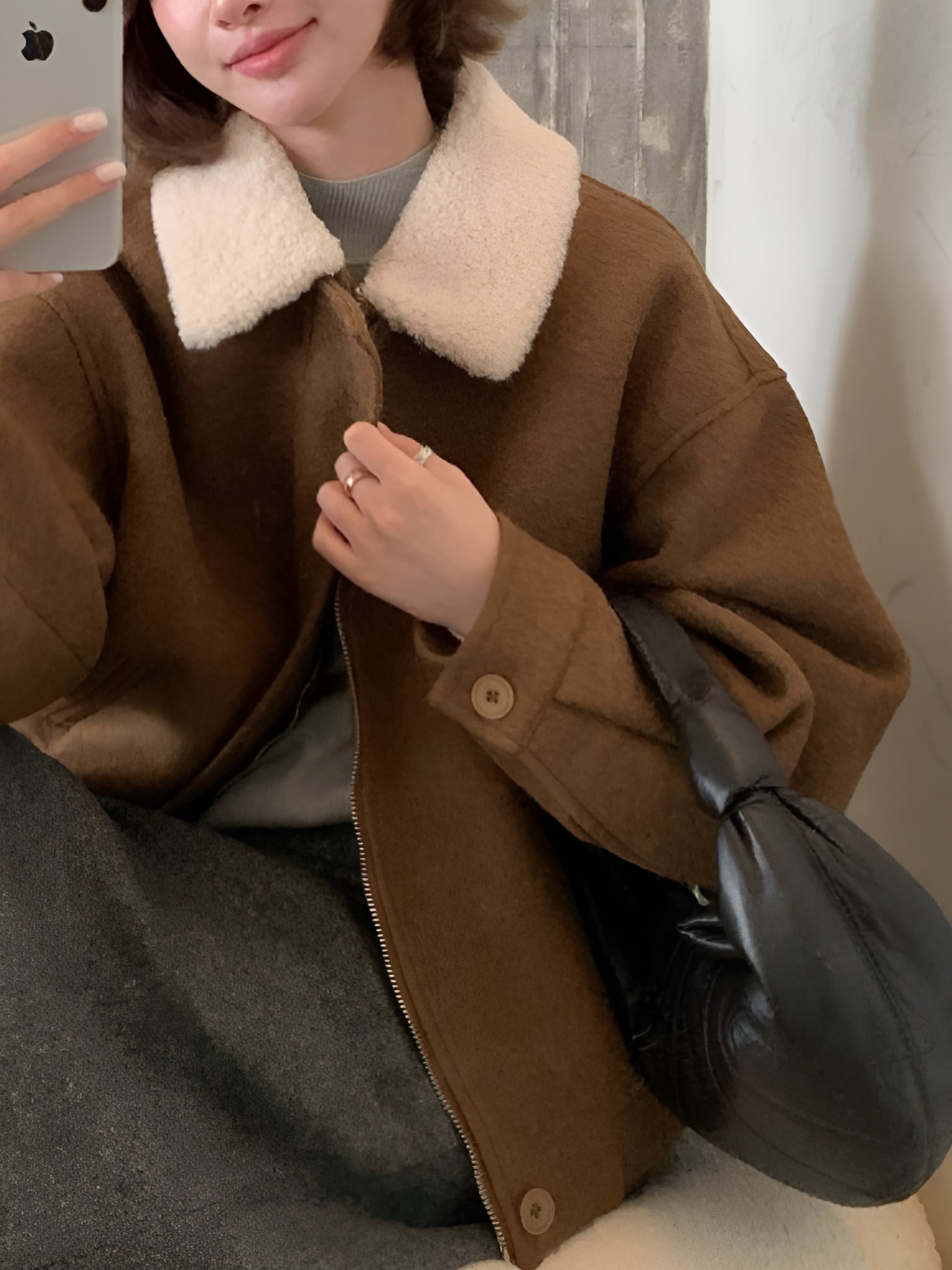 ボアとウール調生地の異素材ミックスが、大人の冬の装いにリズムと温もりを運びます。