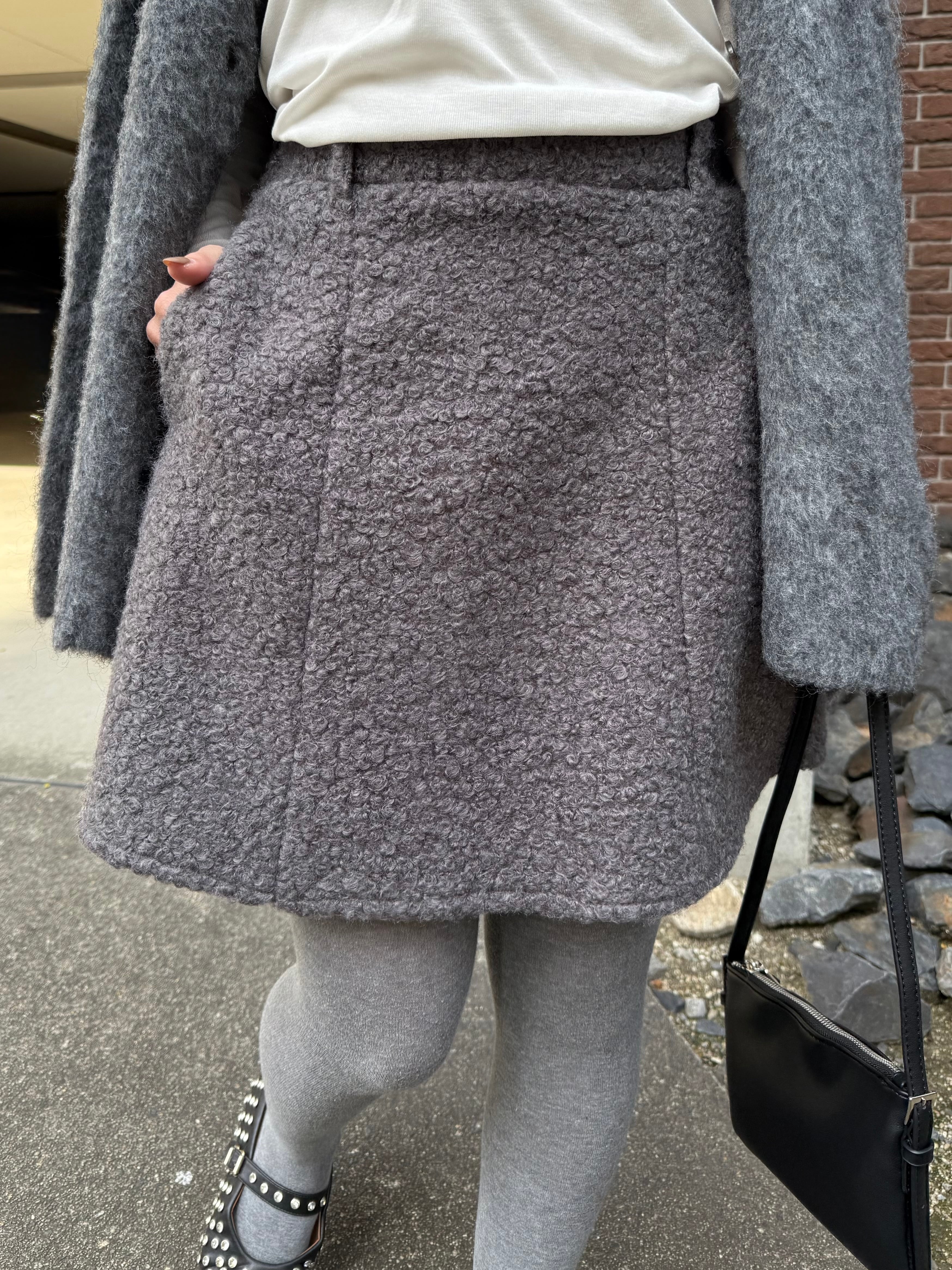 表情豊かなループツイードがクラス感を演出し、カジュアルなミニ丈をシックに格上げします。