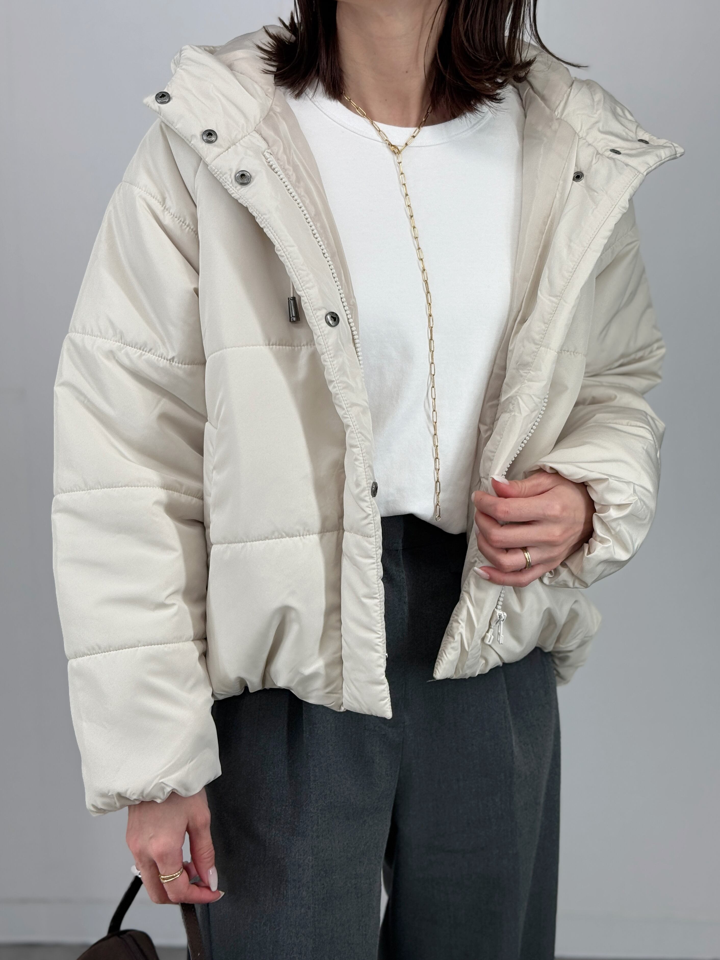 カジュアルになりがちな中綿ジャケットを、マットな質感とコンパクトなシルエットで、大人の女性にふさわしい一着に。