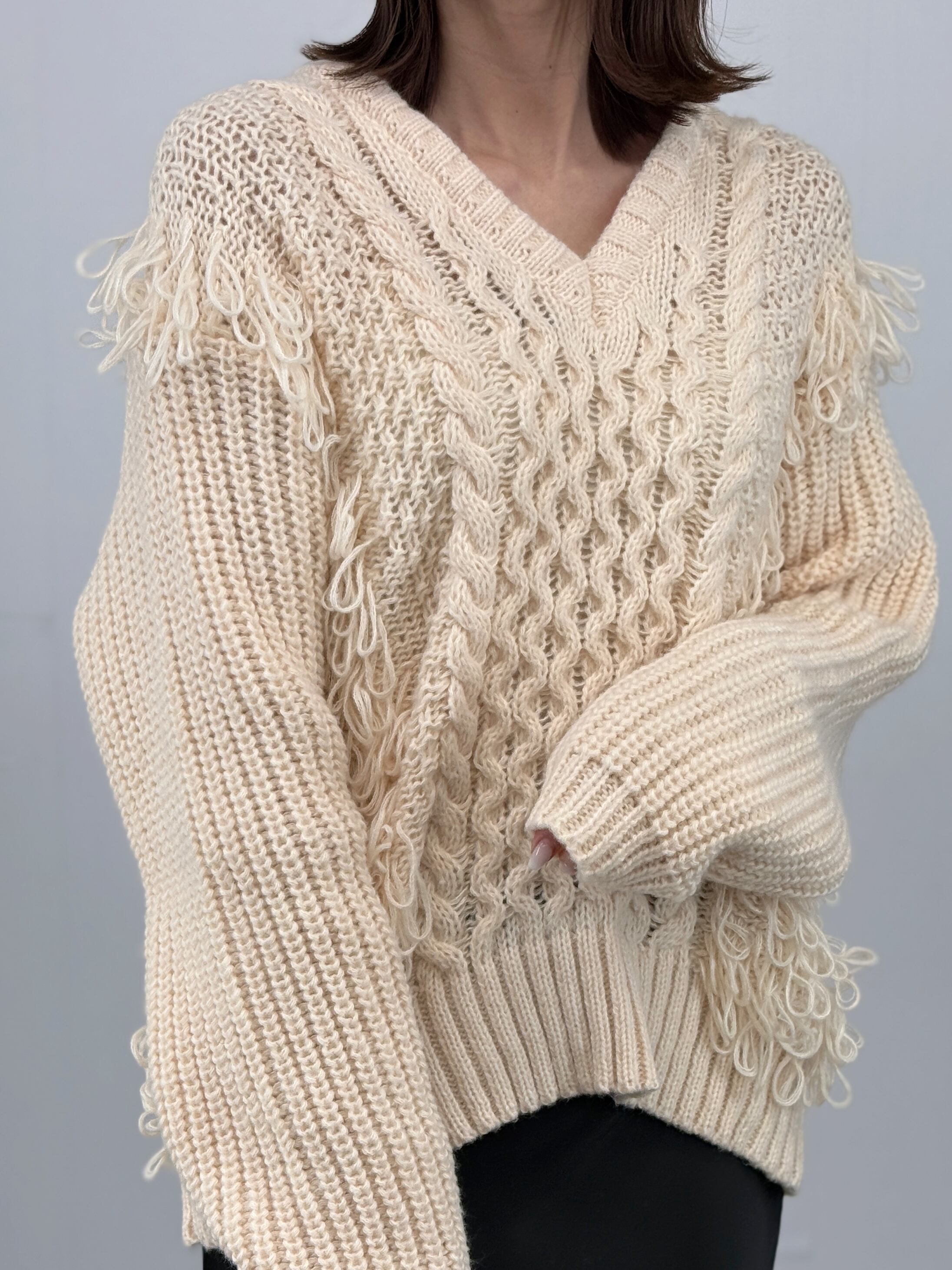 立体的なケーブル編みと、裾や袖口に施された贅沢なフリンジが、大人の遊び心と華やかさを演出します。