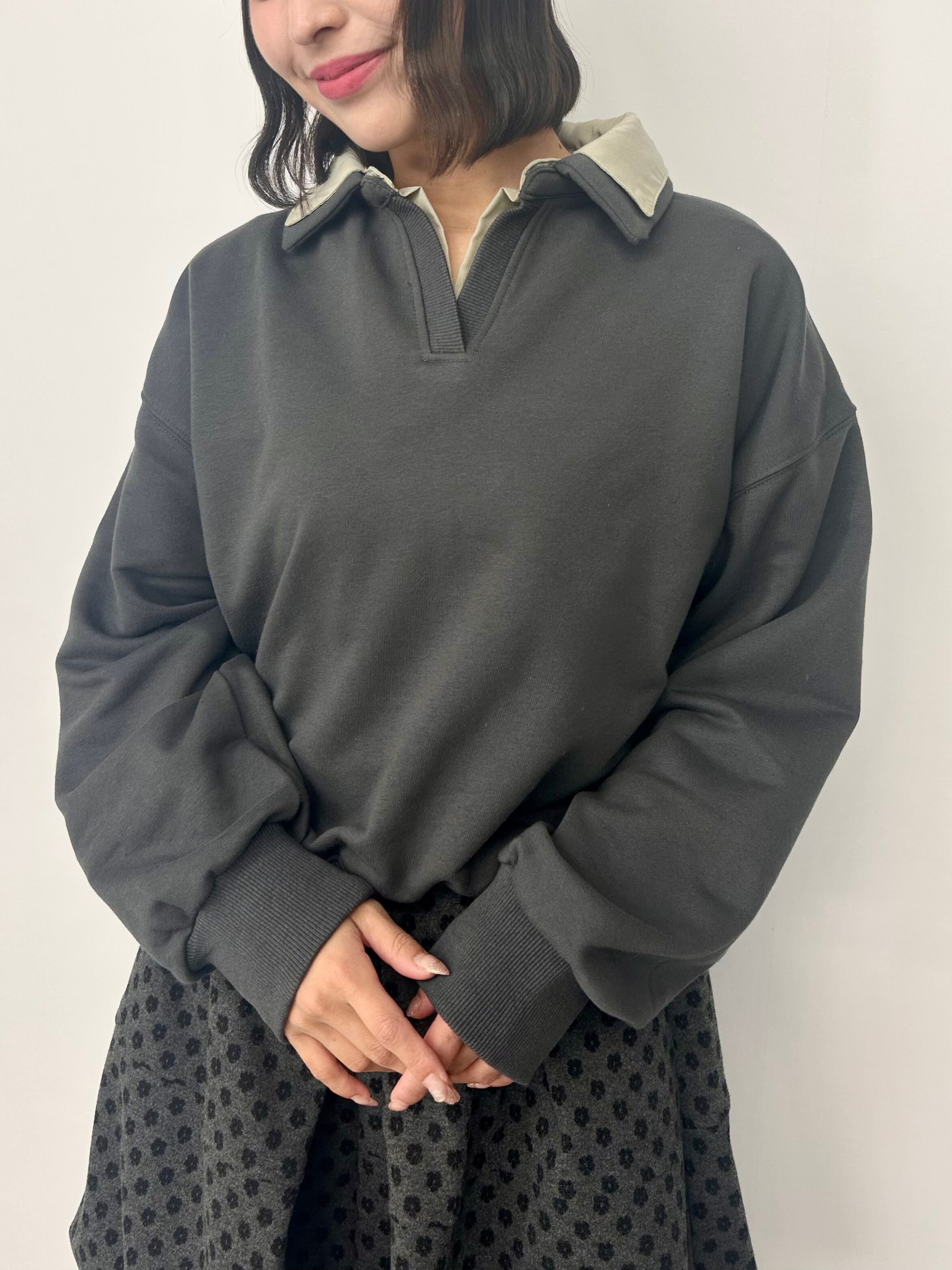 首元のスキッパーデザインと、裾から覗くレイヤード風の白地がこなれ感を演出。