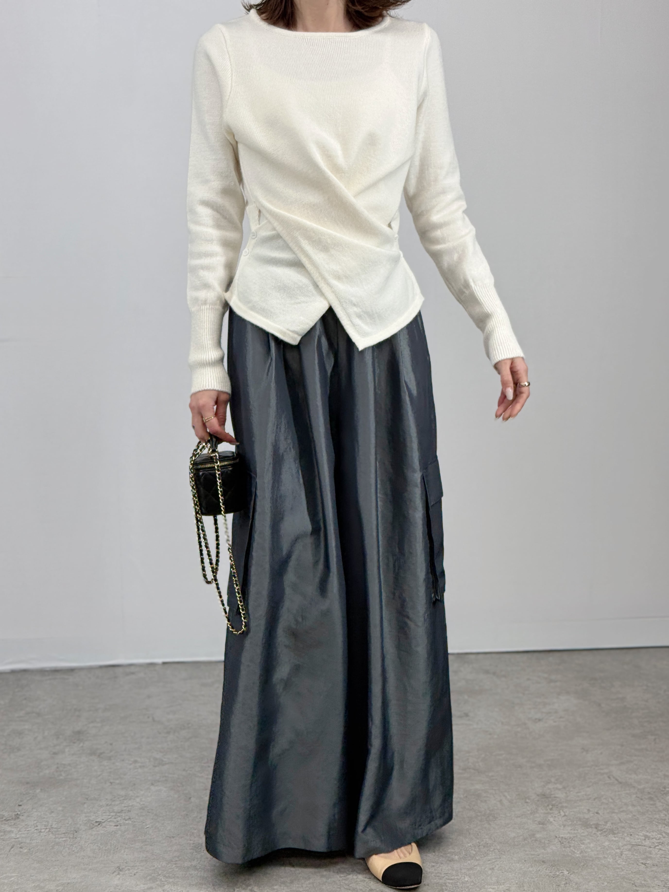 裾をインせず着るだけでウエスト位置を高く見せ、驚きのスタイルアップを叶えます。