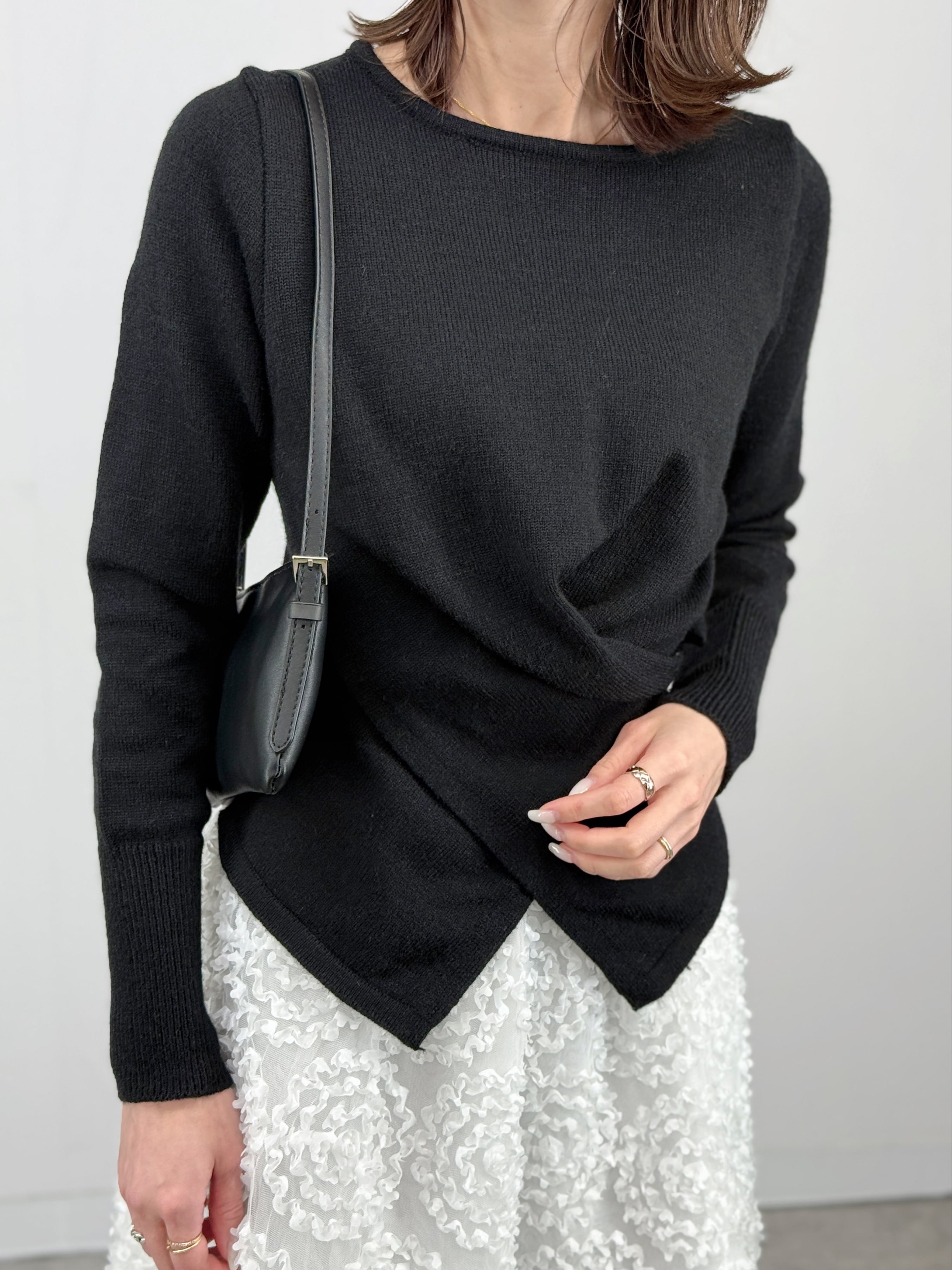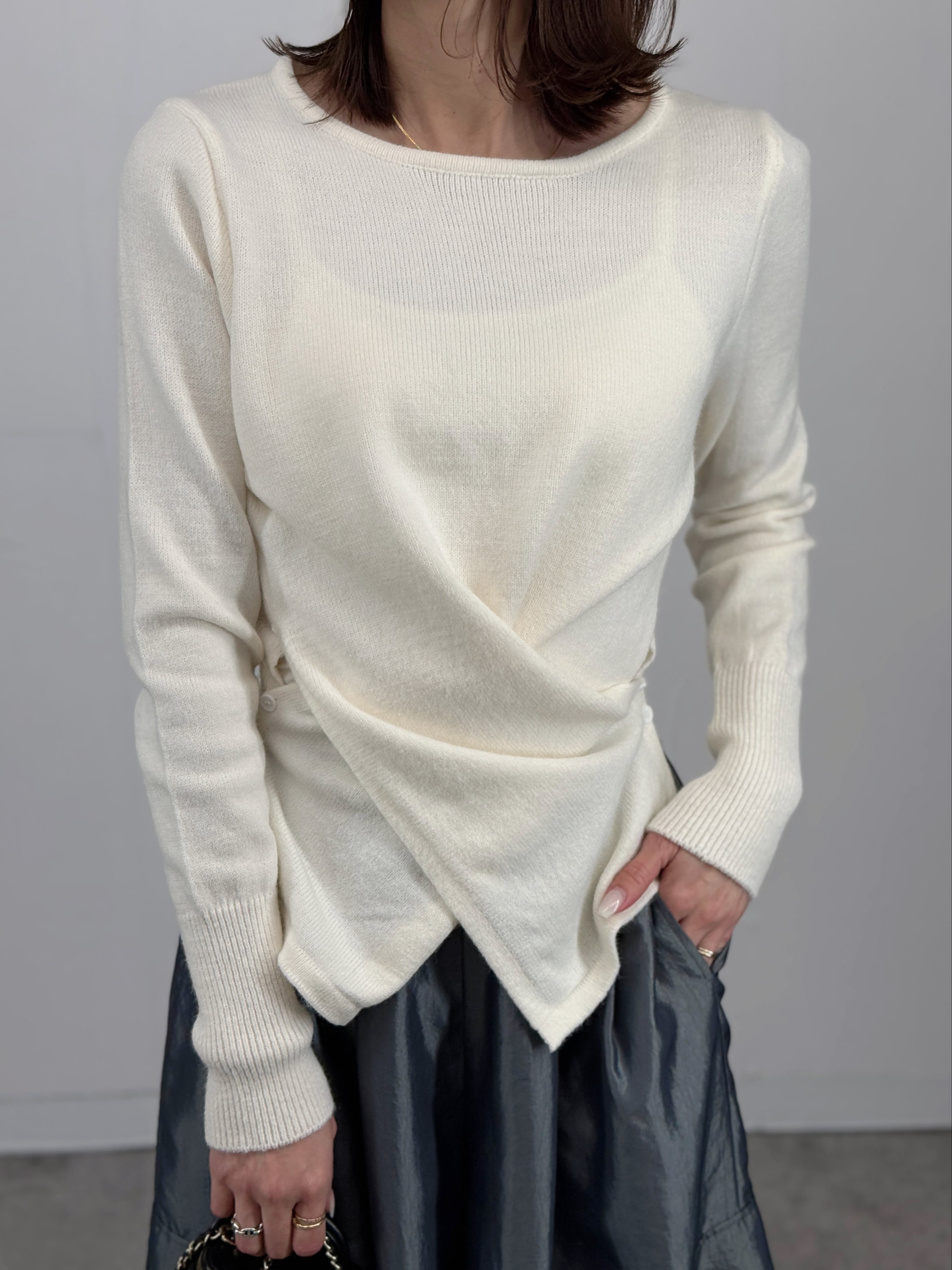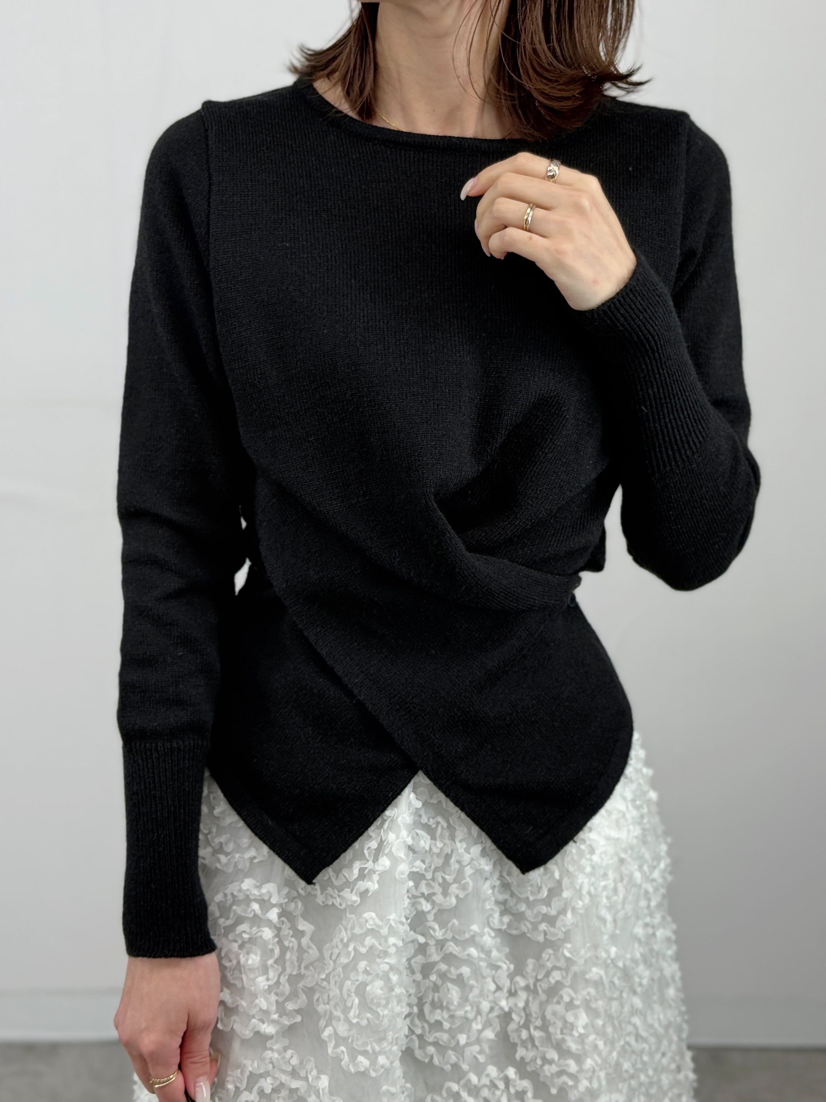 フロントのツイストデザインが目を惹くニット。