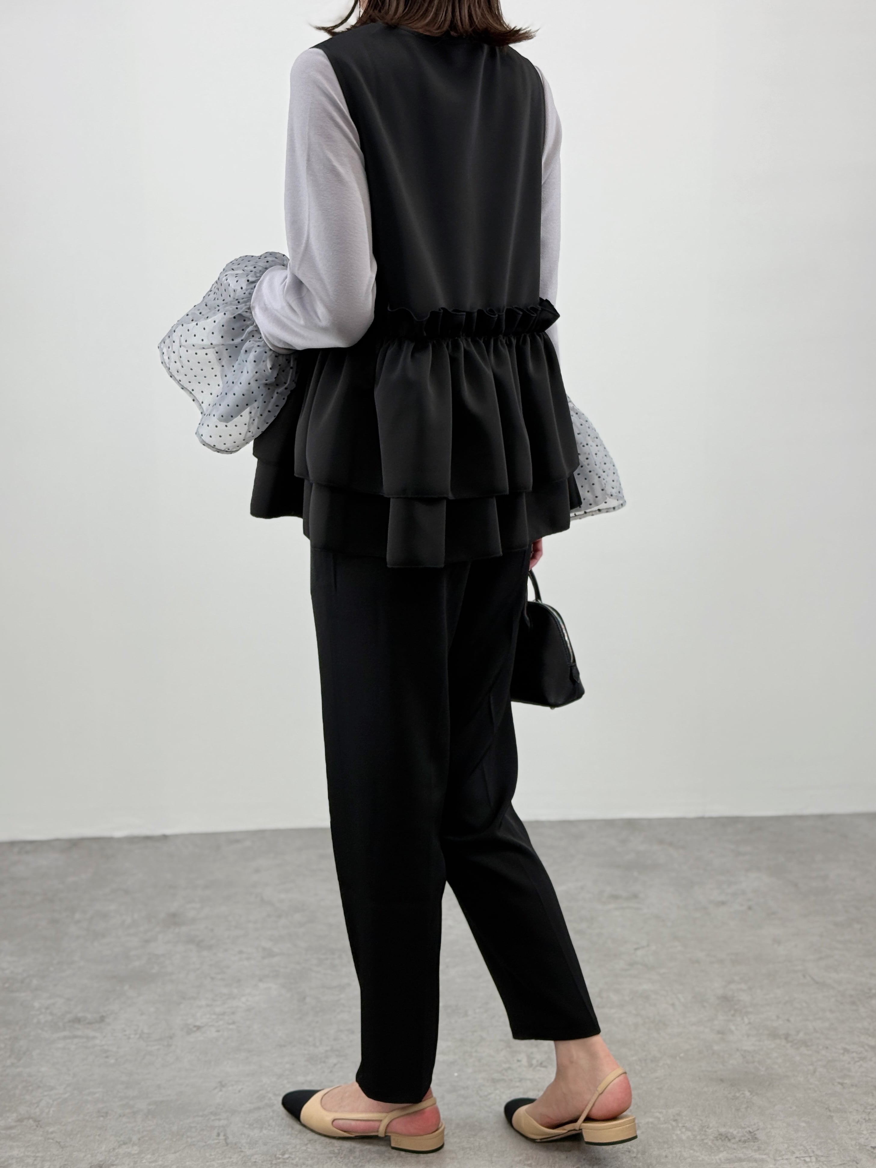 フロントに散りばめられた上品なパールと、ふんわり広がるペプラムシルエットが女性らしさを引き立てる一枚。