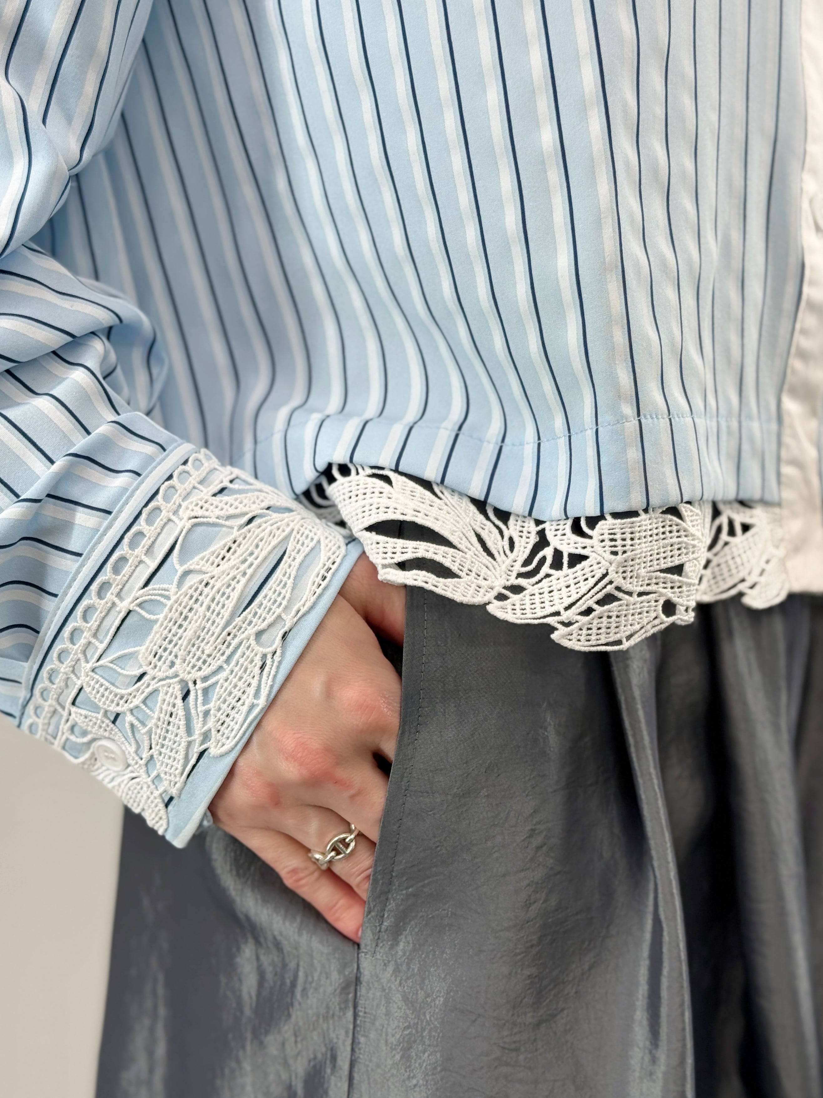 清涼感のあるストライプ柄に、繊細なカットワークレースを贅沢にあしらった一枚。