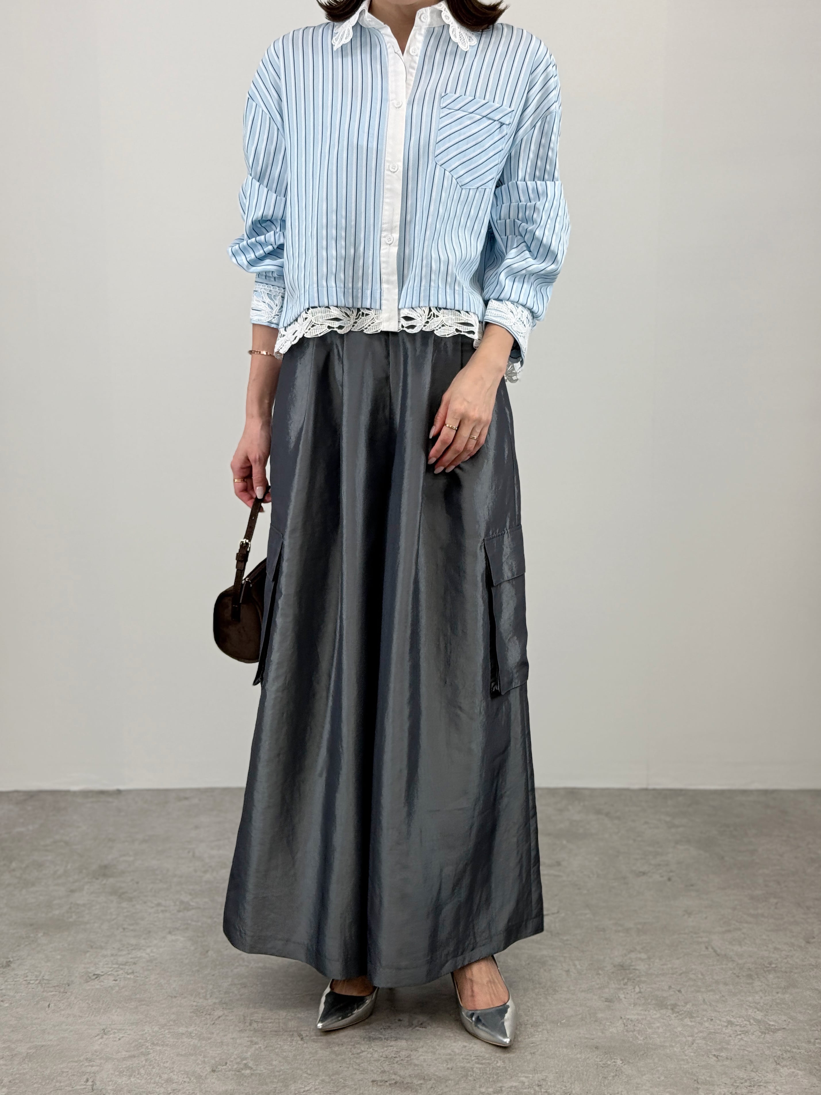 顔まわりを華やかに見せるレース襟と、袖口・裾からのぞく透け感が、程よい甘さと抜け感を演出します。