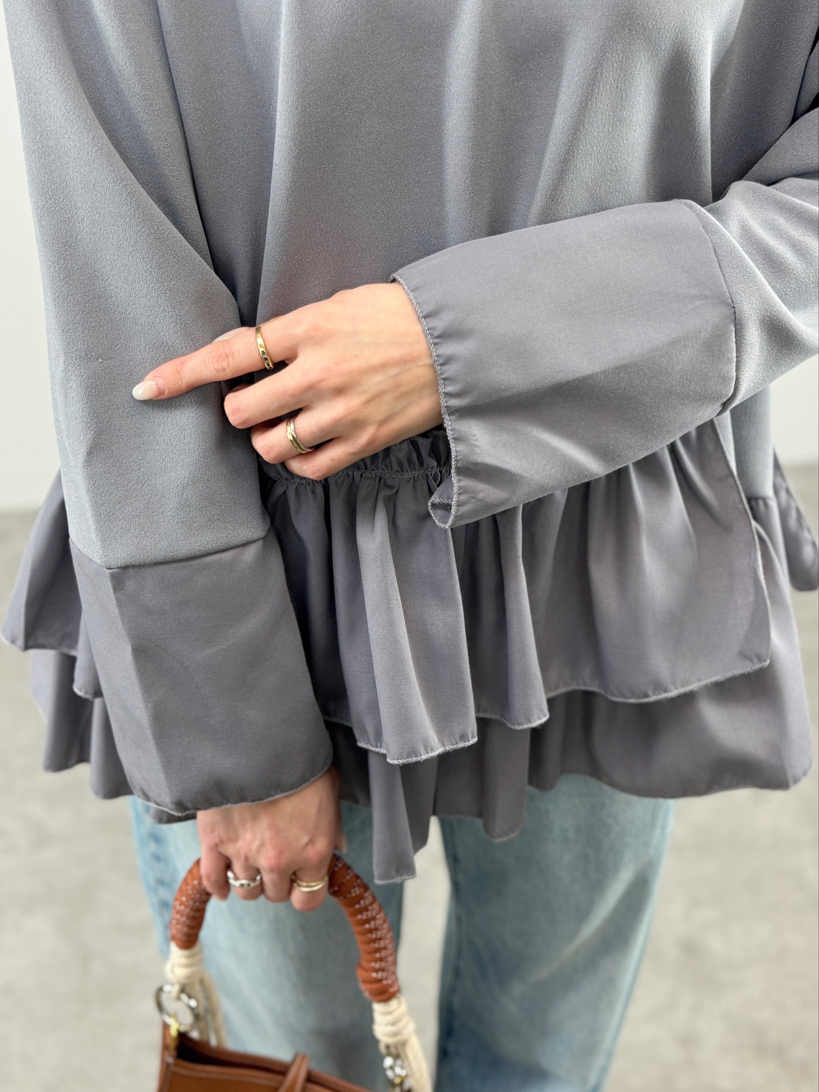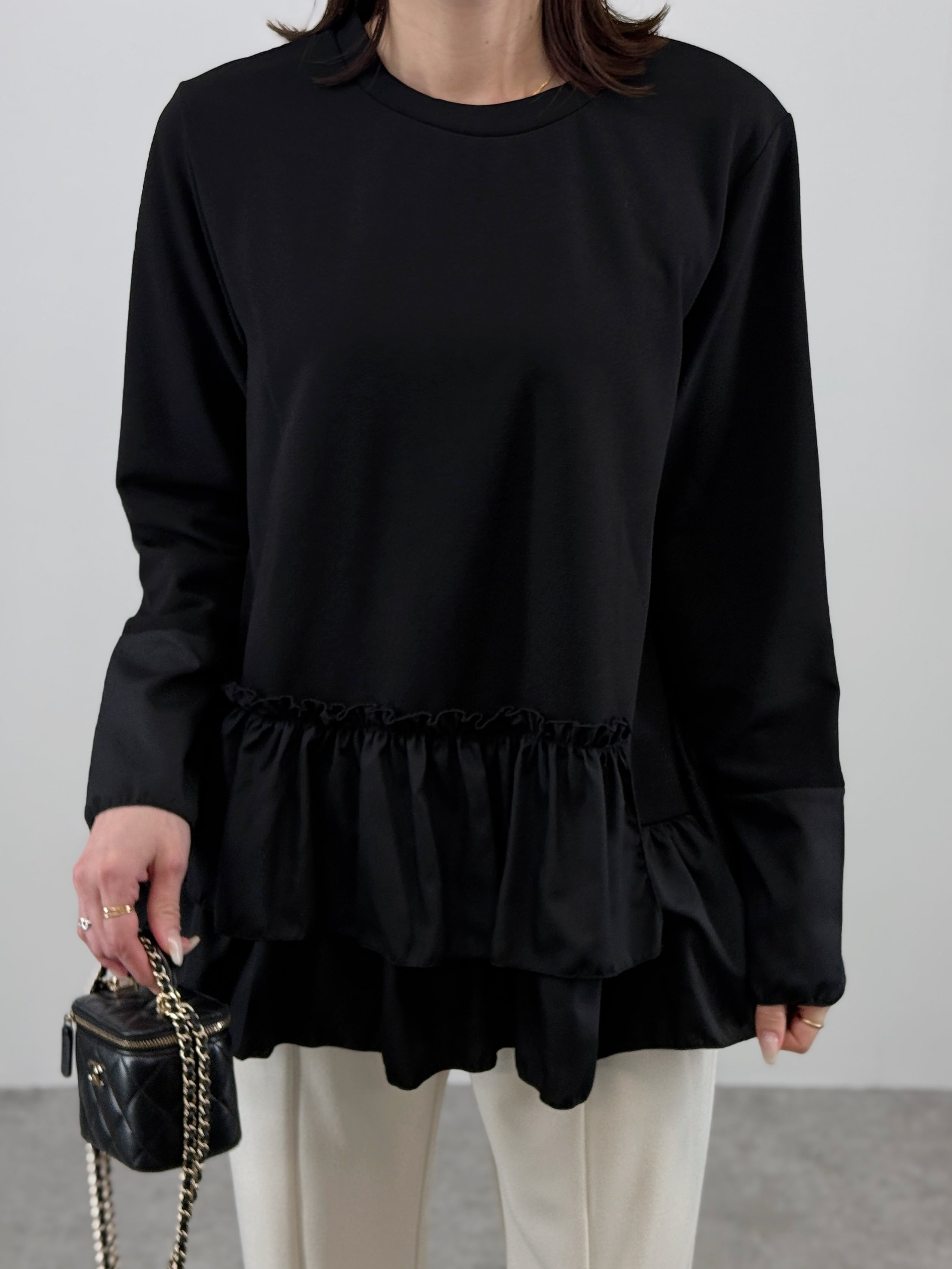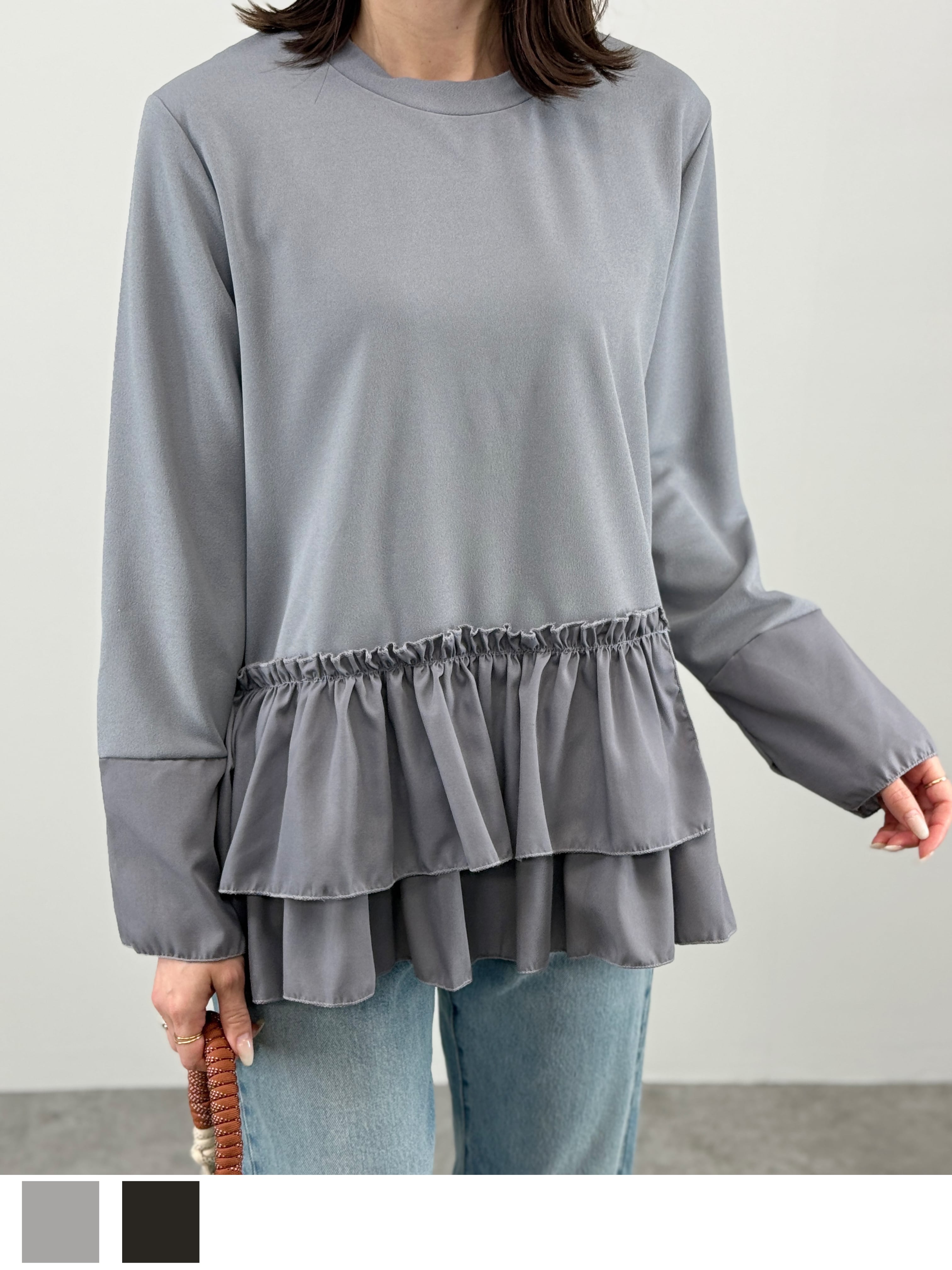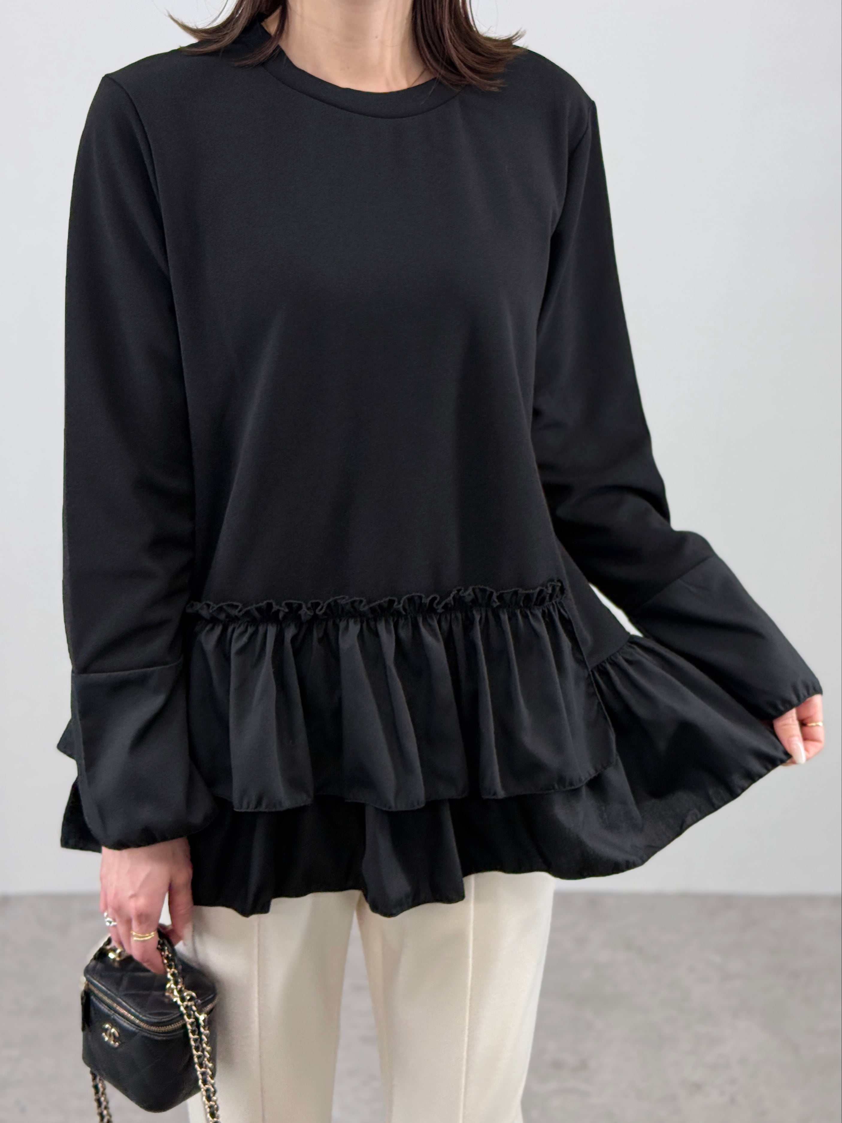 裾に施された二段のボリュームフリルが目を引く、華やかなペプラムトップス。