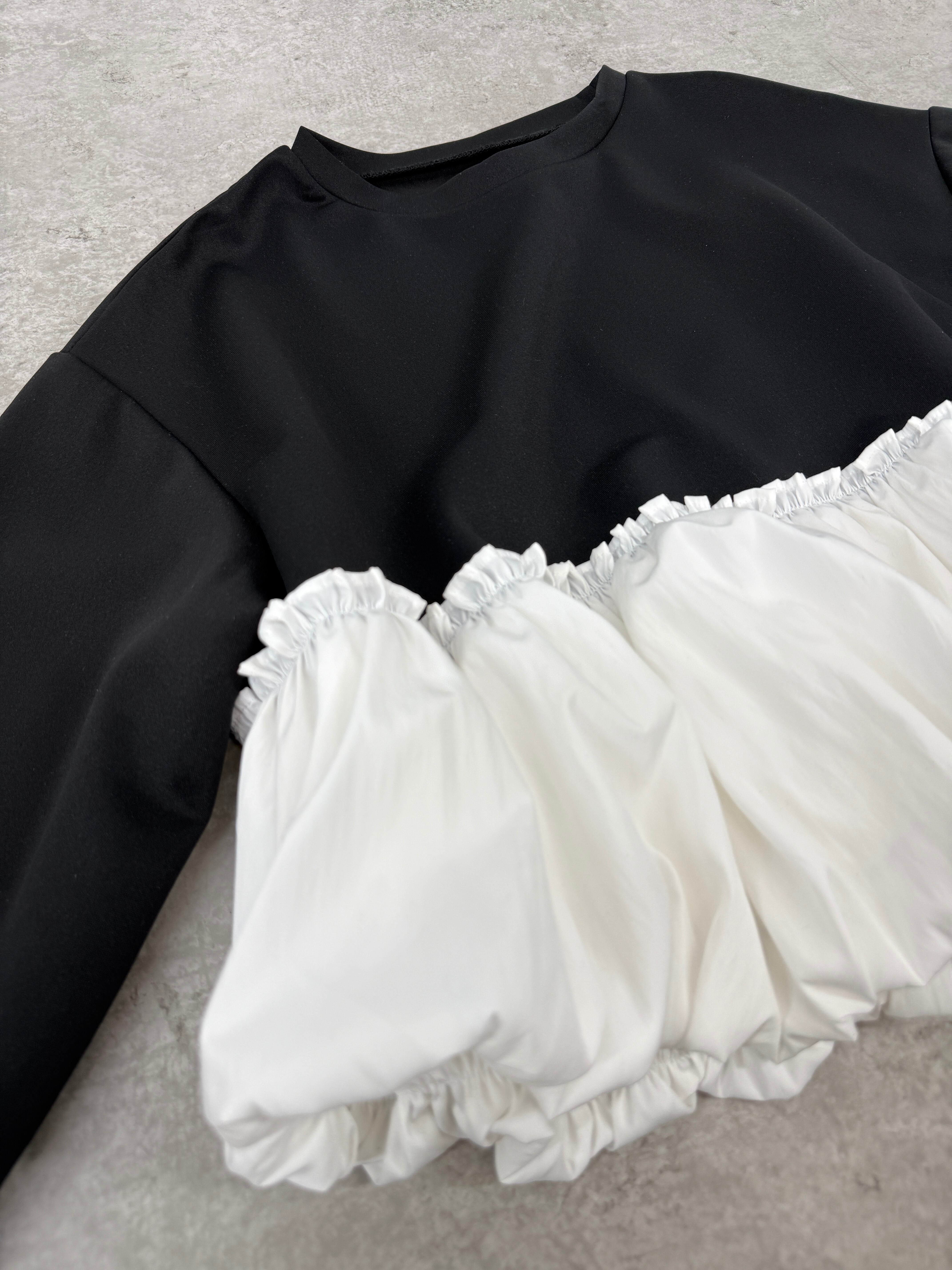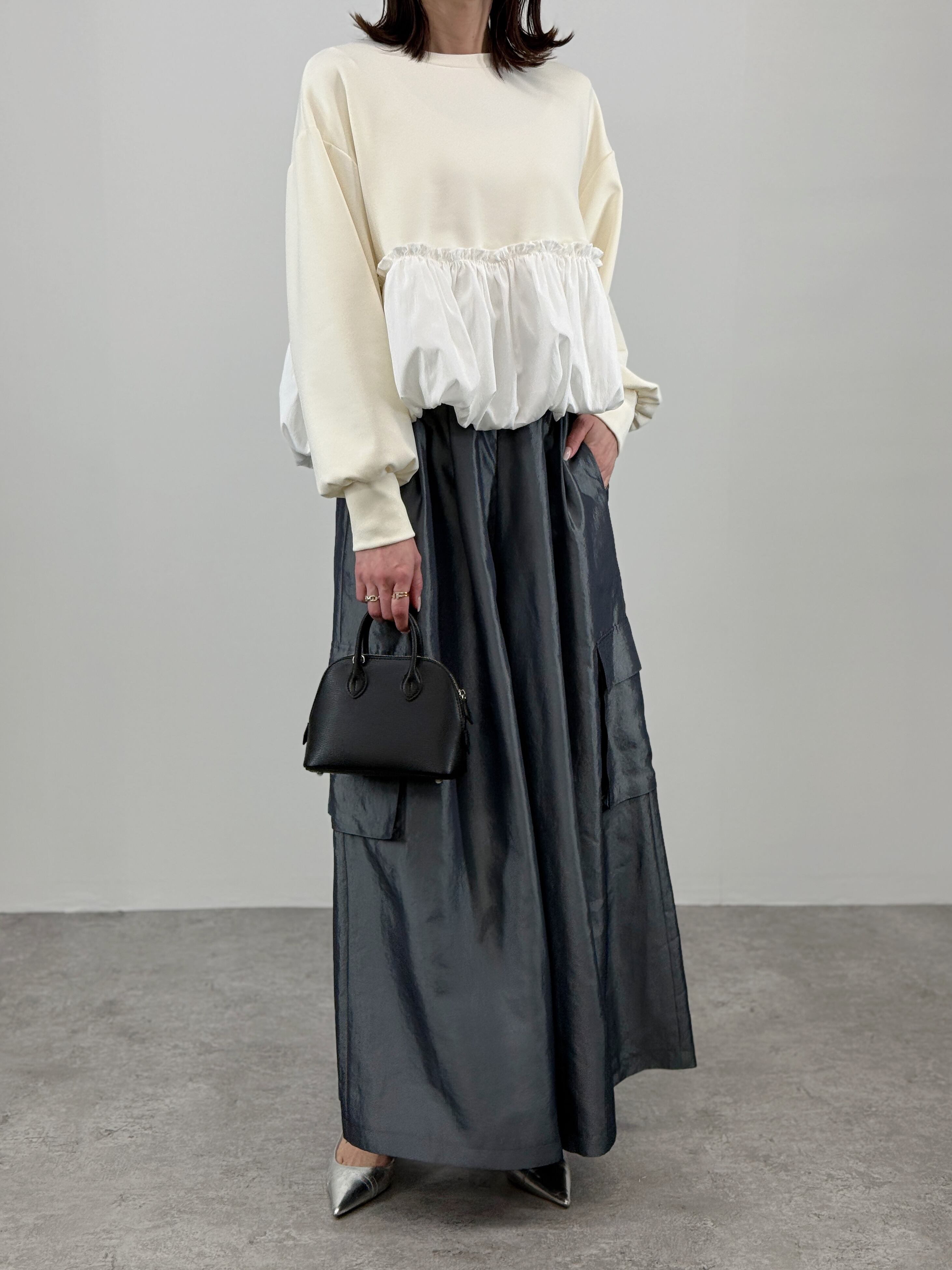 ハリ感のあるボンディング素材と、ふんわりとした異素材のバルーンギャザーを組み合わせたトップス。