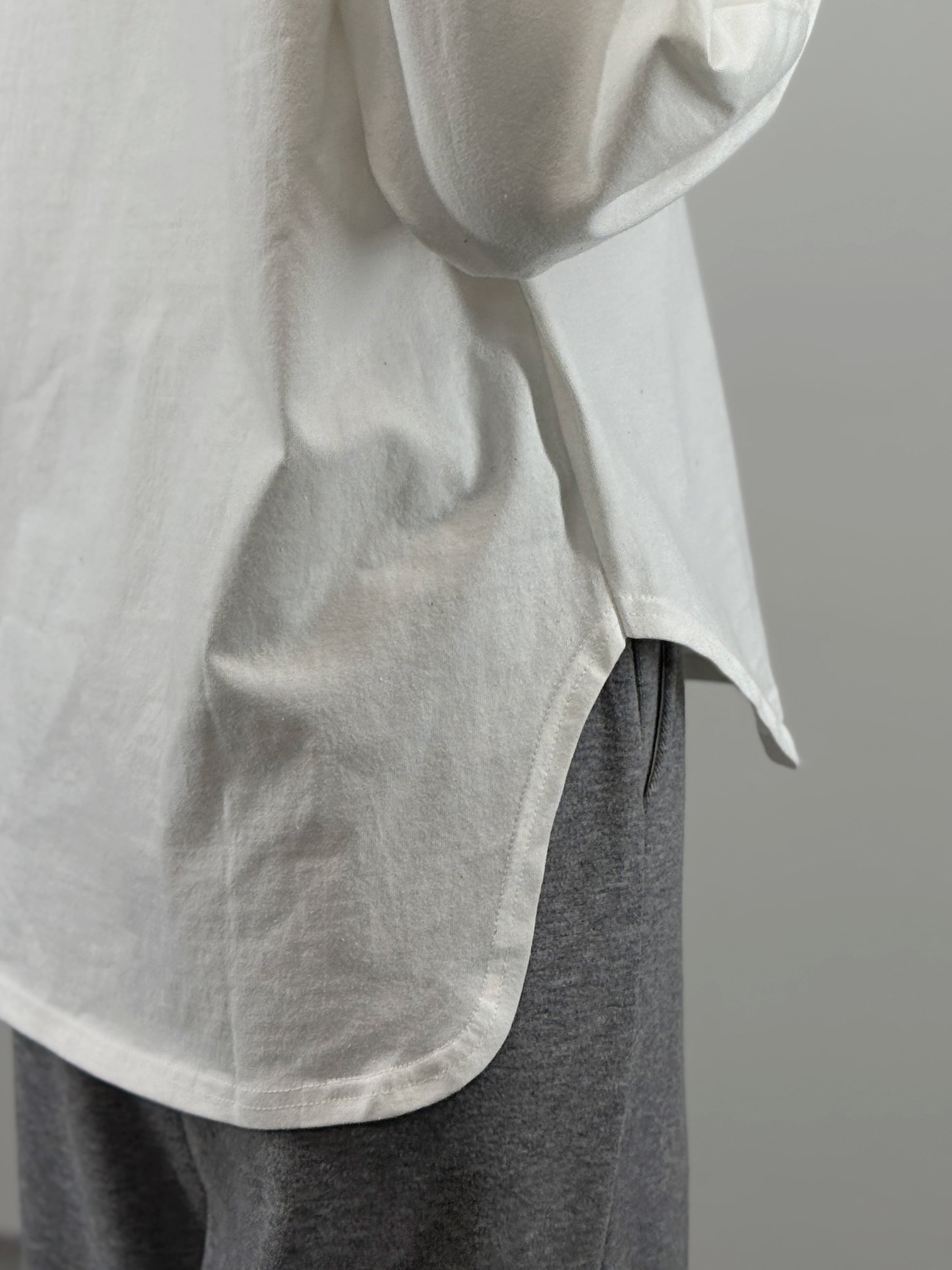 前後の着丈に差をつけた裾のラウンドカットが、気になる腰周りをカバーしつつ、インでもアウトでも決まる絶妙なバランスが魅力です。