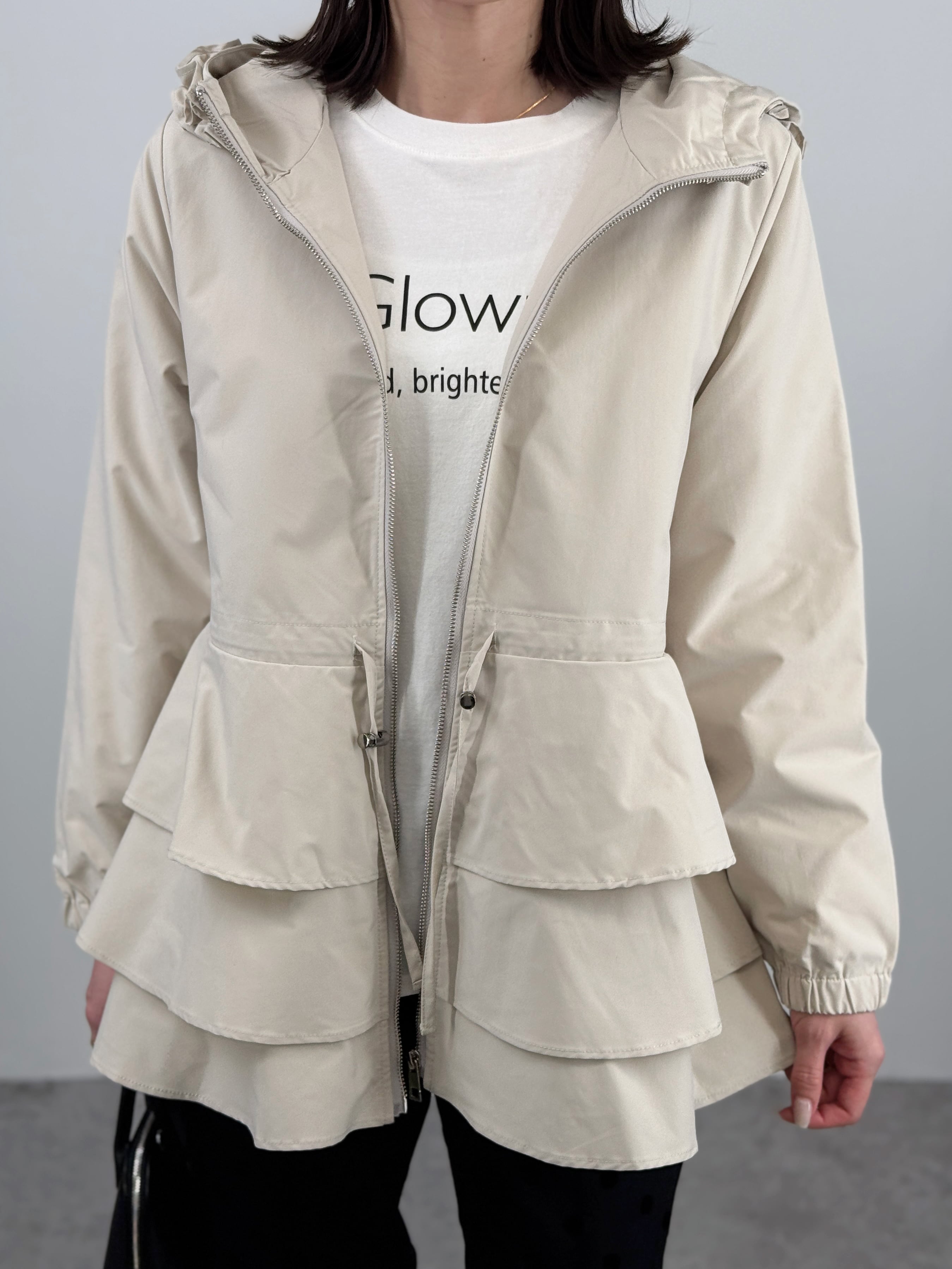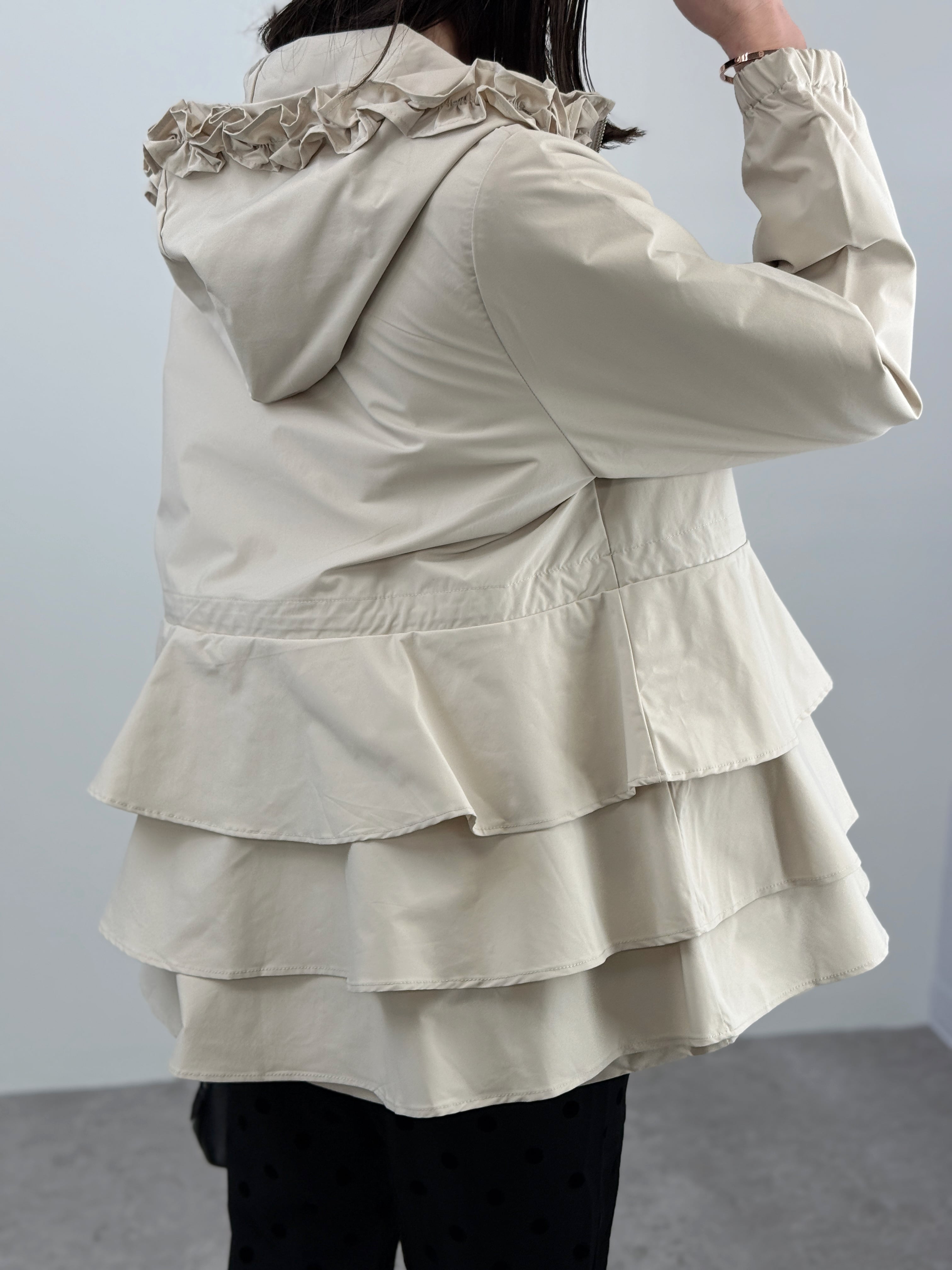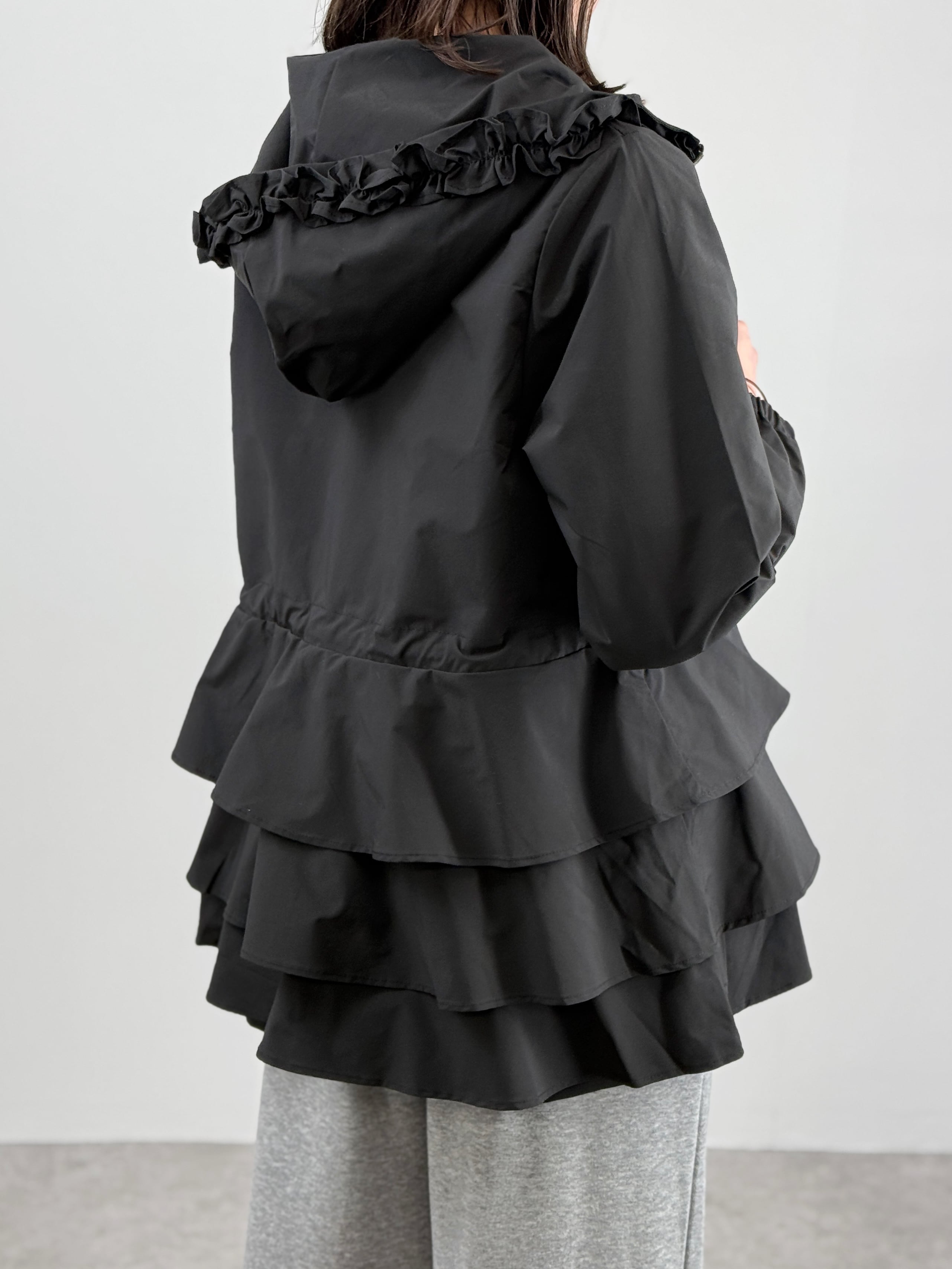 カジュアルなフーディージャケットに、たっぷりのフリルで華やかさをプラス。