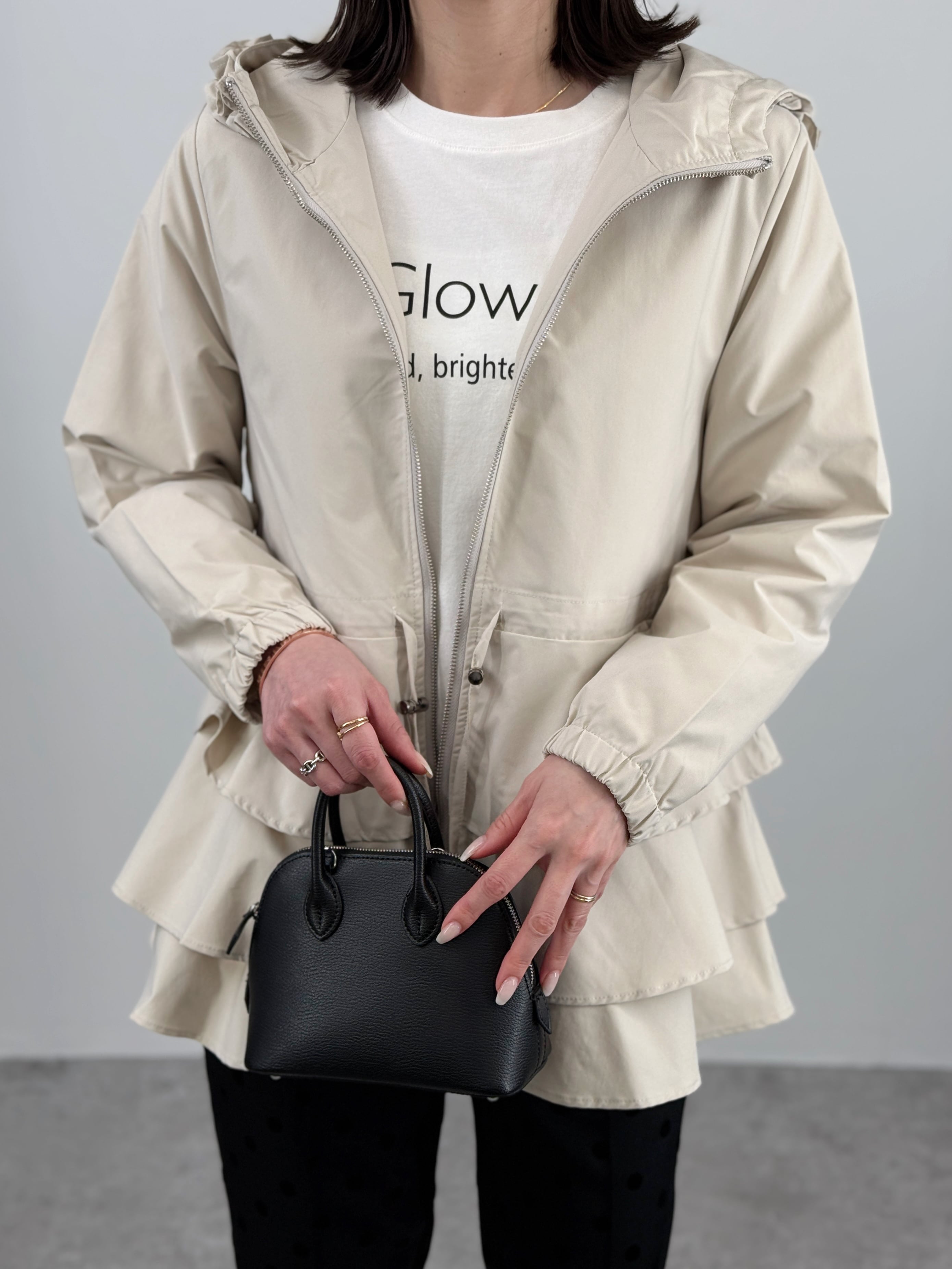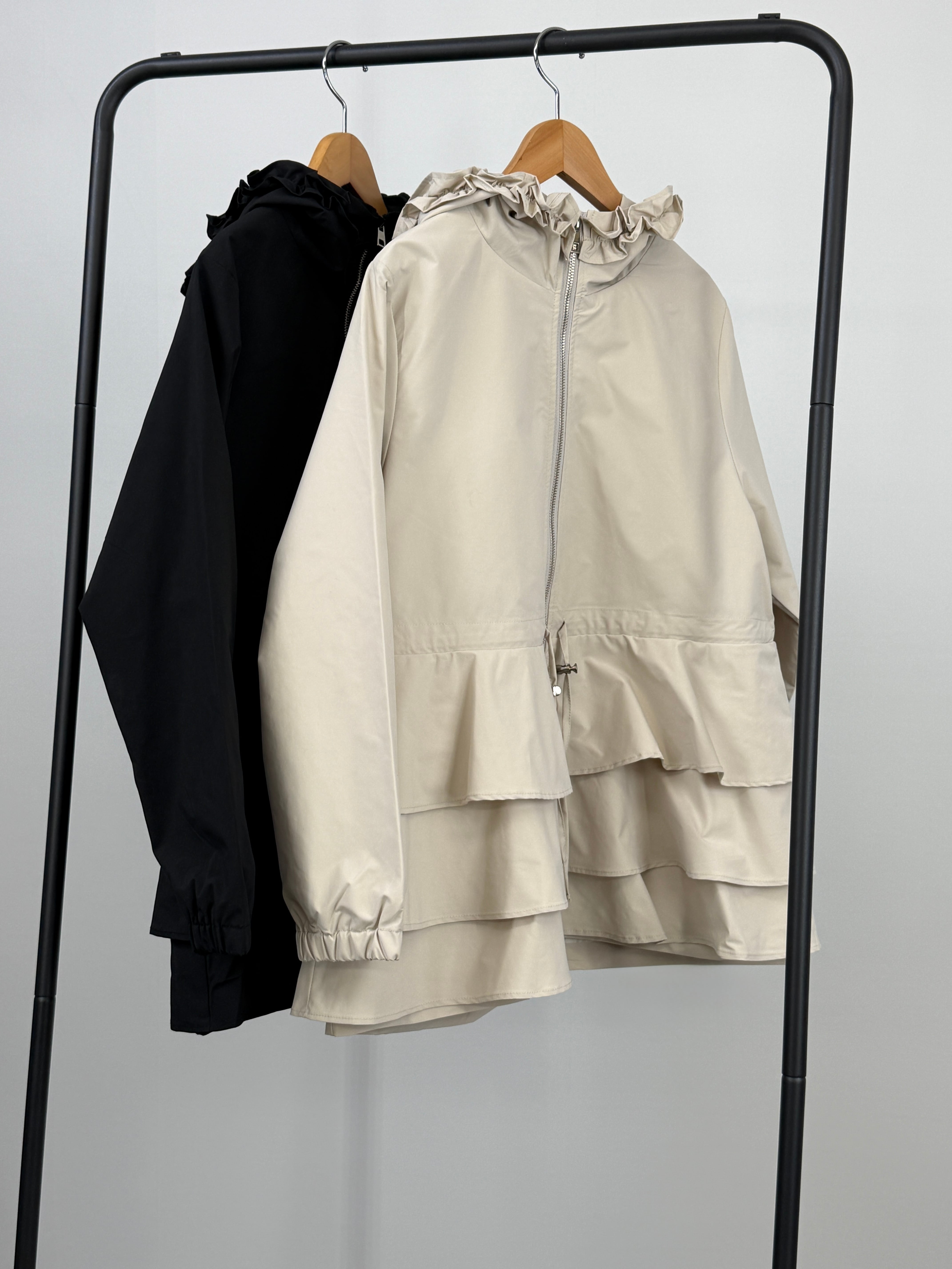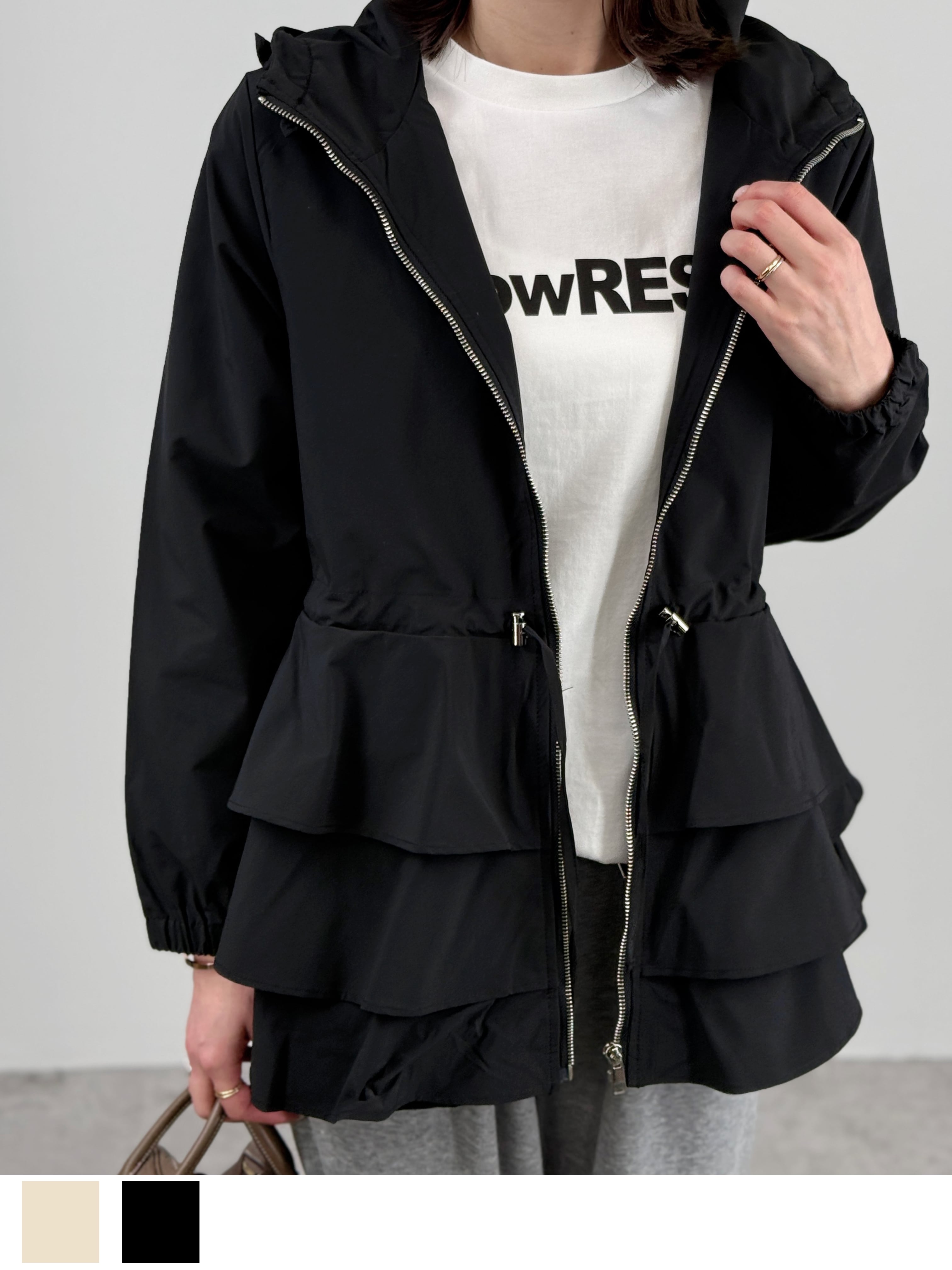 カジュアルなフーディージャケットに、たっぷりのフリルで華やかさをプラス。