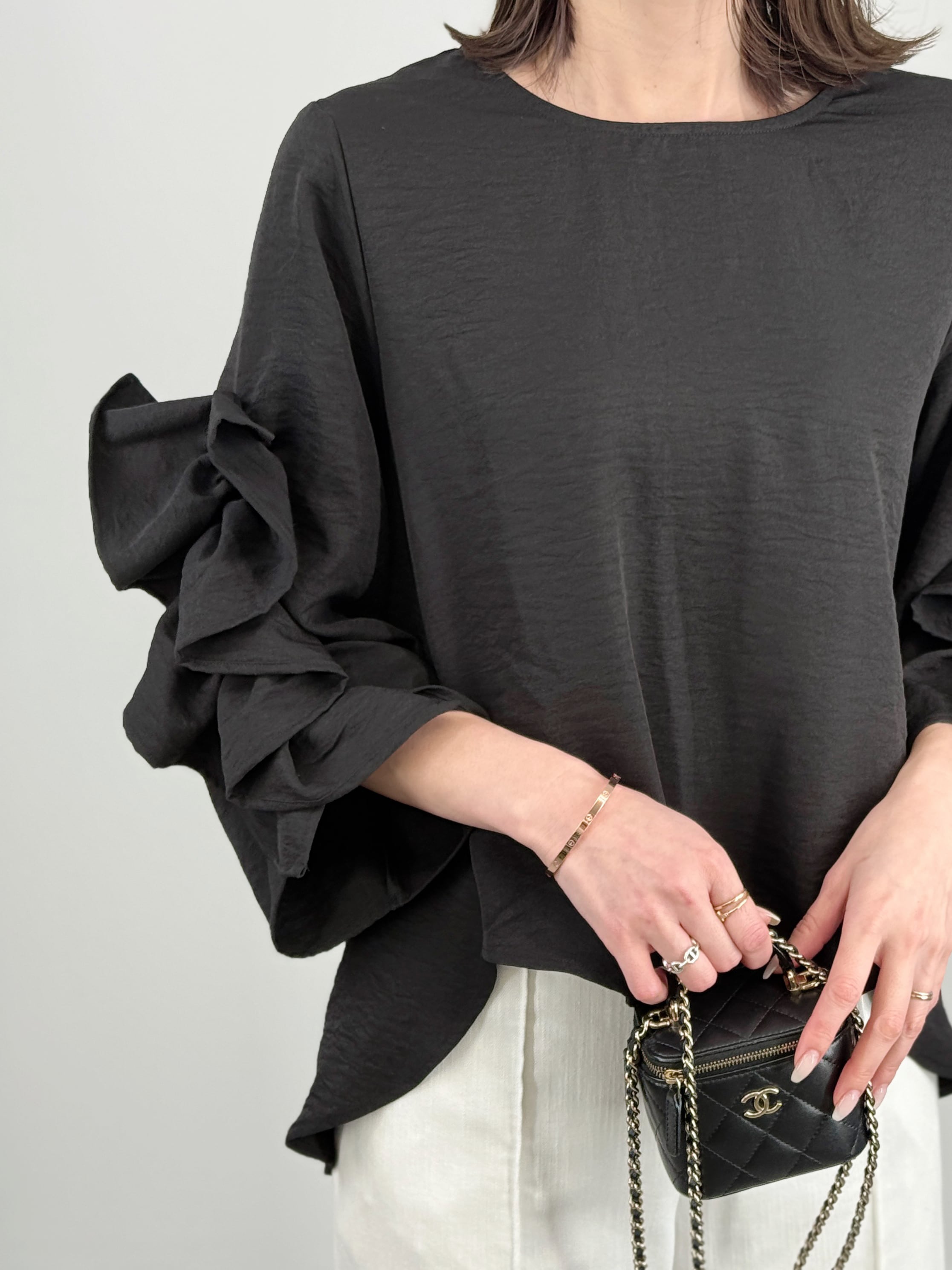 袖にあしらわれたランダムフリルが目を惹く、プルオーバー。