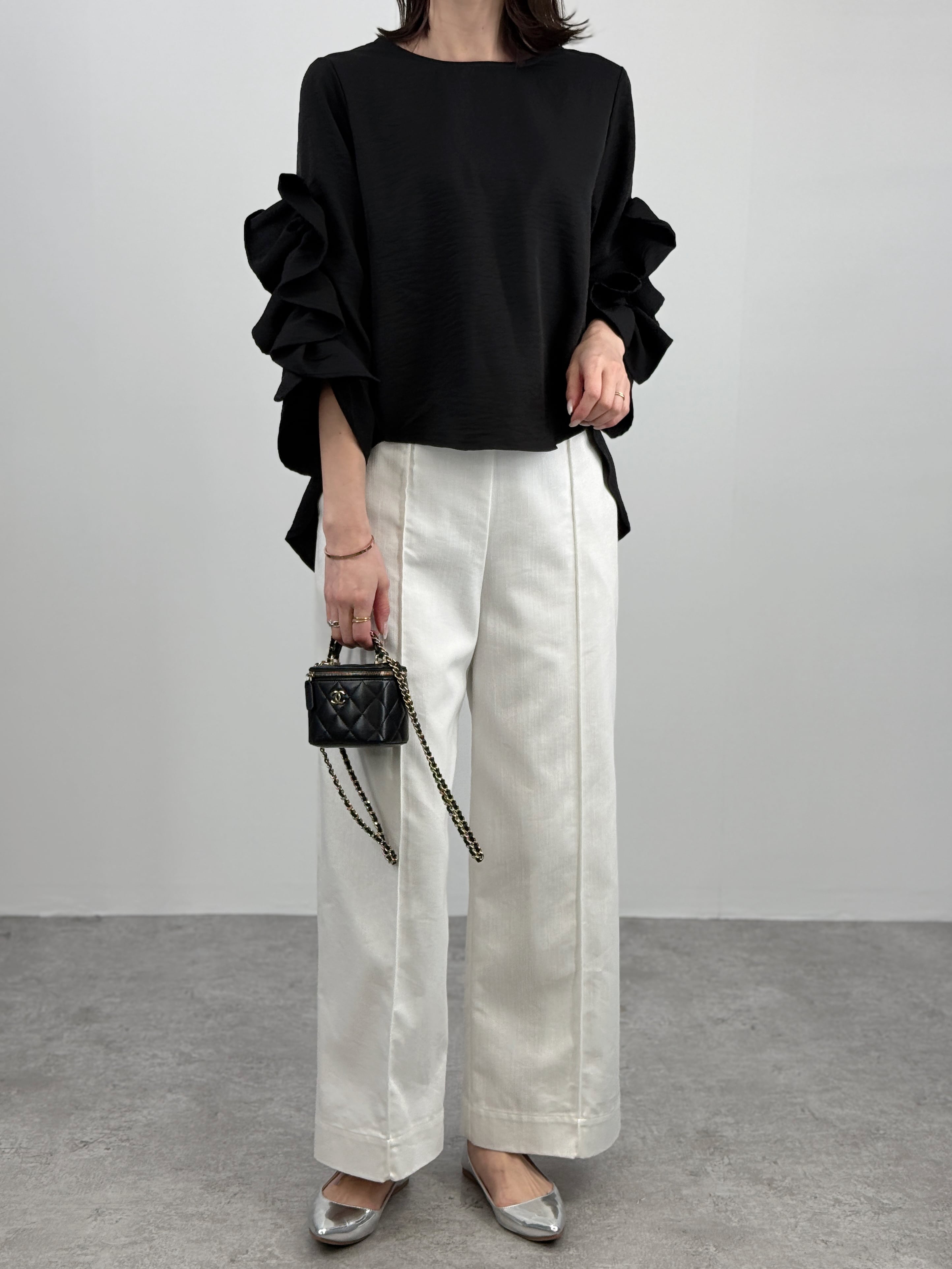 シンプルなパンツと合わせるだけで、洗練された着映えスタイルが完成します。