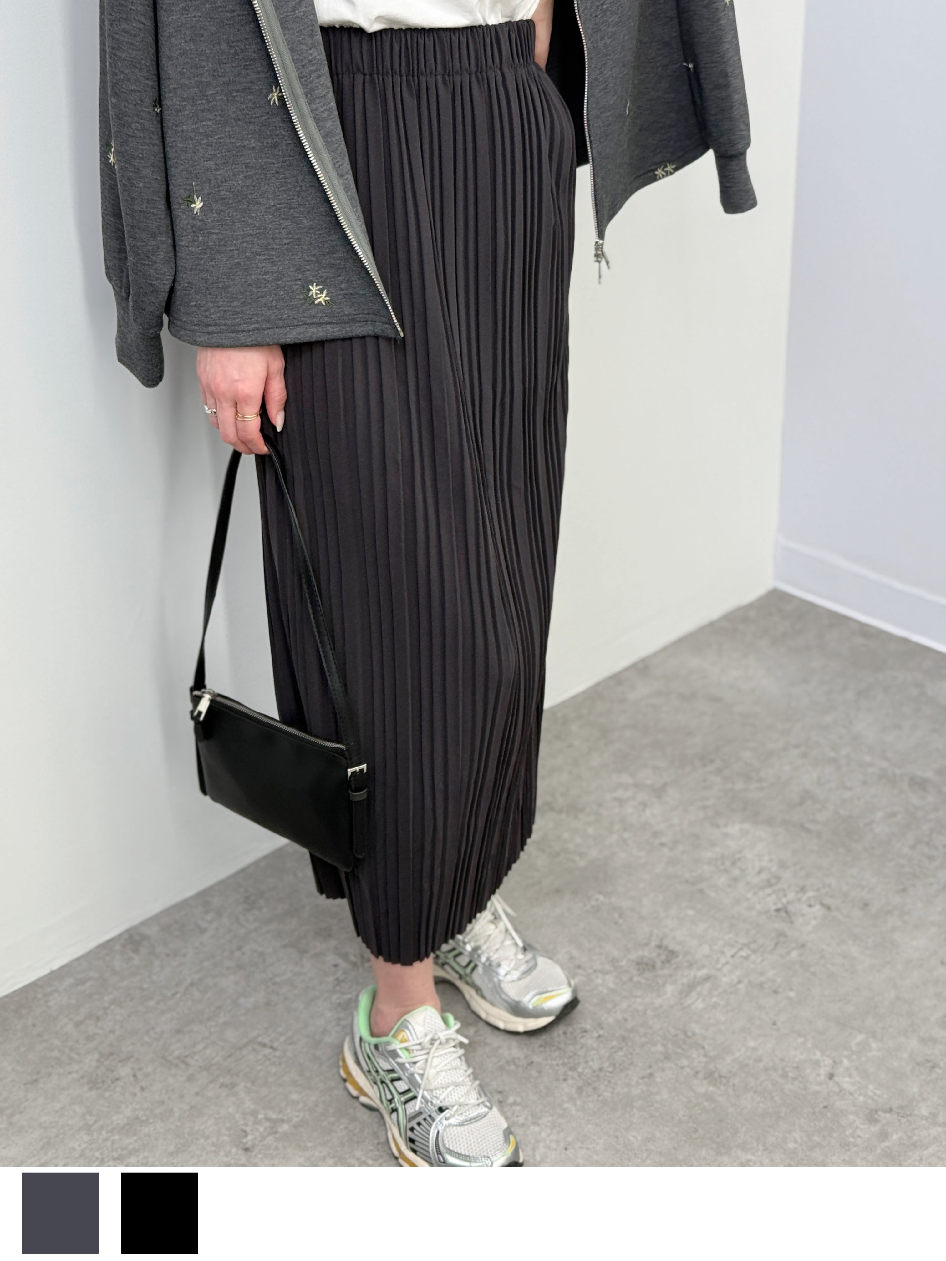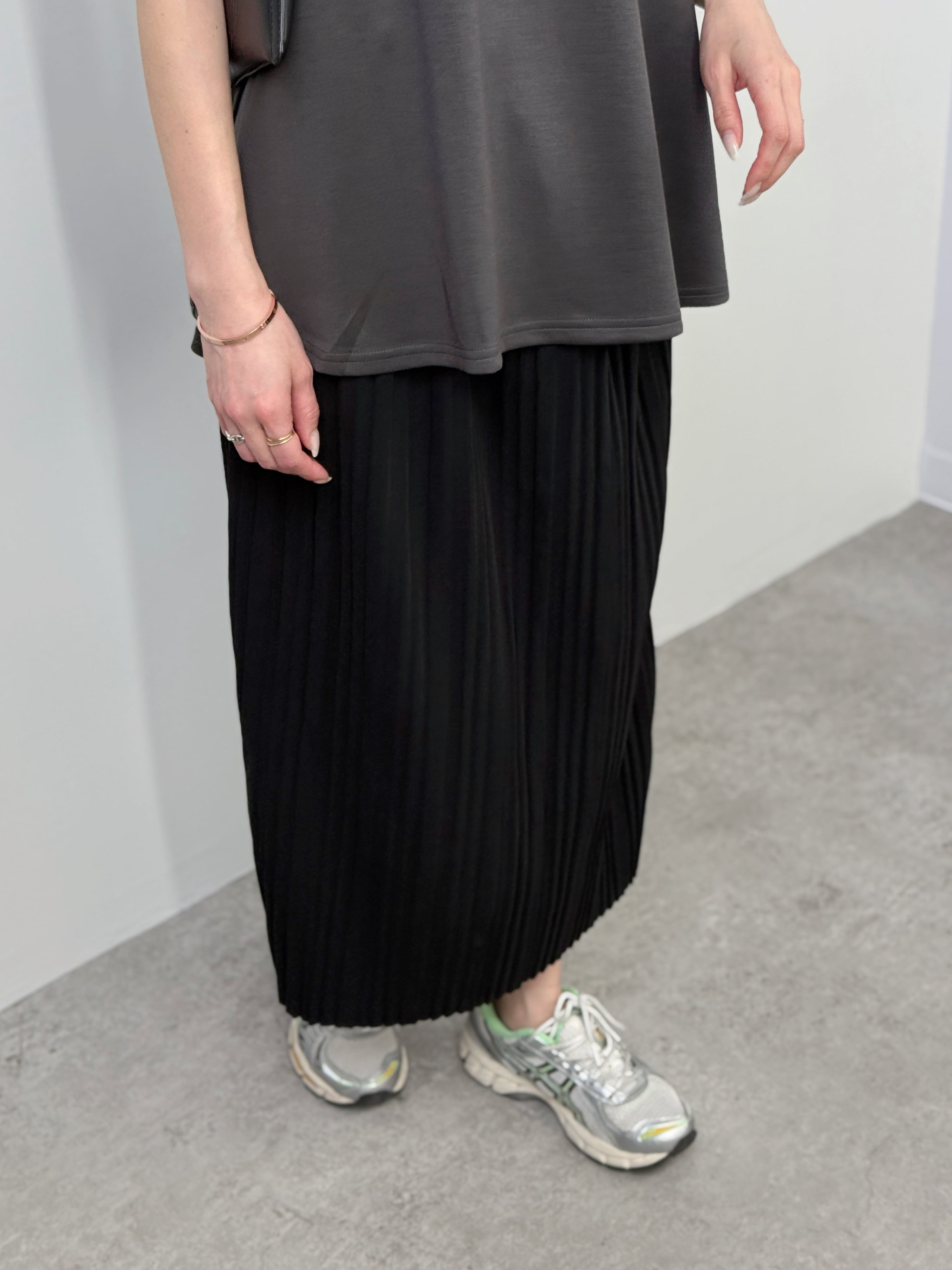 細やかなプリーツが縦長ラインを強調し、穿くだけでスタイルアップを叶えるペンシルスカート。