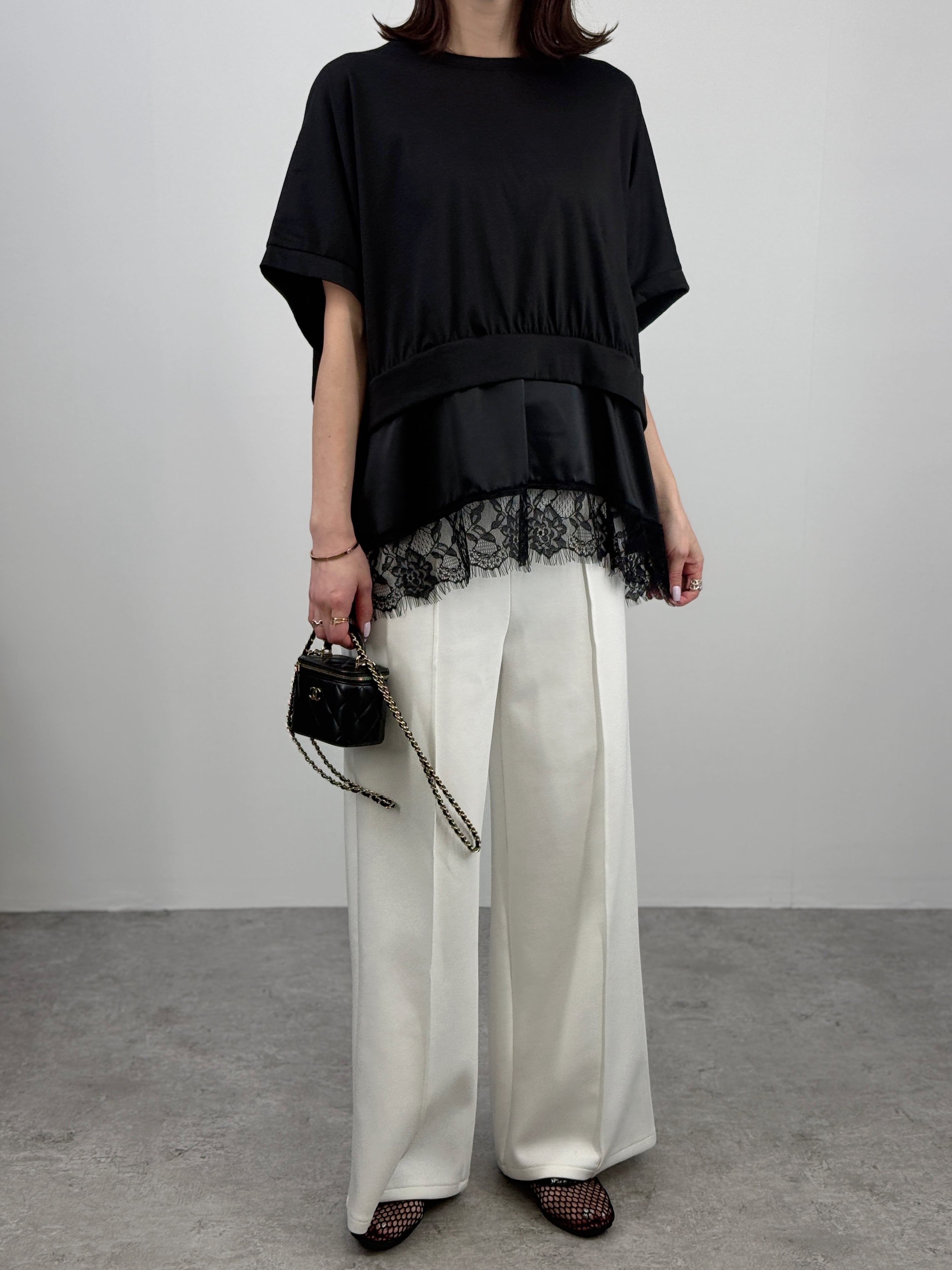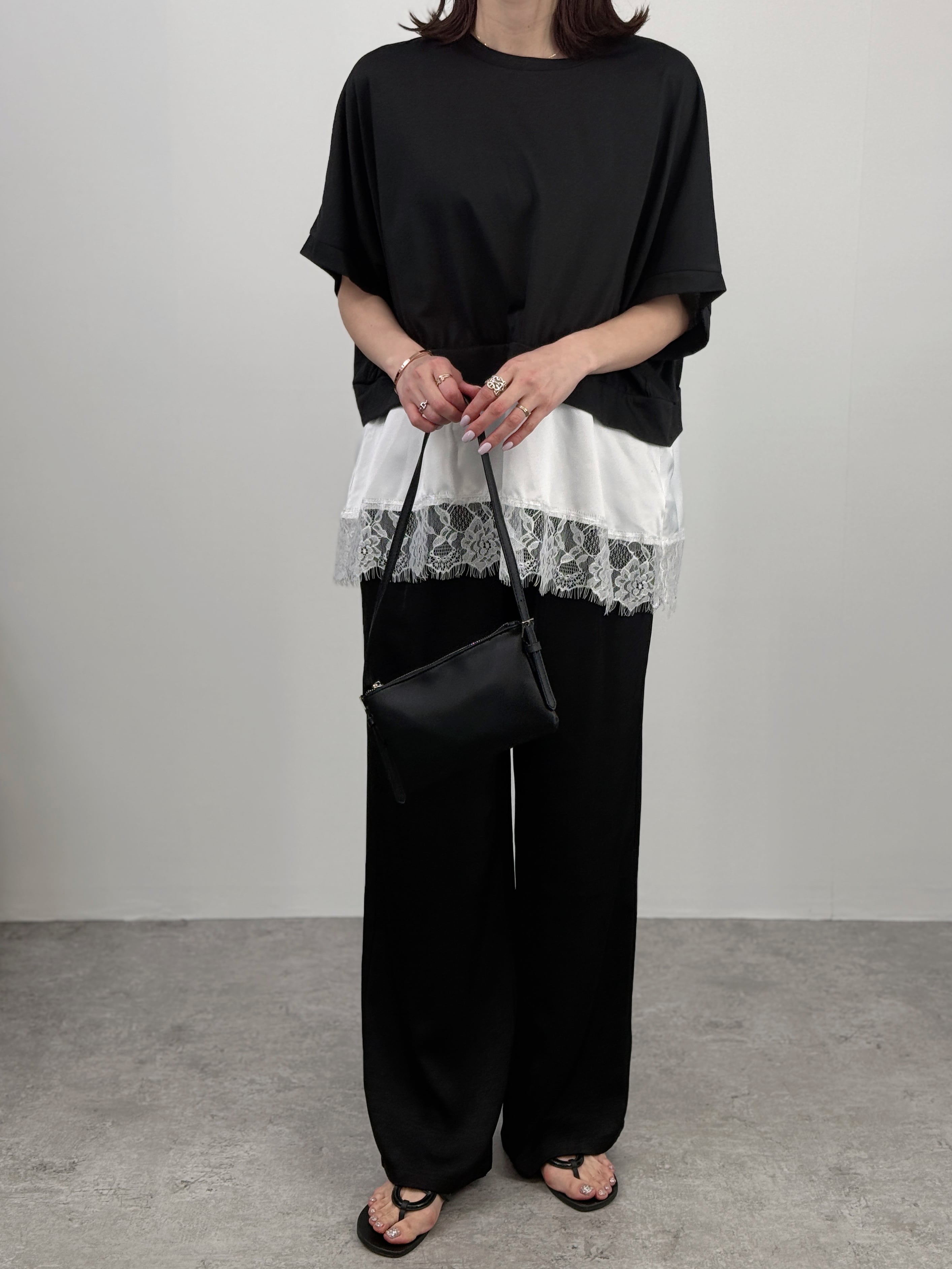 ゆったりしたドルマンシルエットに、サテンと繊細なレースを重ねた裾のデザインが目を引きます。