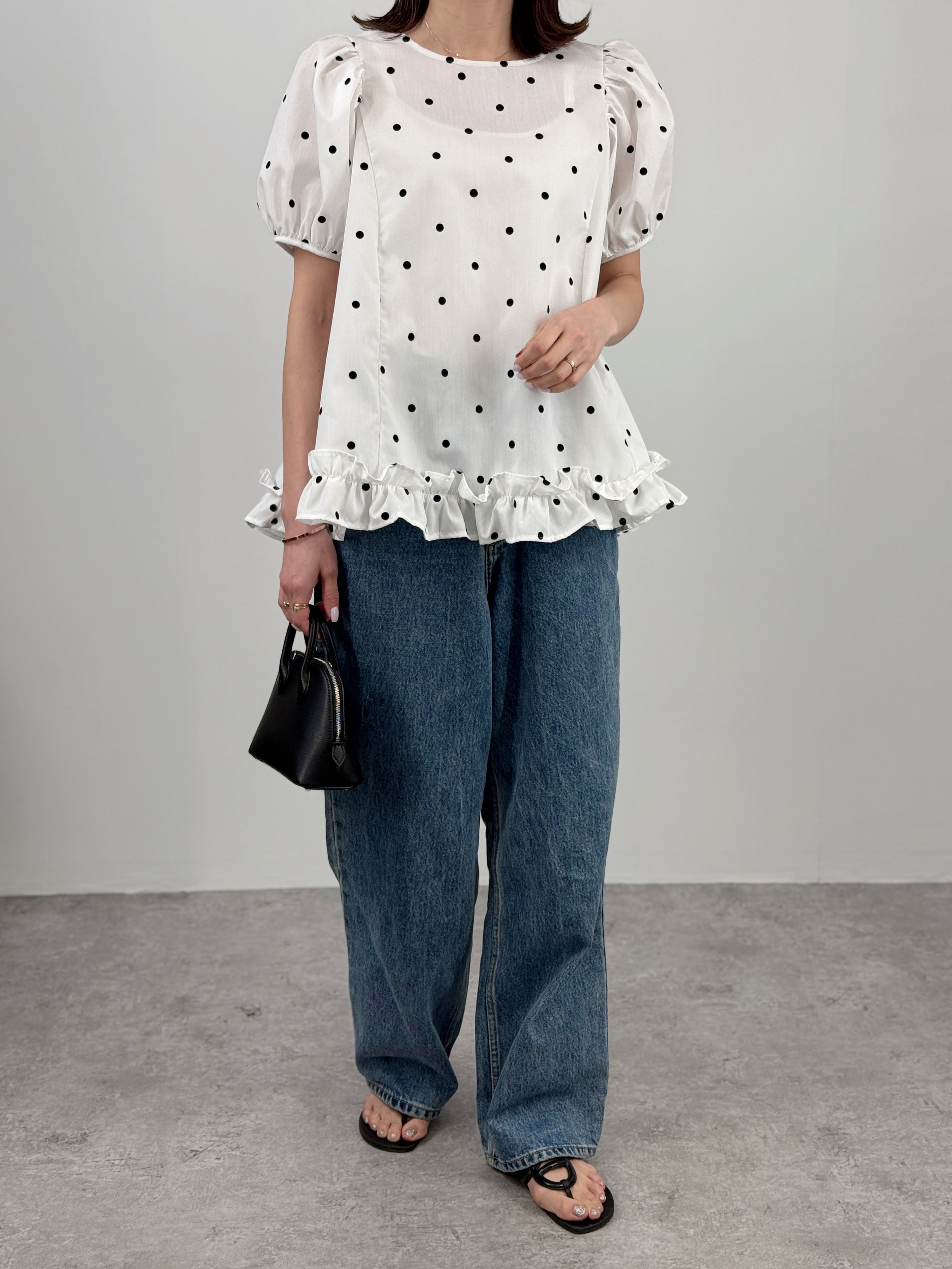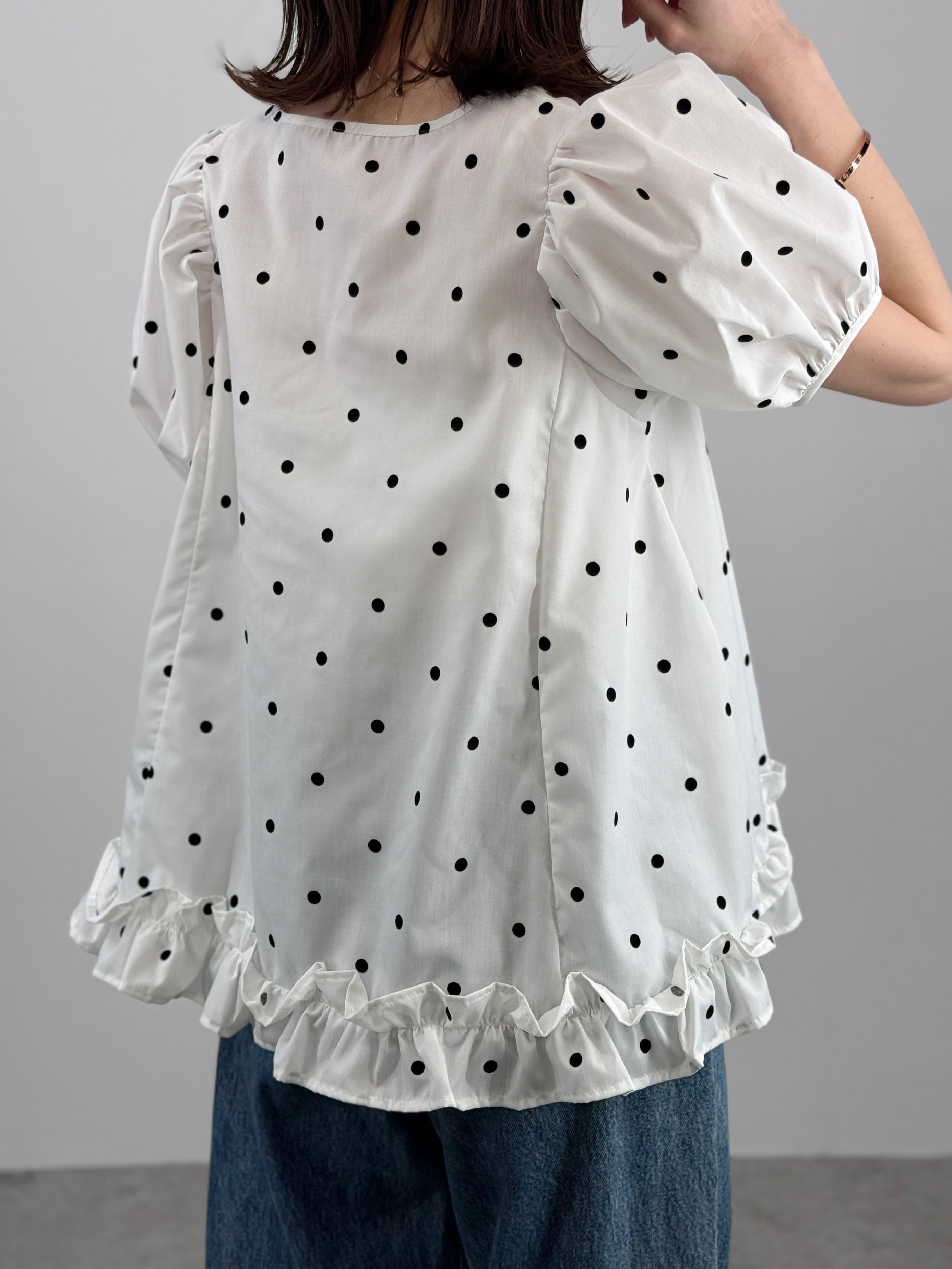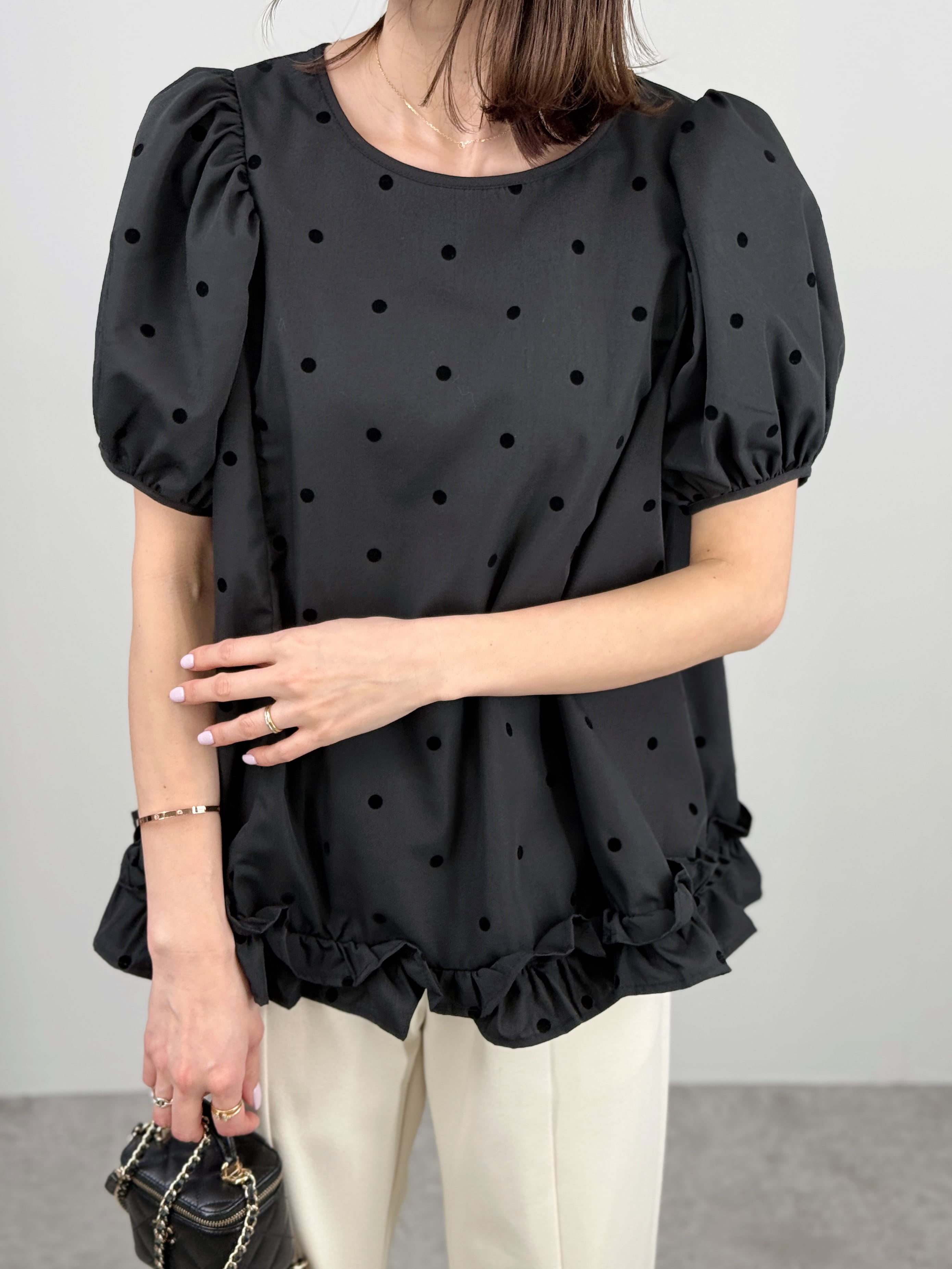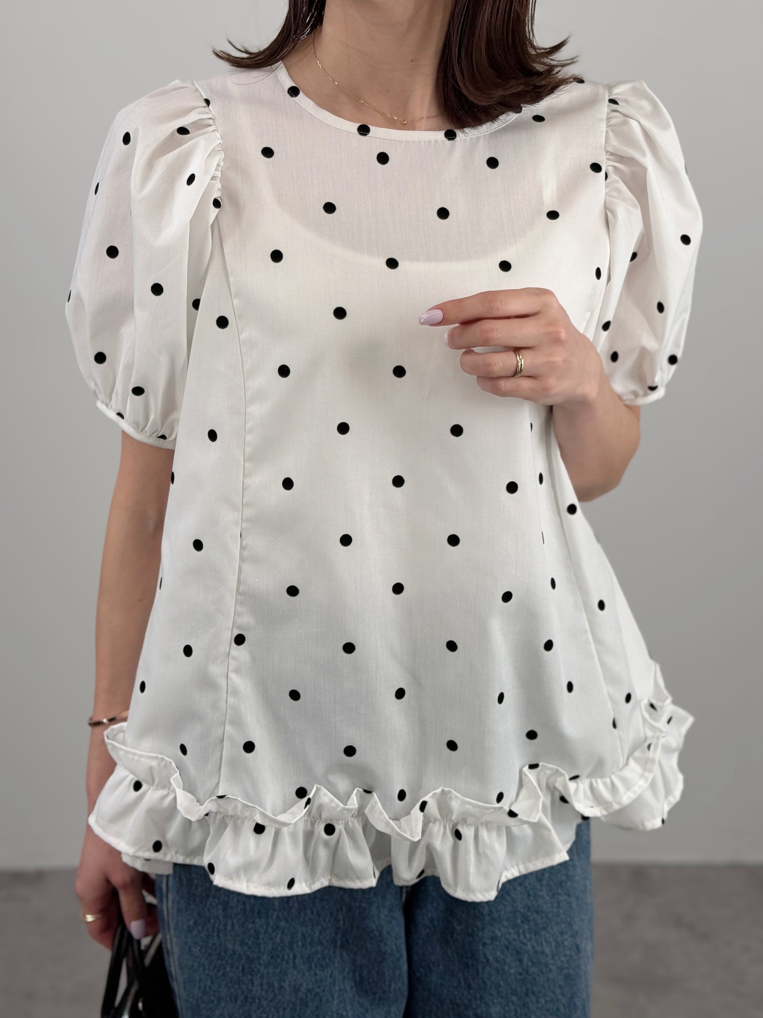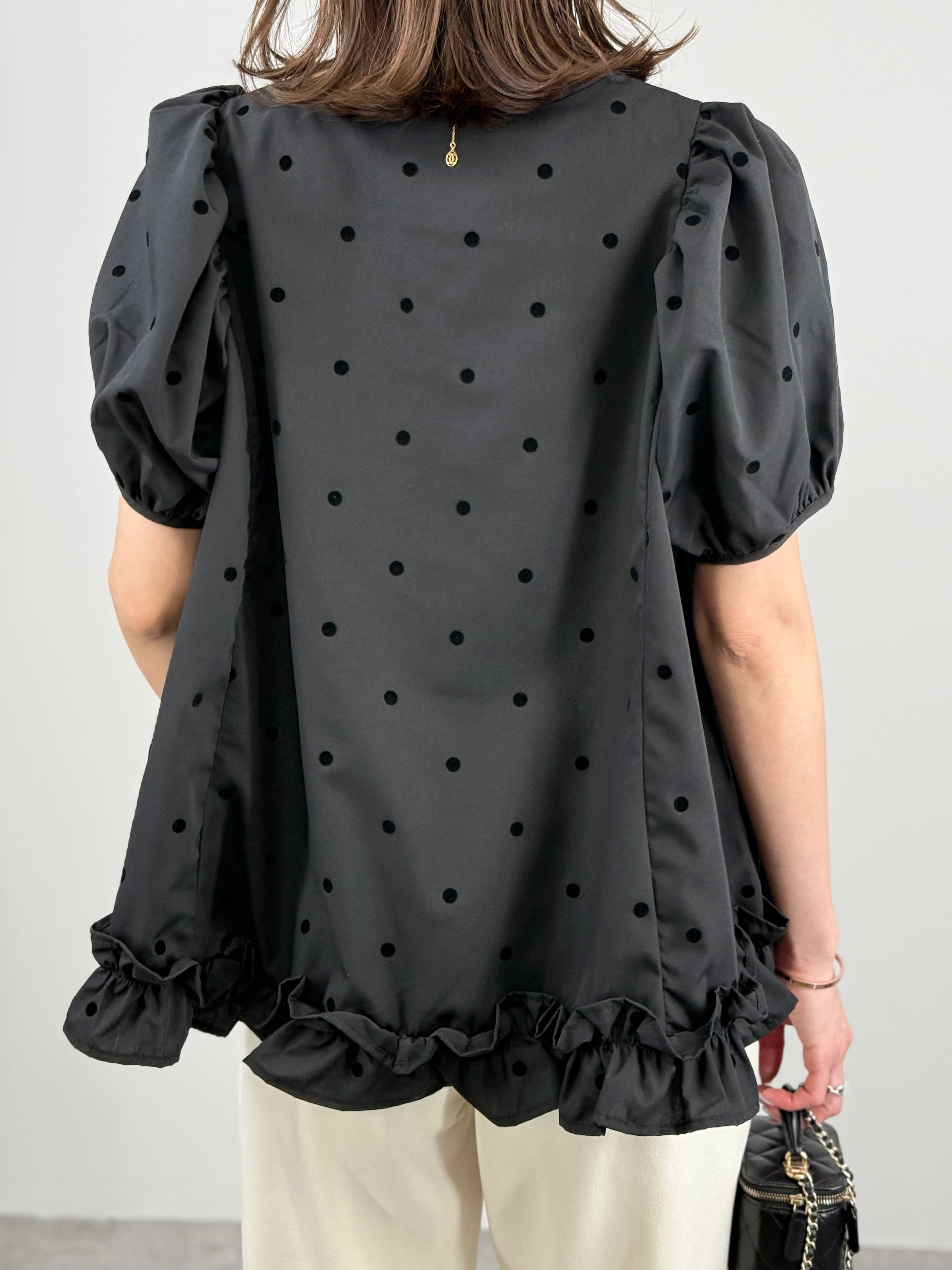 大人可愛いドット柄と、裾のフリルが目を惹く華やかなブラウス。