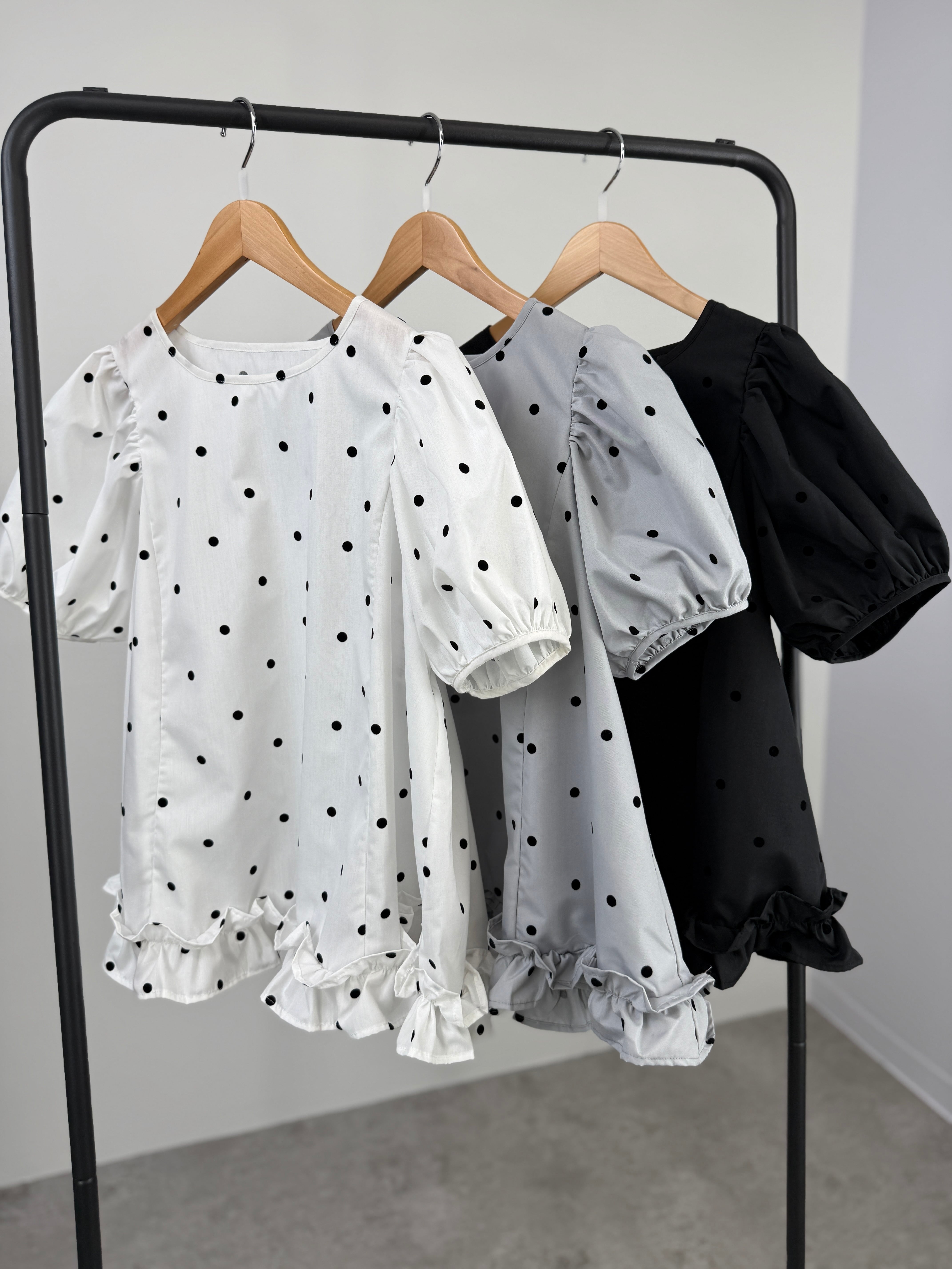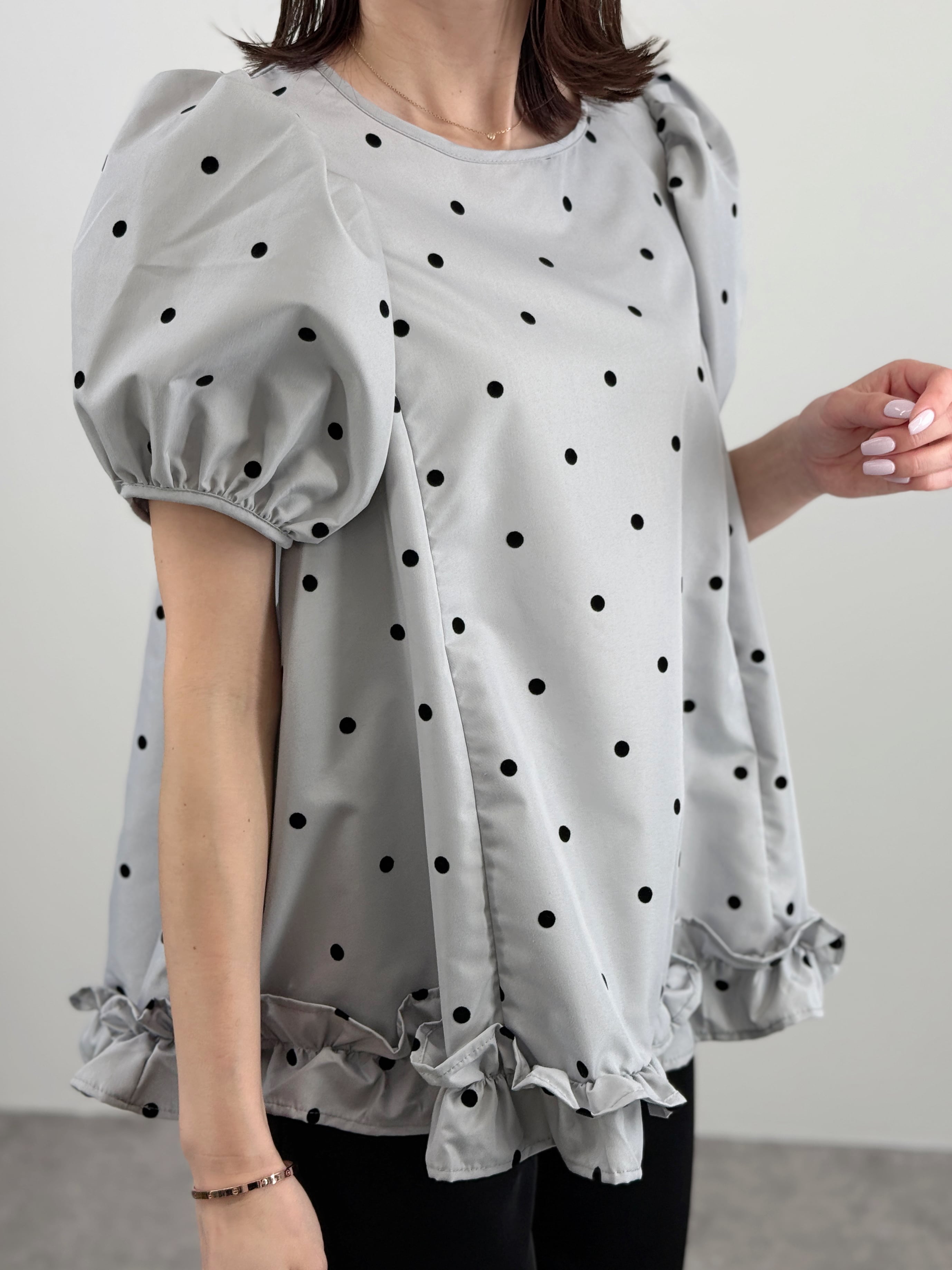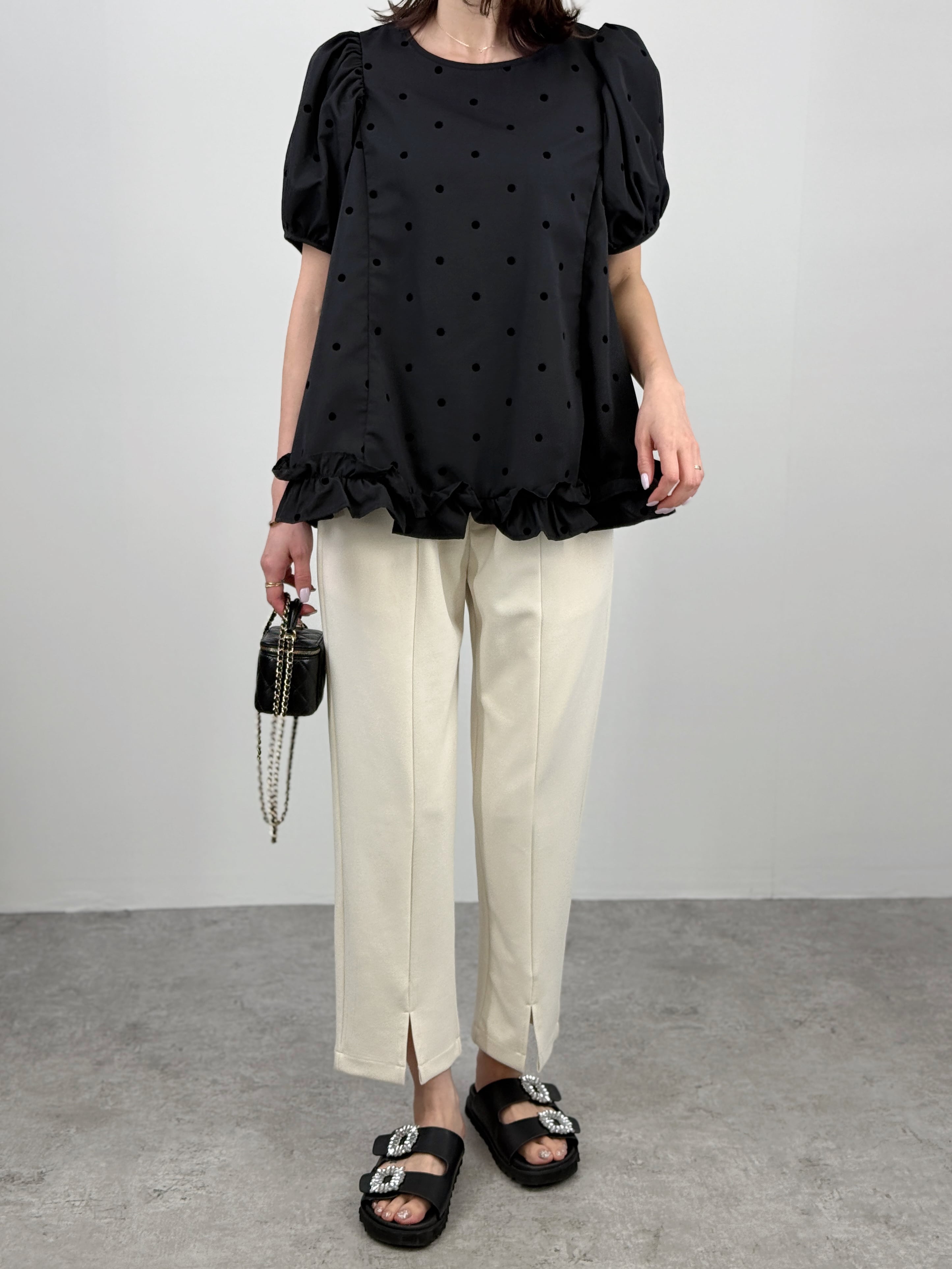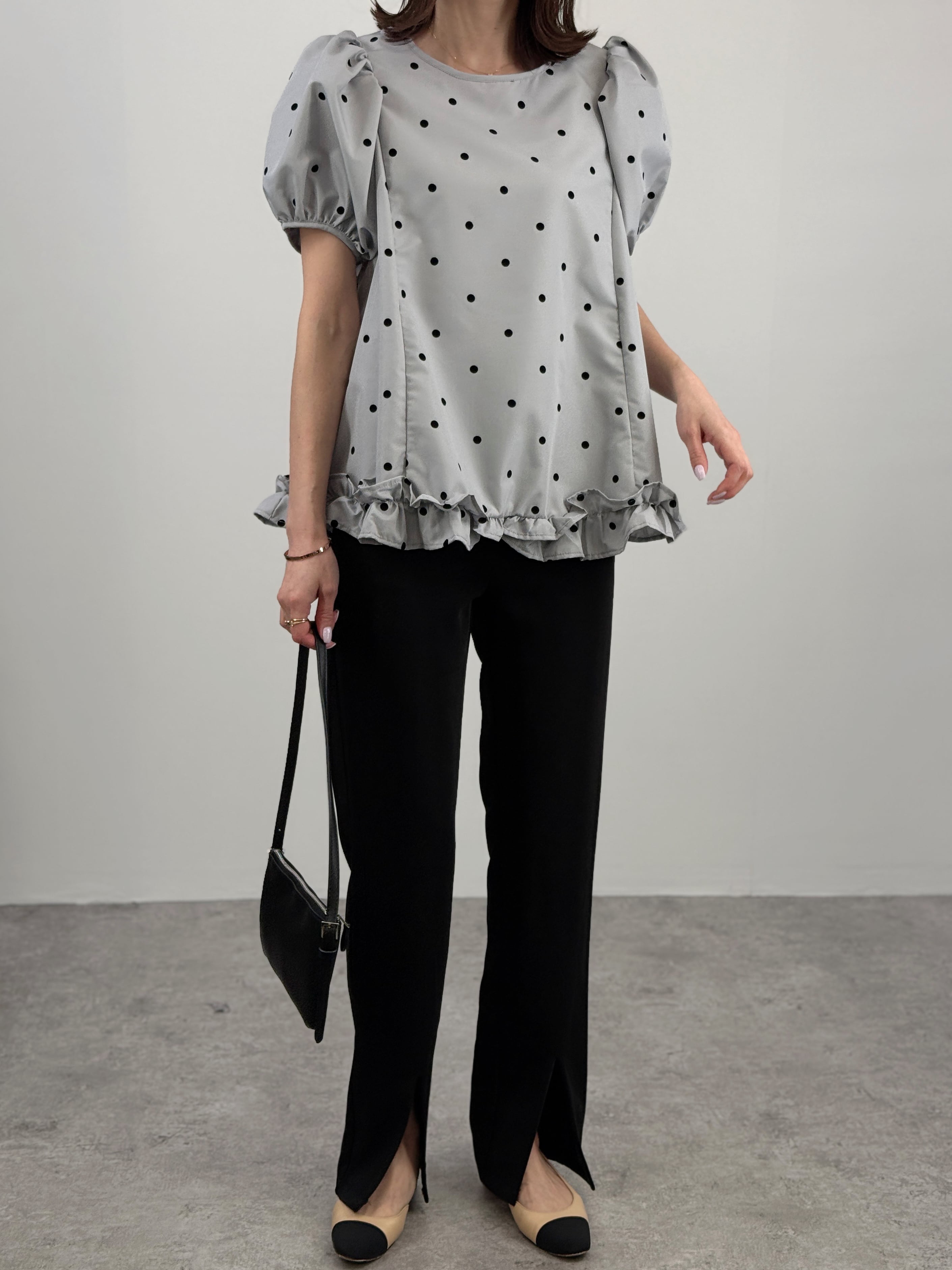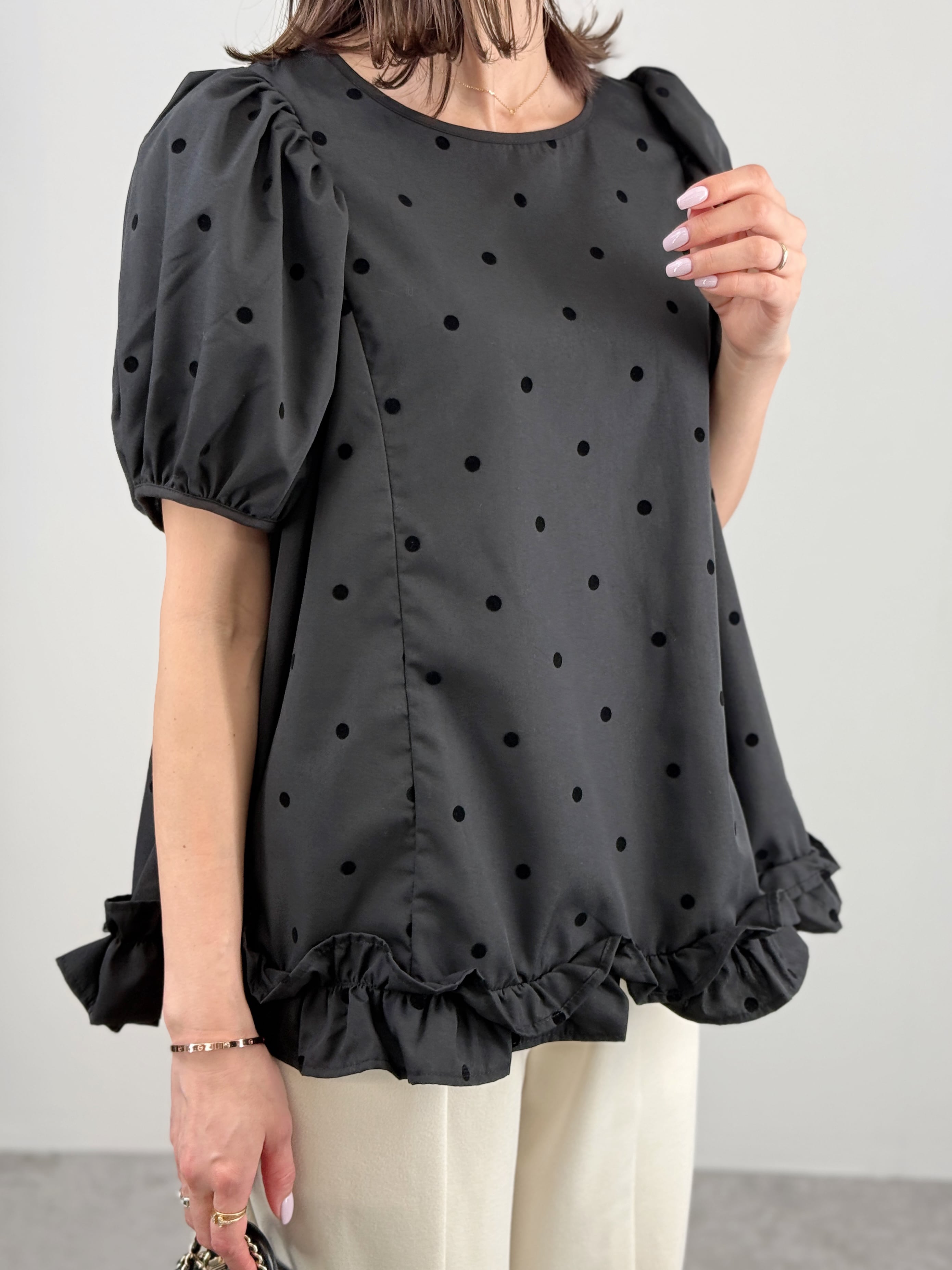 大人可愛いドット柄と、裾のフリルが目を惹く華やかなブラウス。