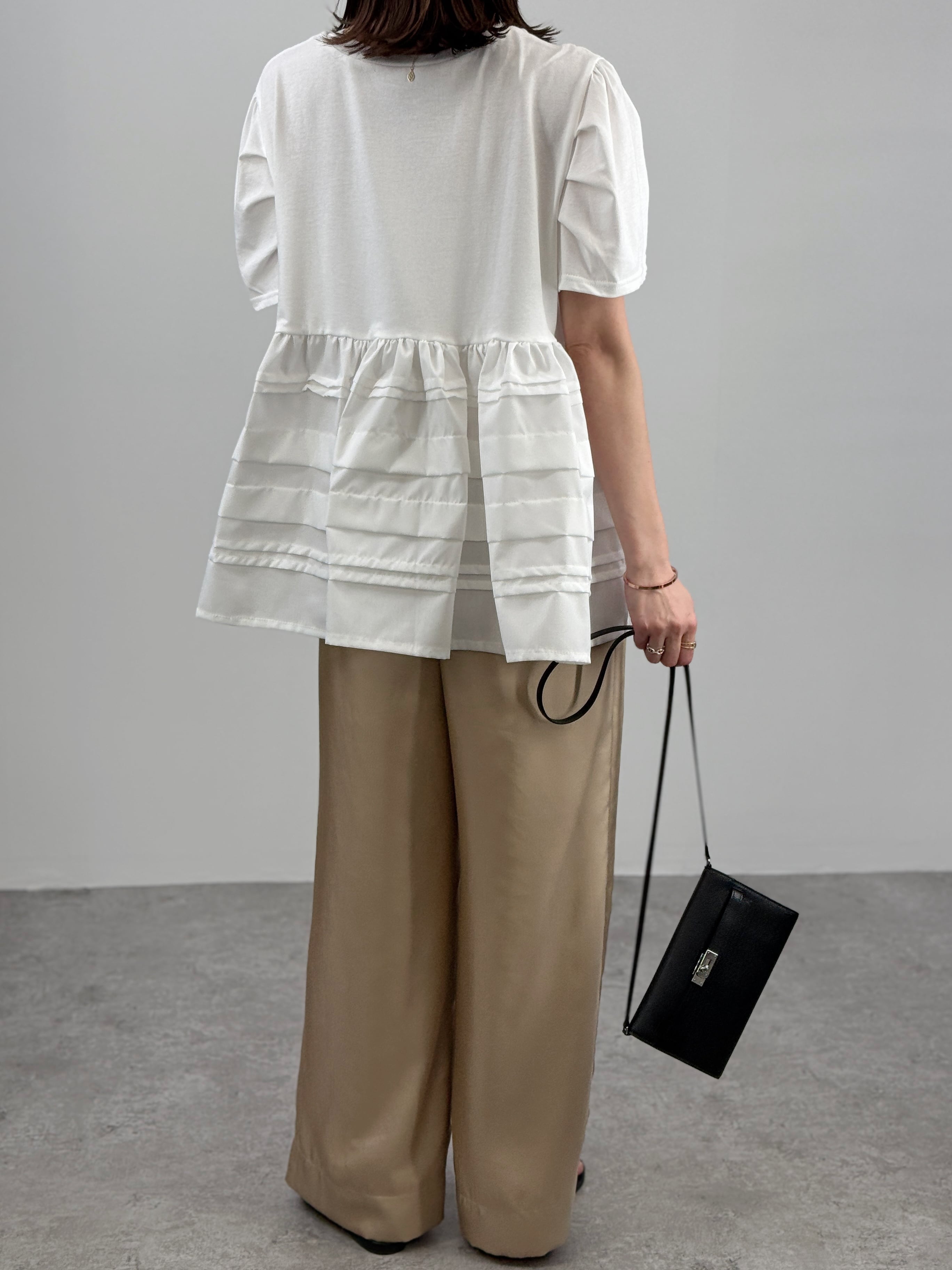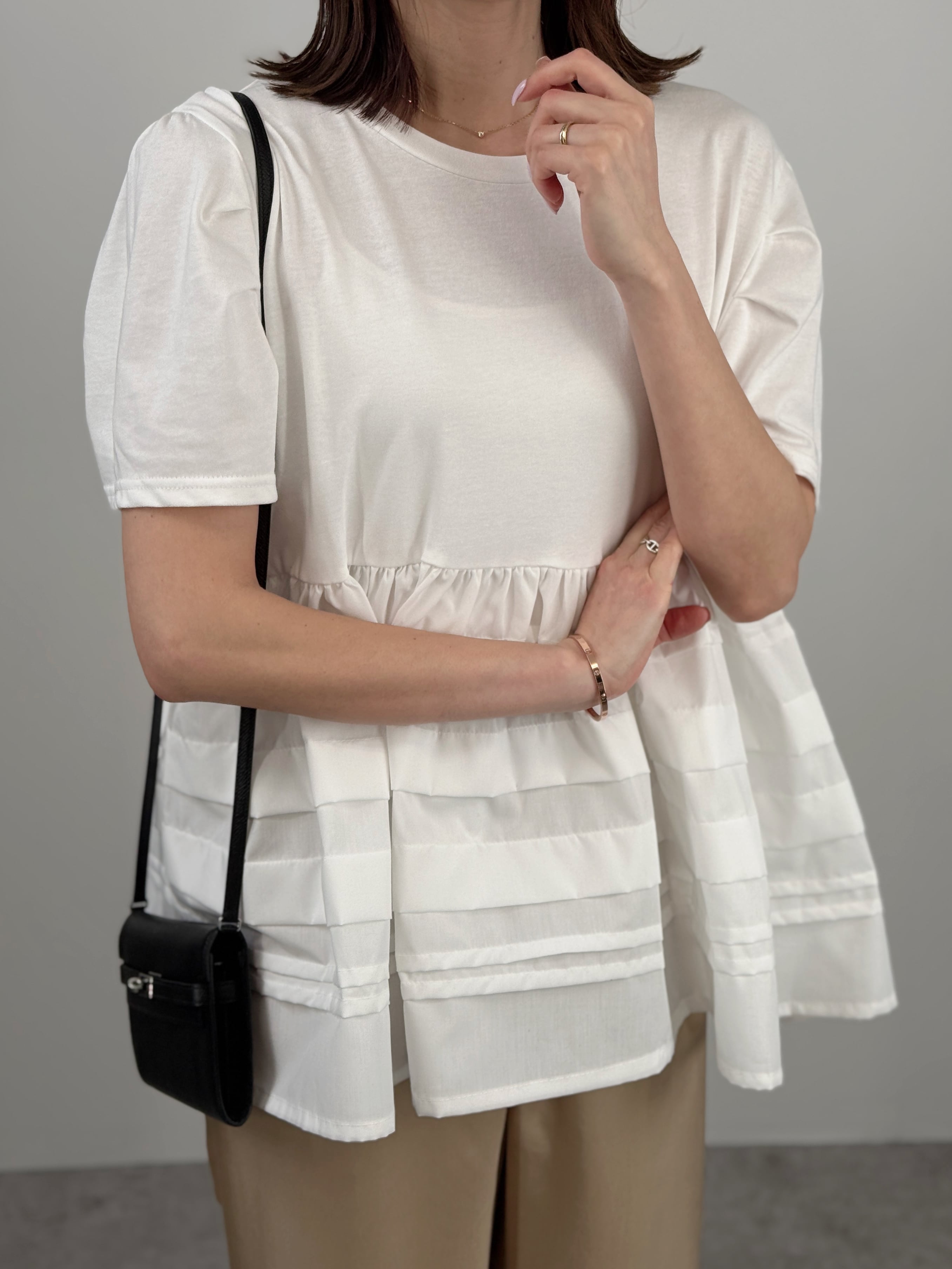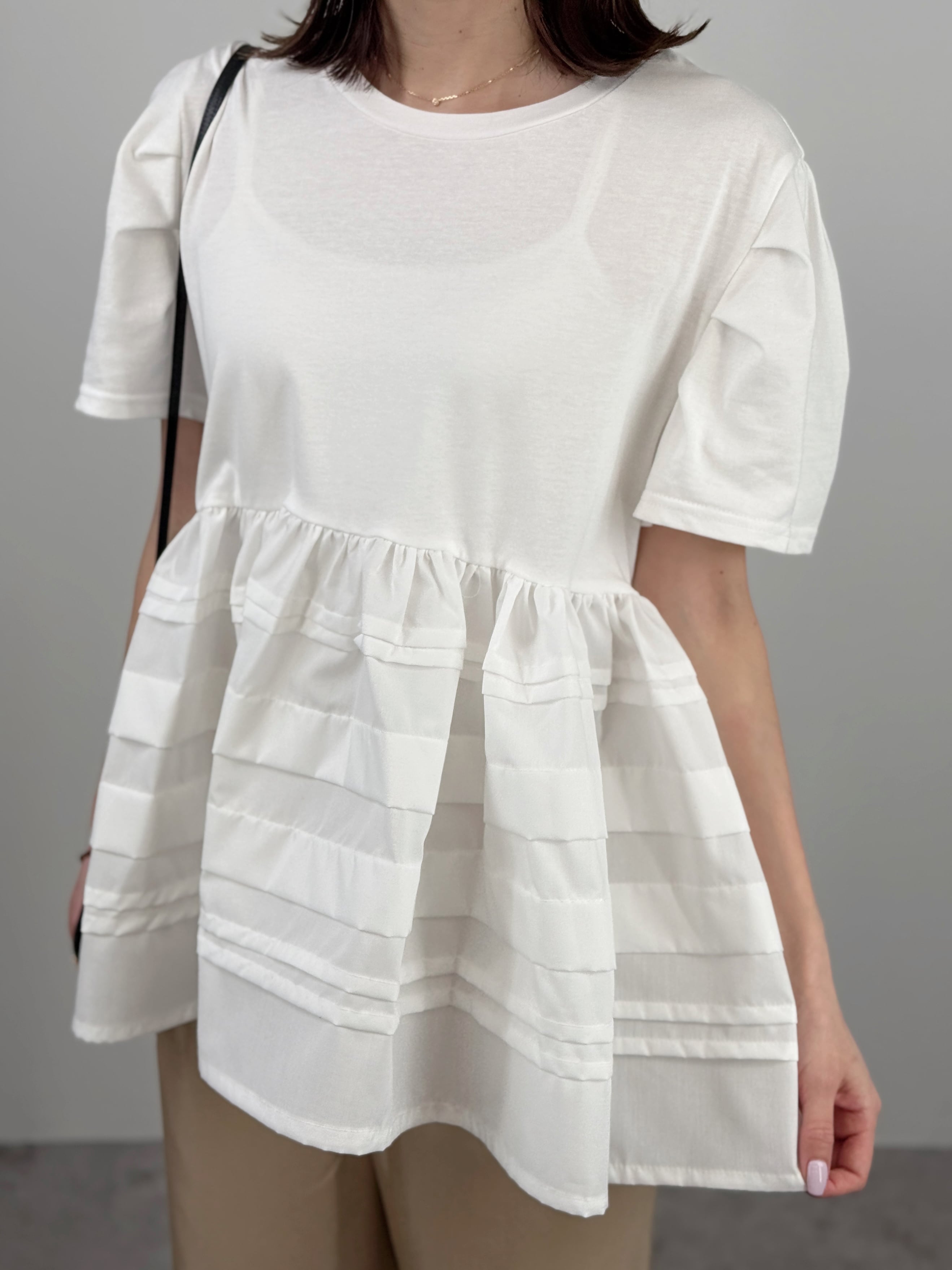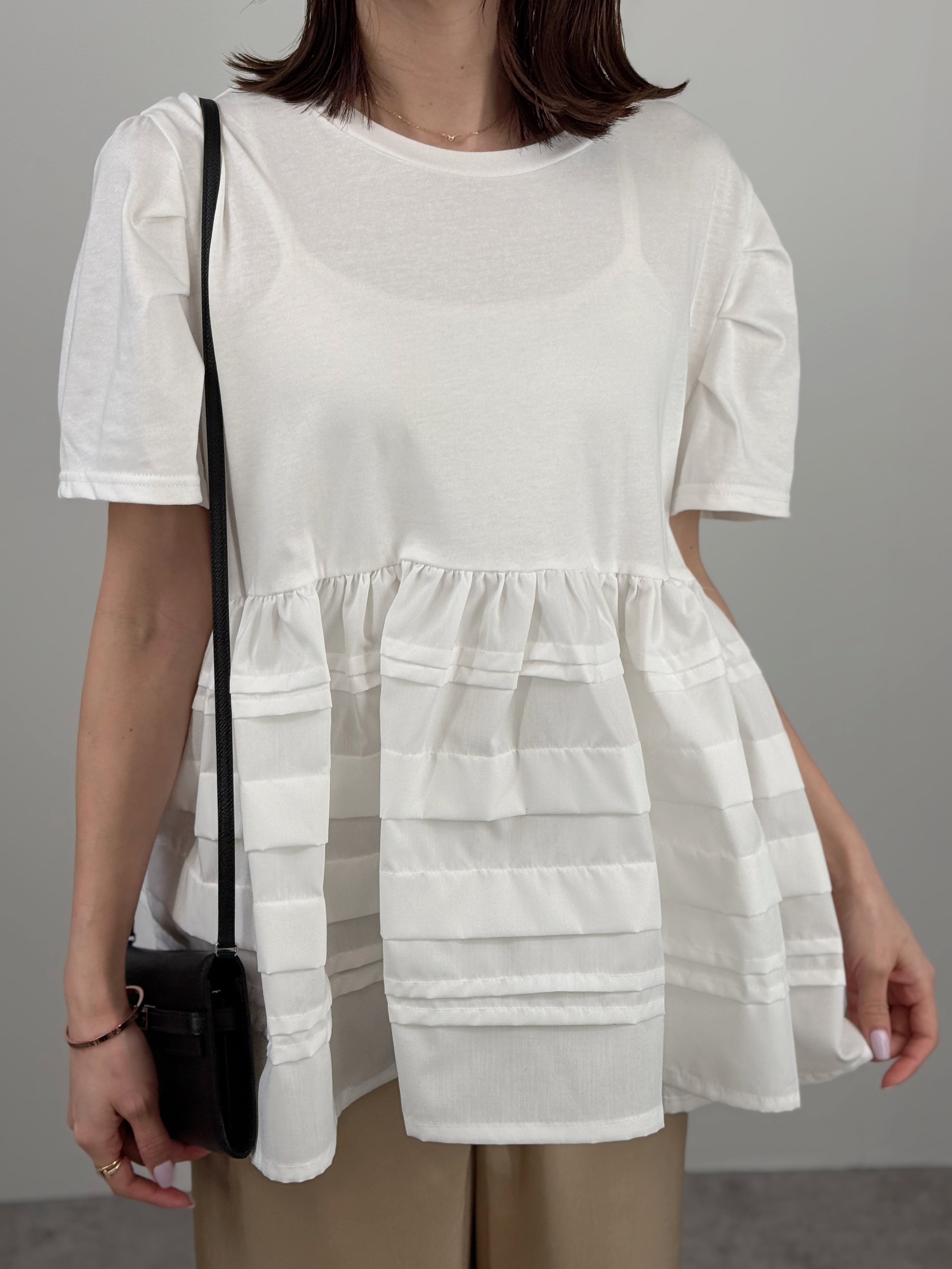 一枚で主役級の華やかさ。カットソーにランダムなラインフリルを施したドッキングトップスです。