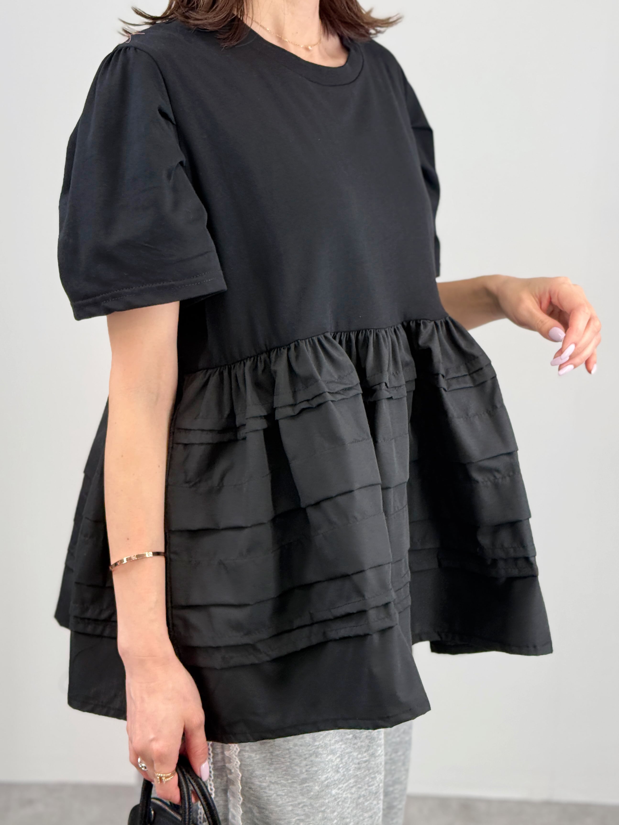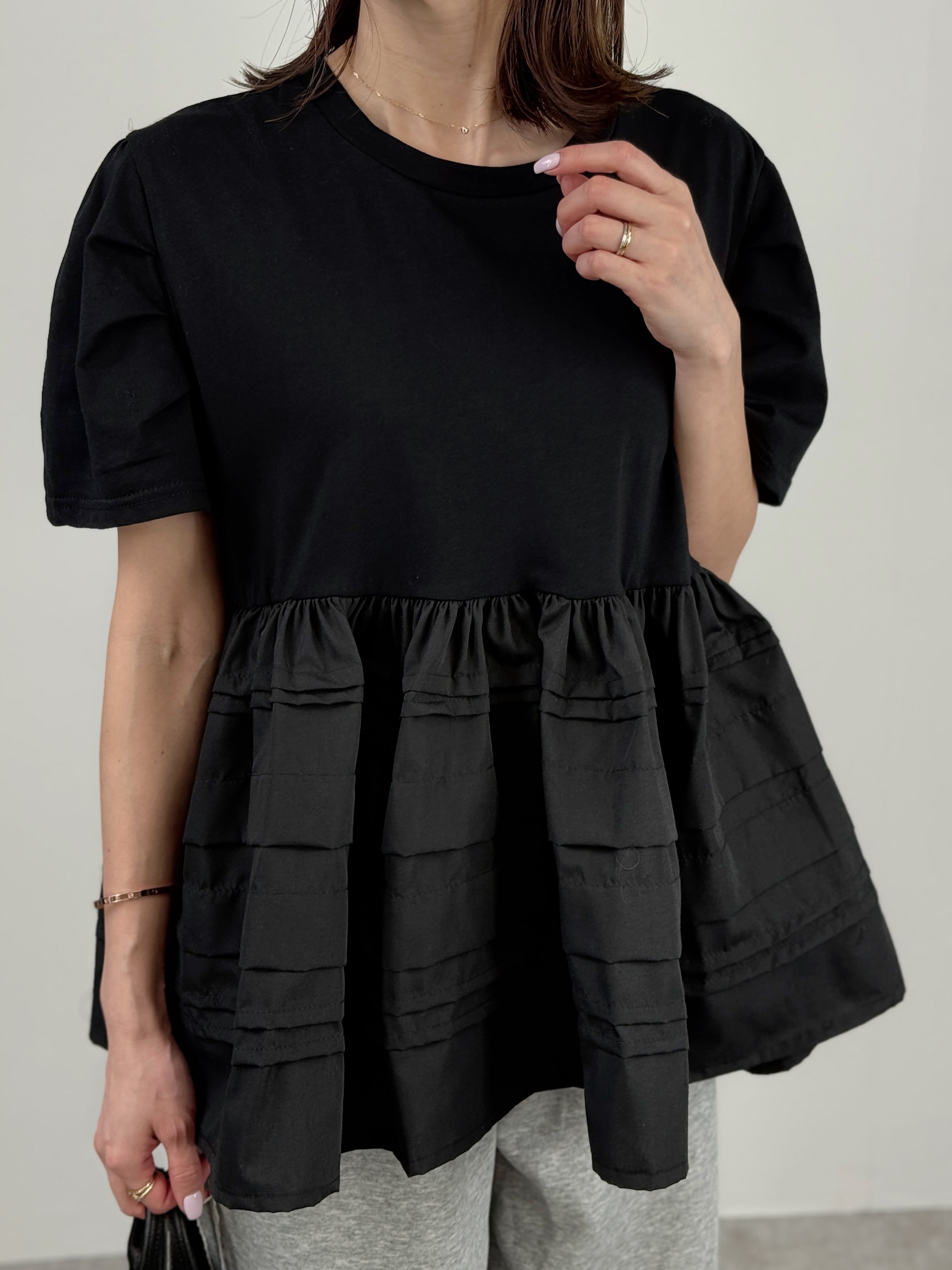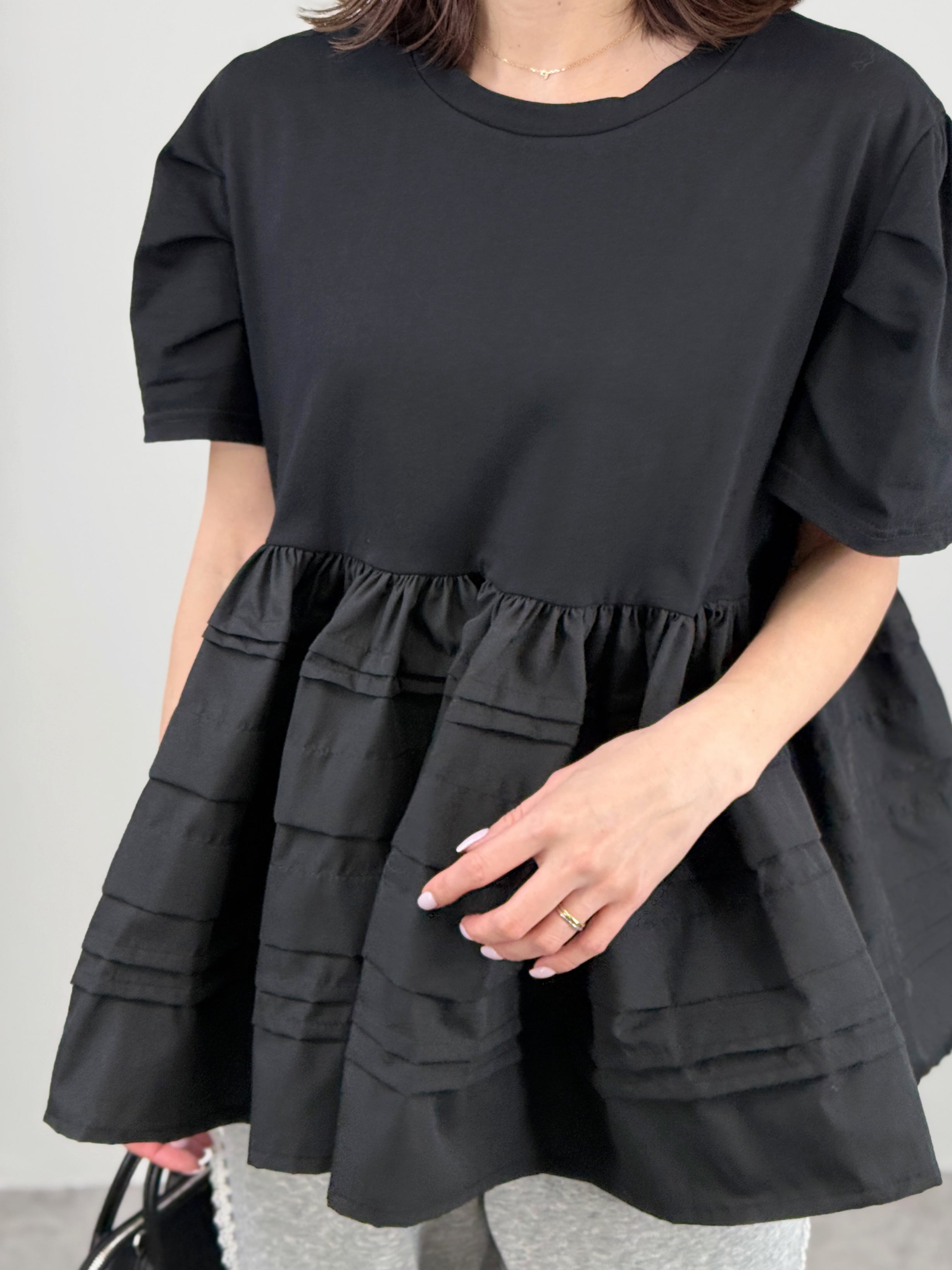一枚で主役級の華やかさ。カットソーにランダムなラインフリルを施したドッキングトップスです。