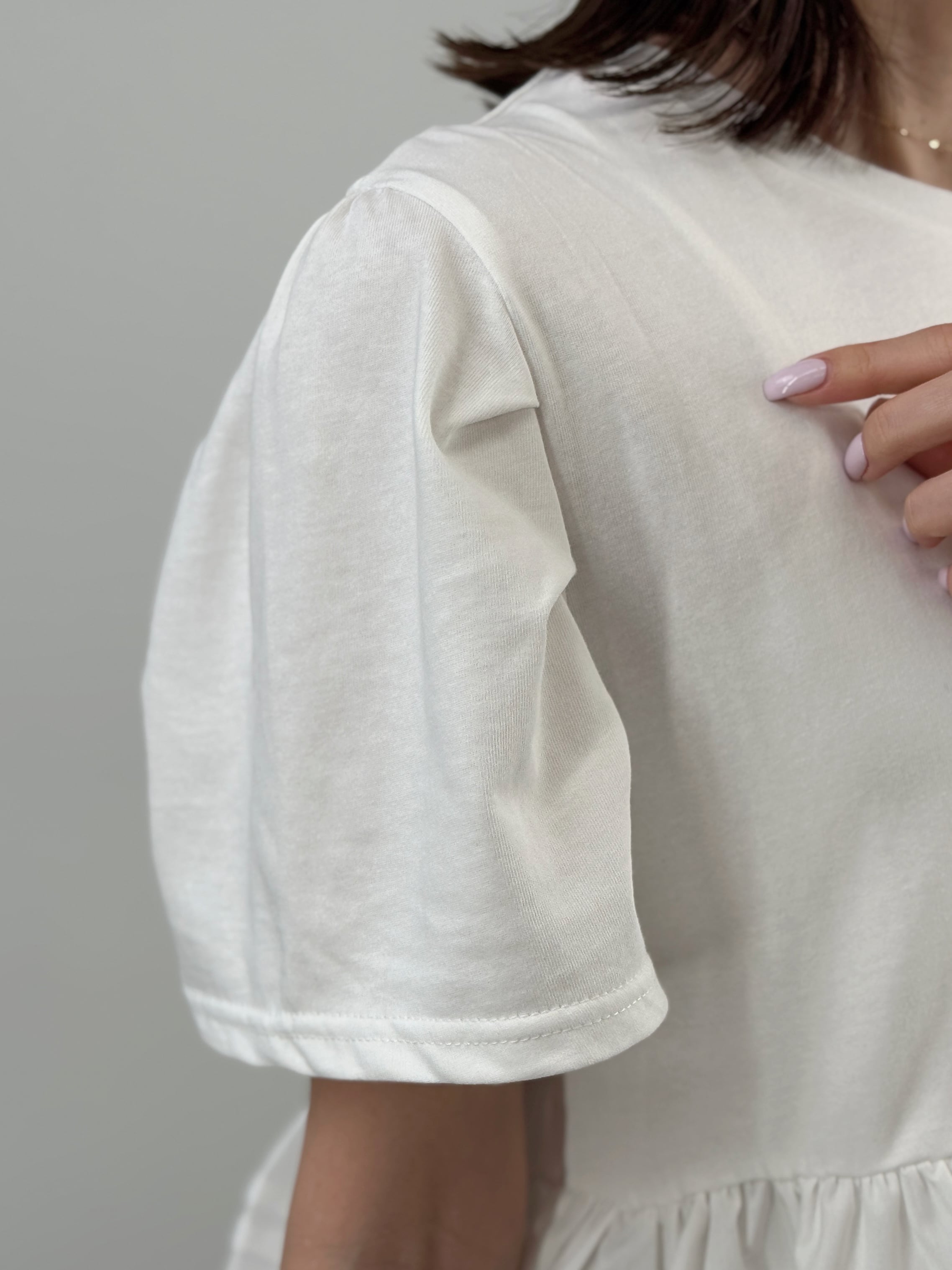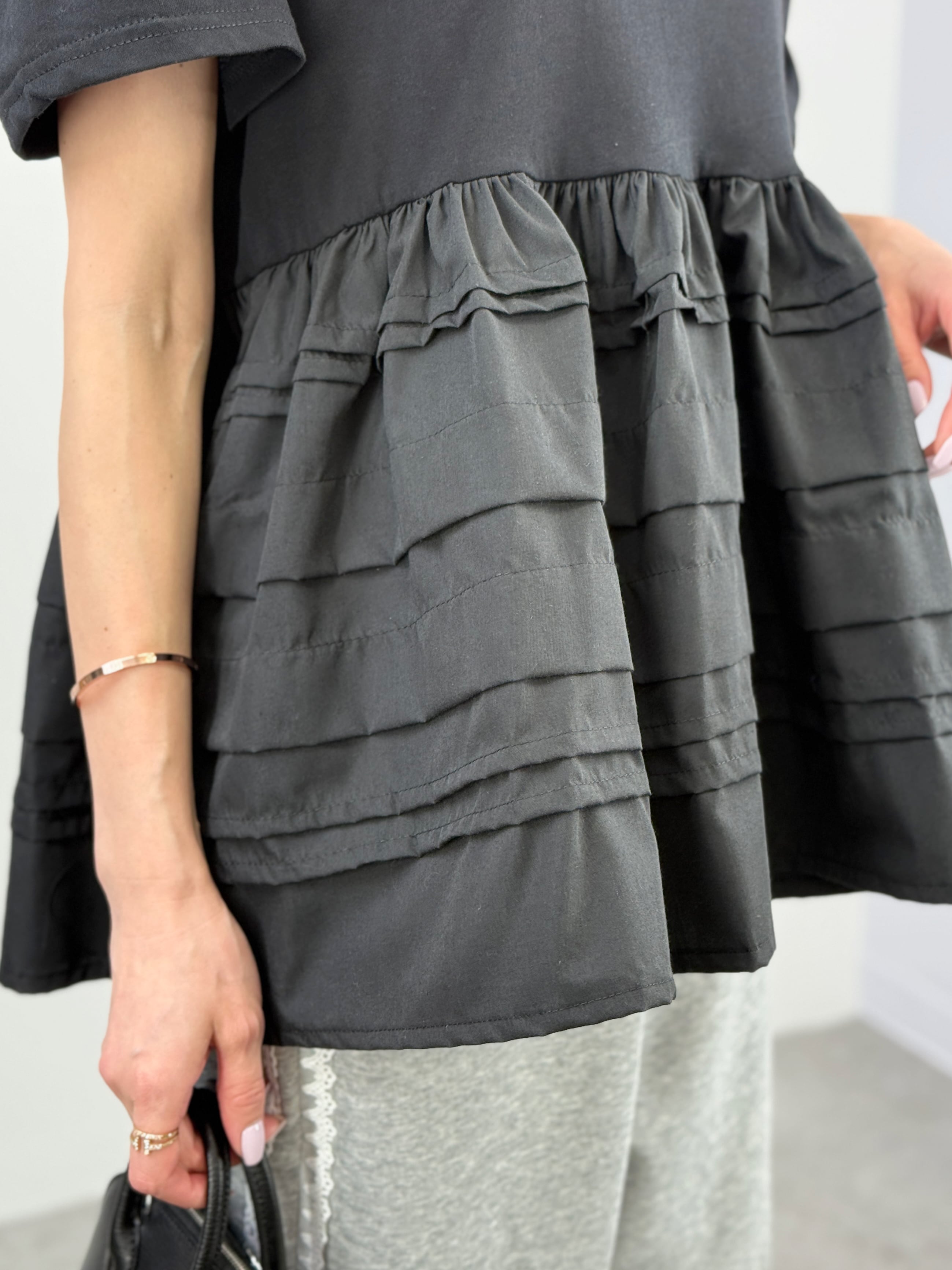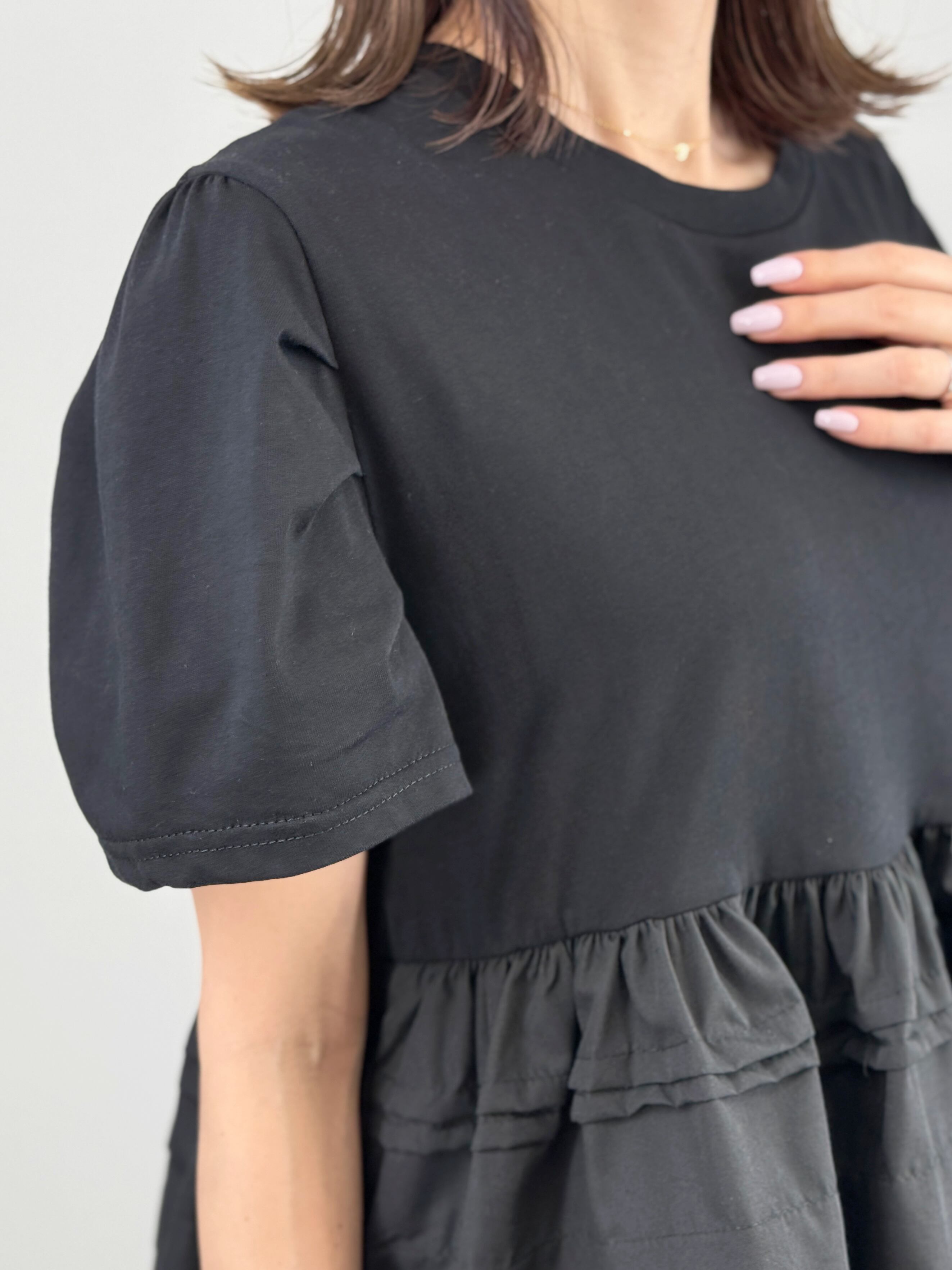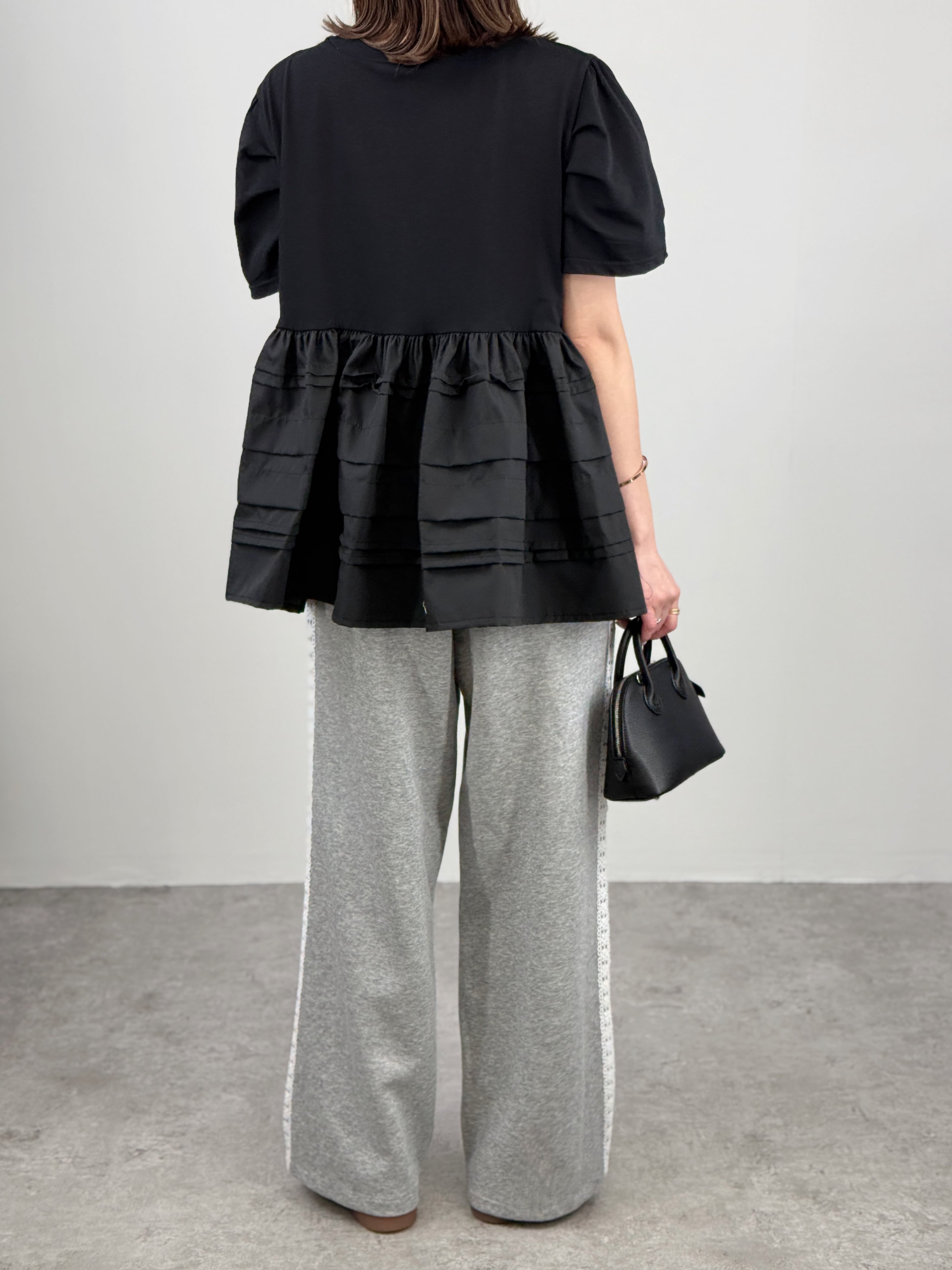 一枚で主役級の華やかさ。カットソーにランダムなラインフリルを施したドッキングトップスです。