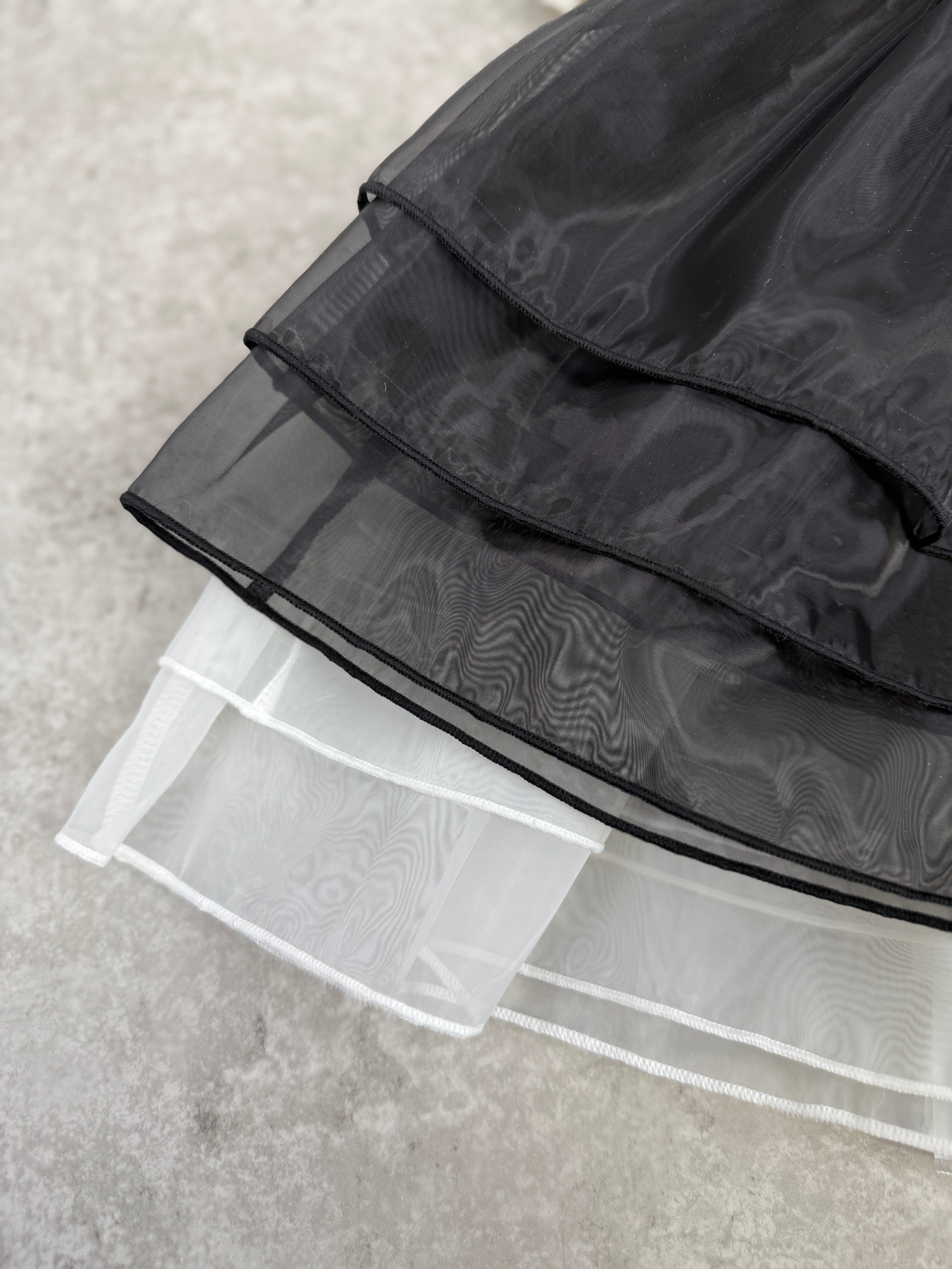 カジュアルなコットンTシャツに、軽やかな3段チュールを重ねた一枚。