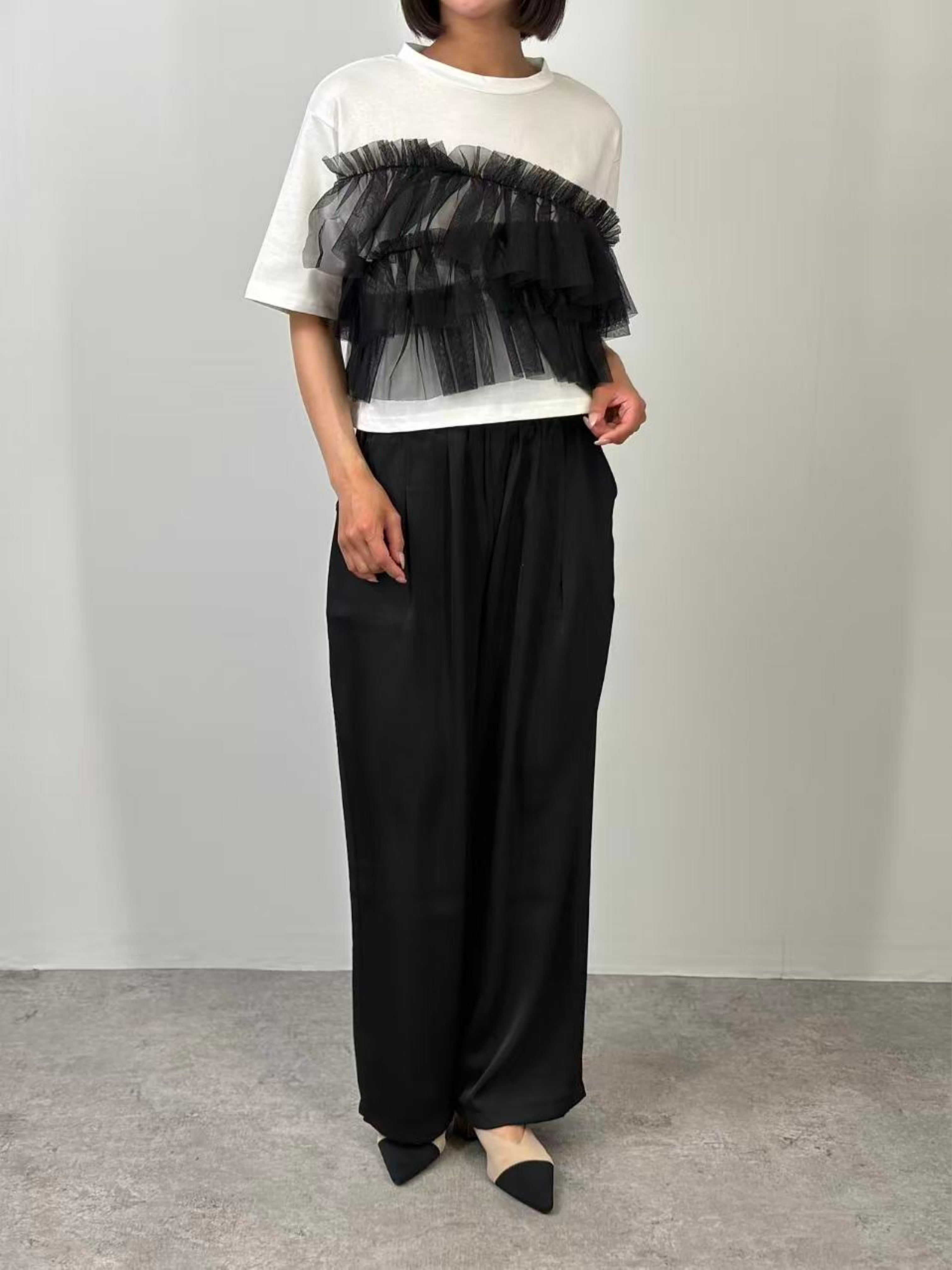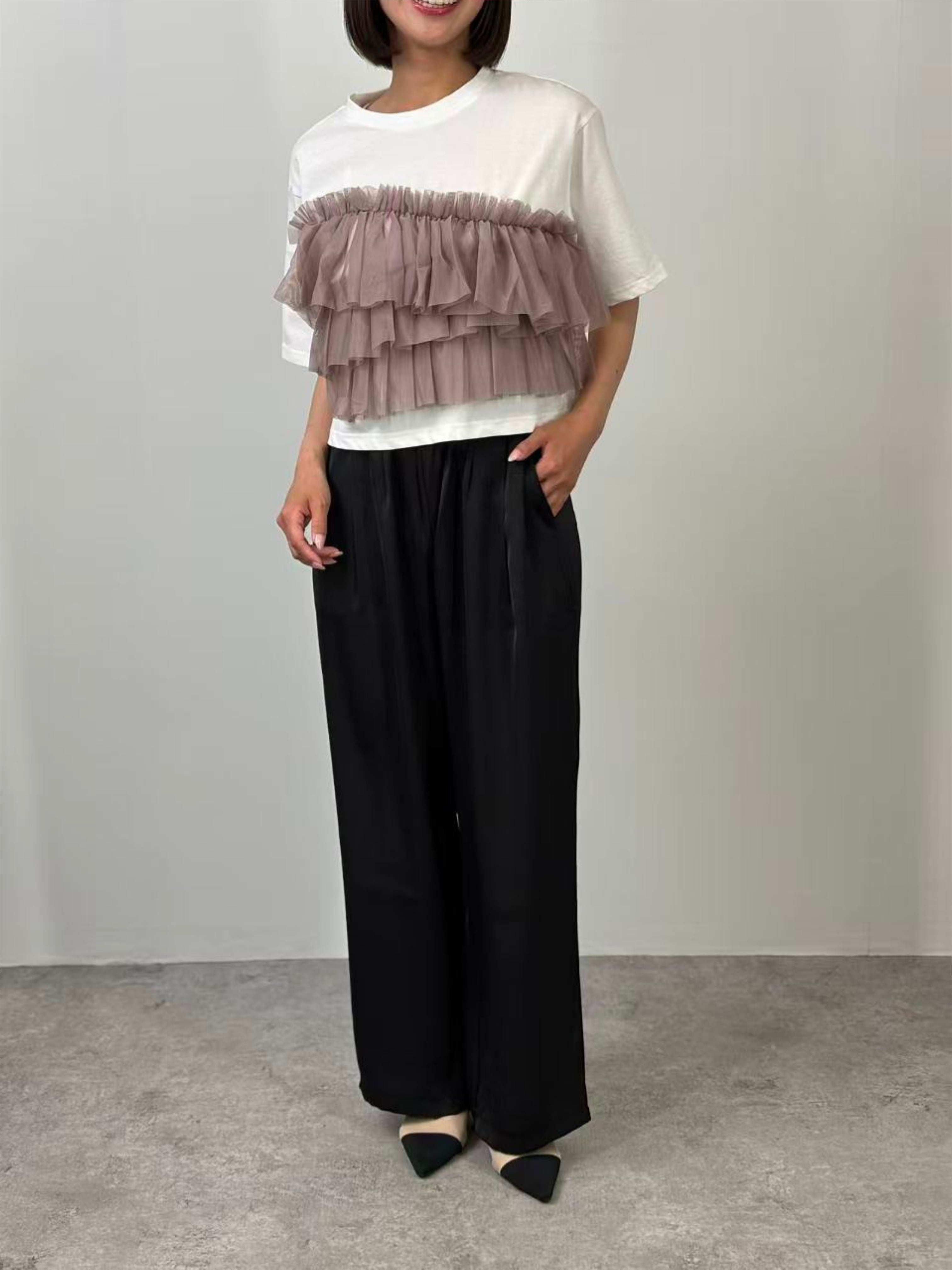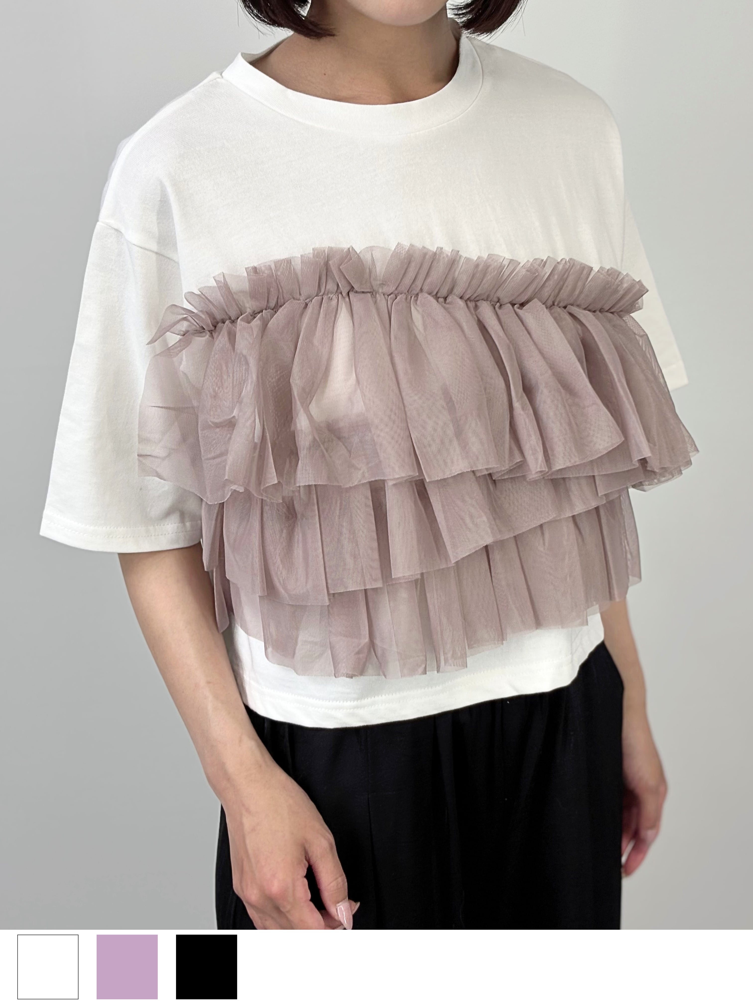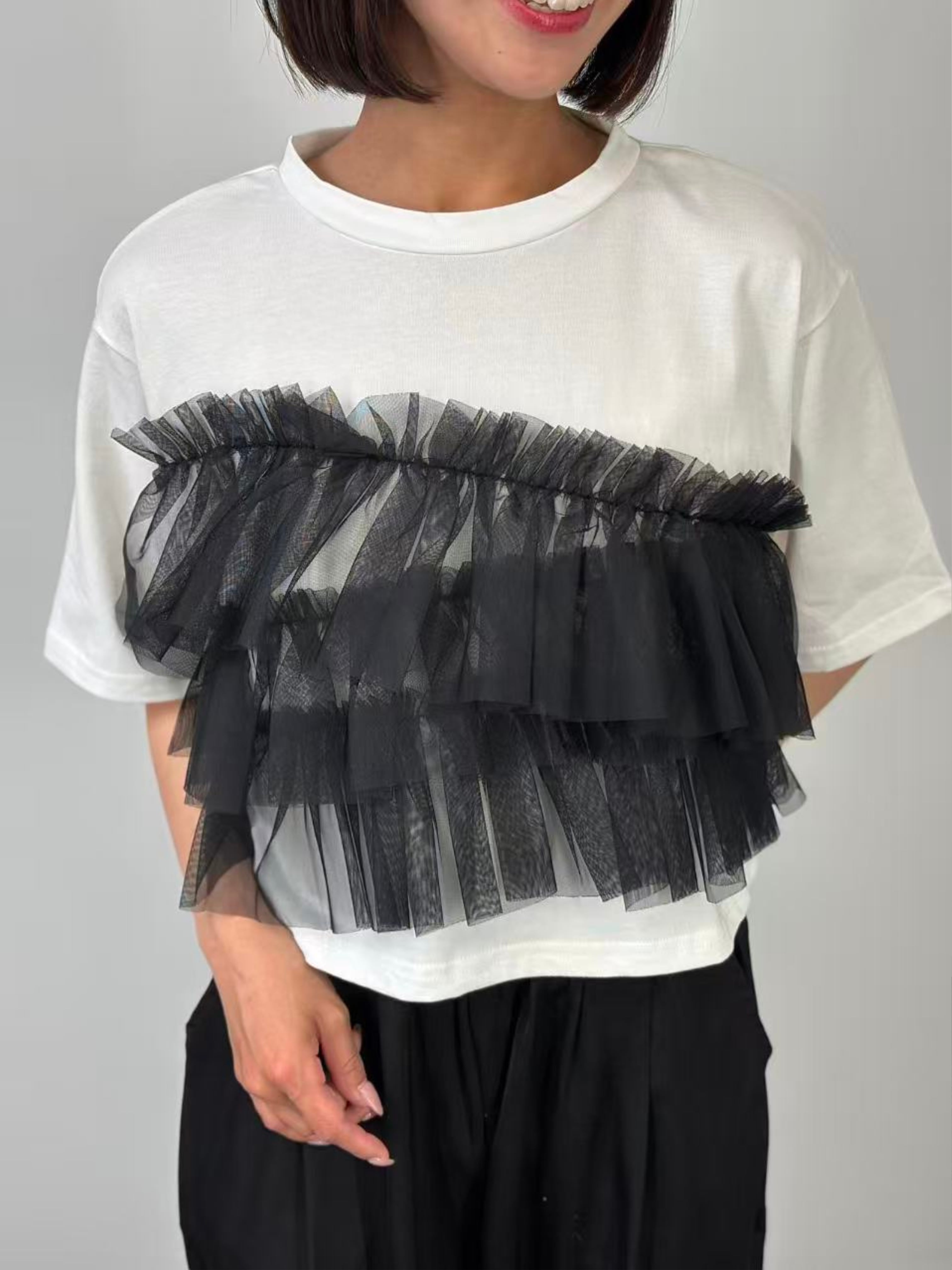 ベーシックな半袖Tシャツに、フロントにチュールをドッキングしたトップス。