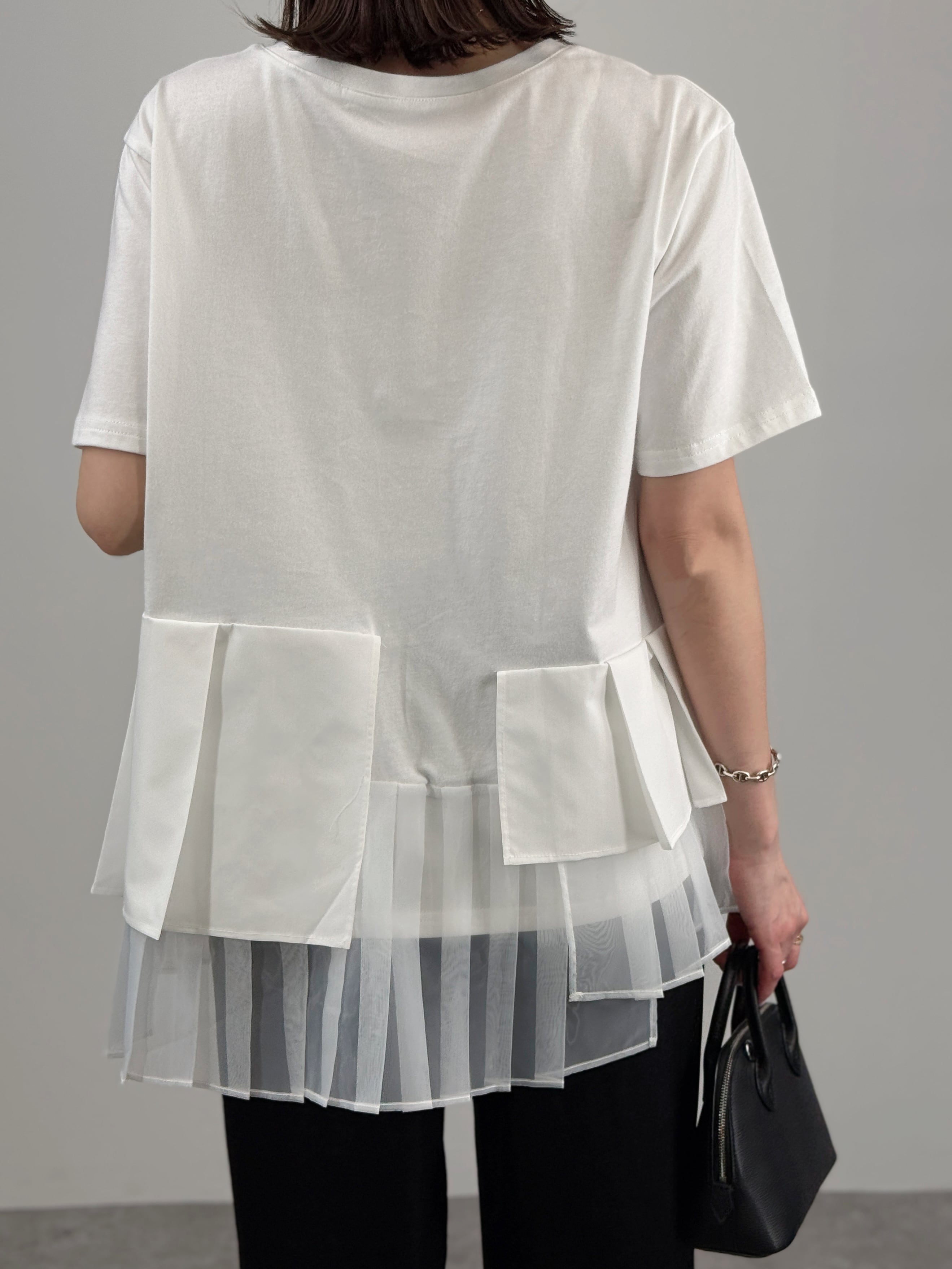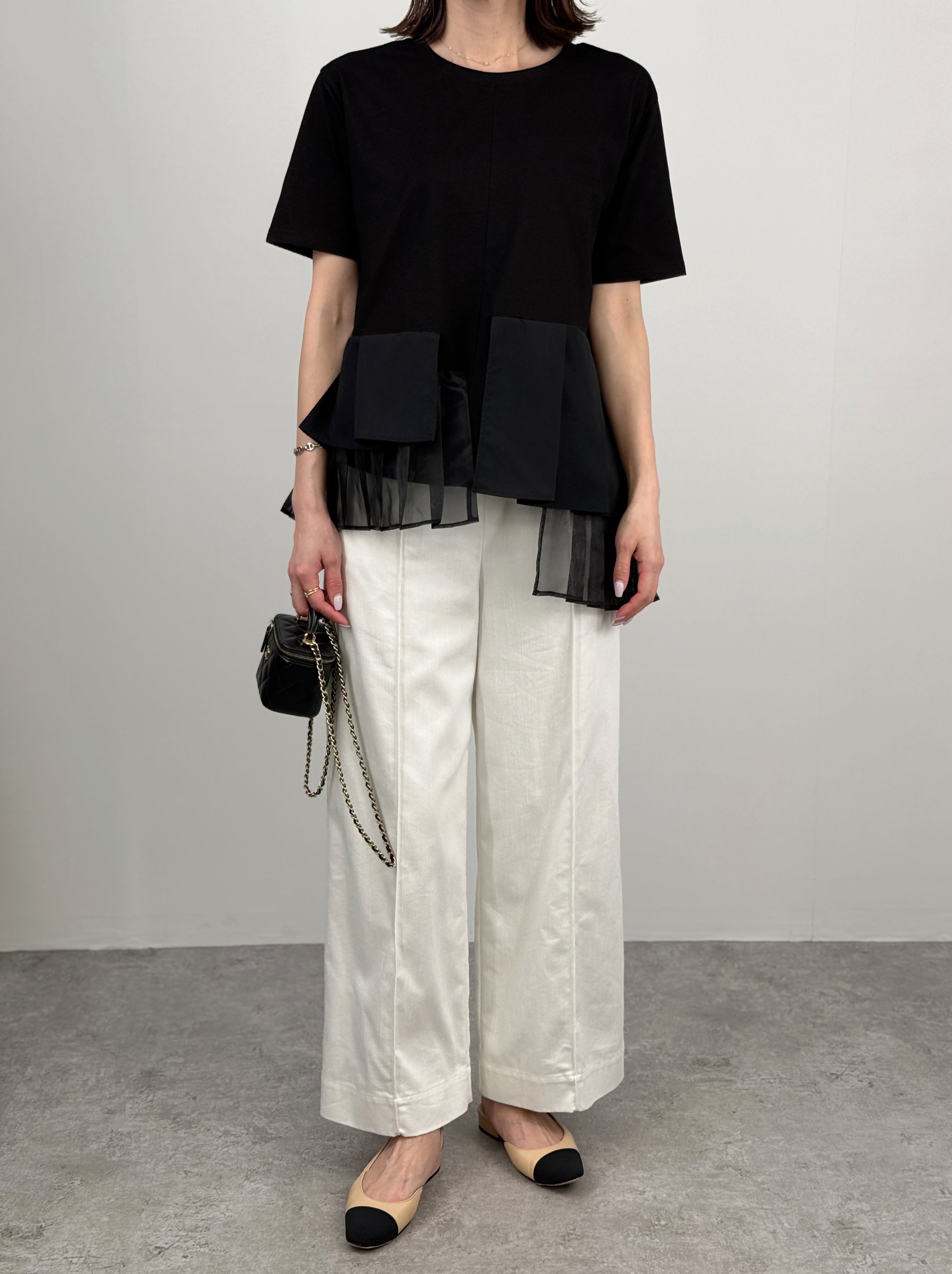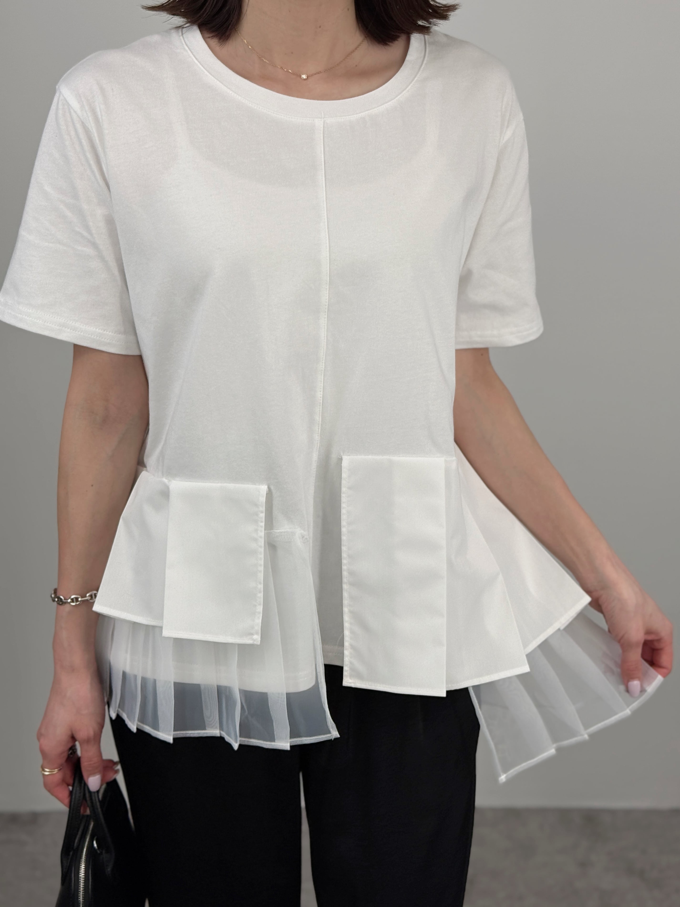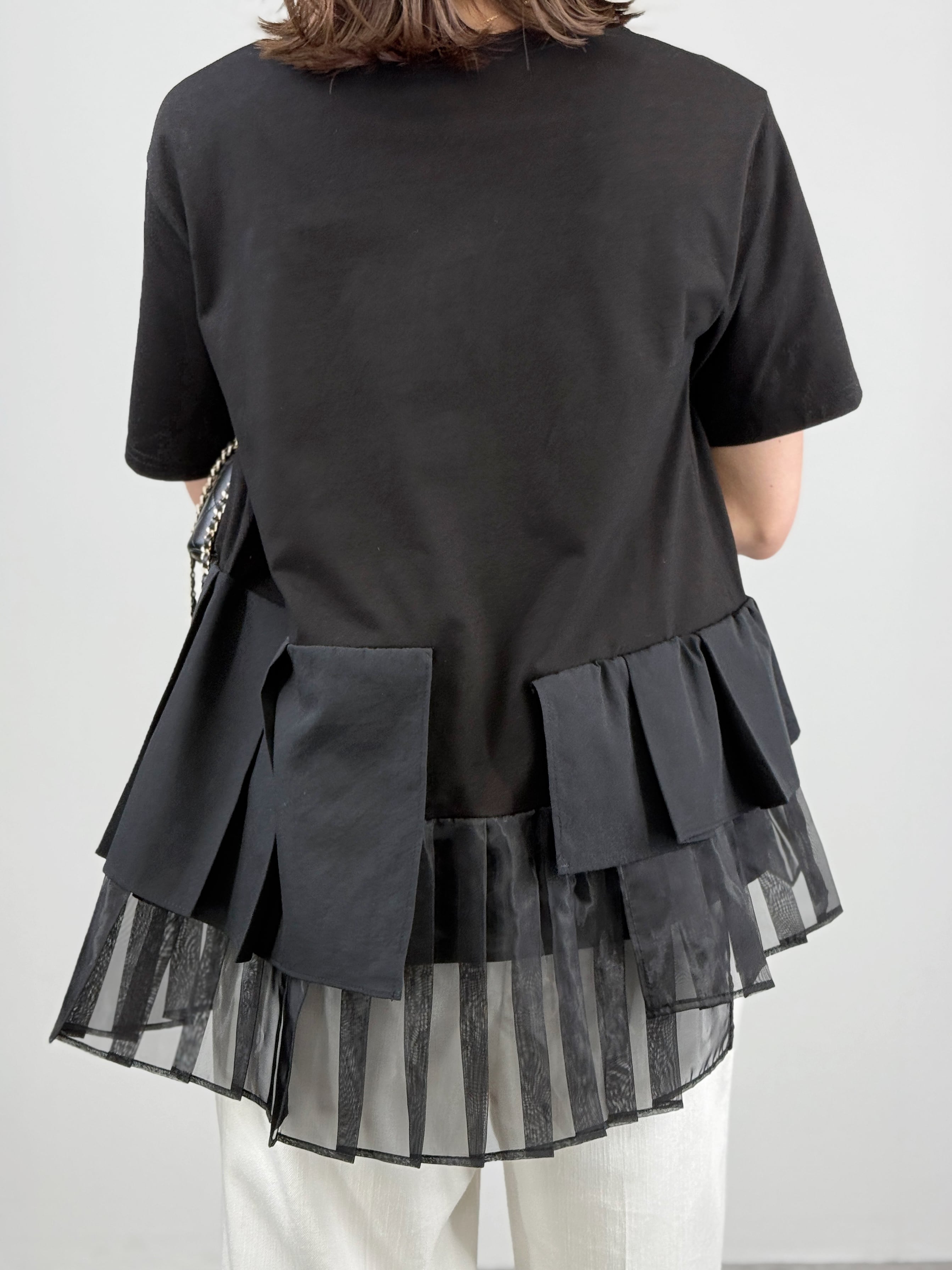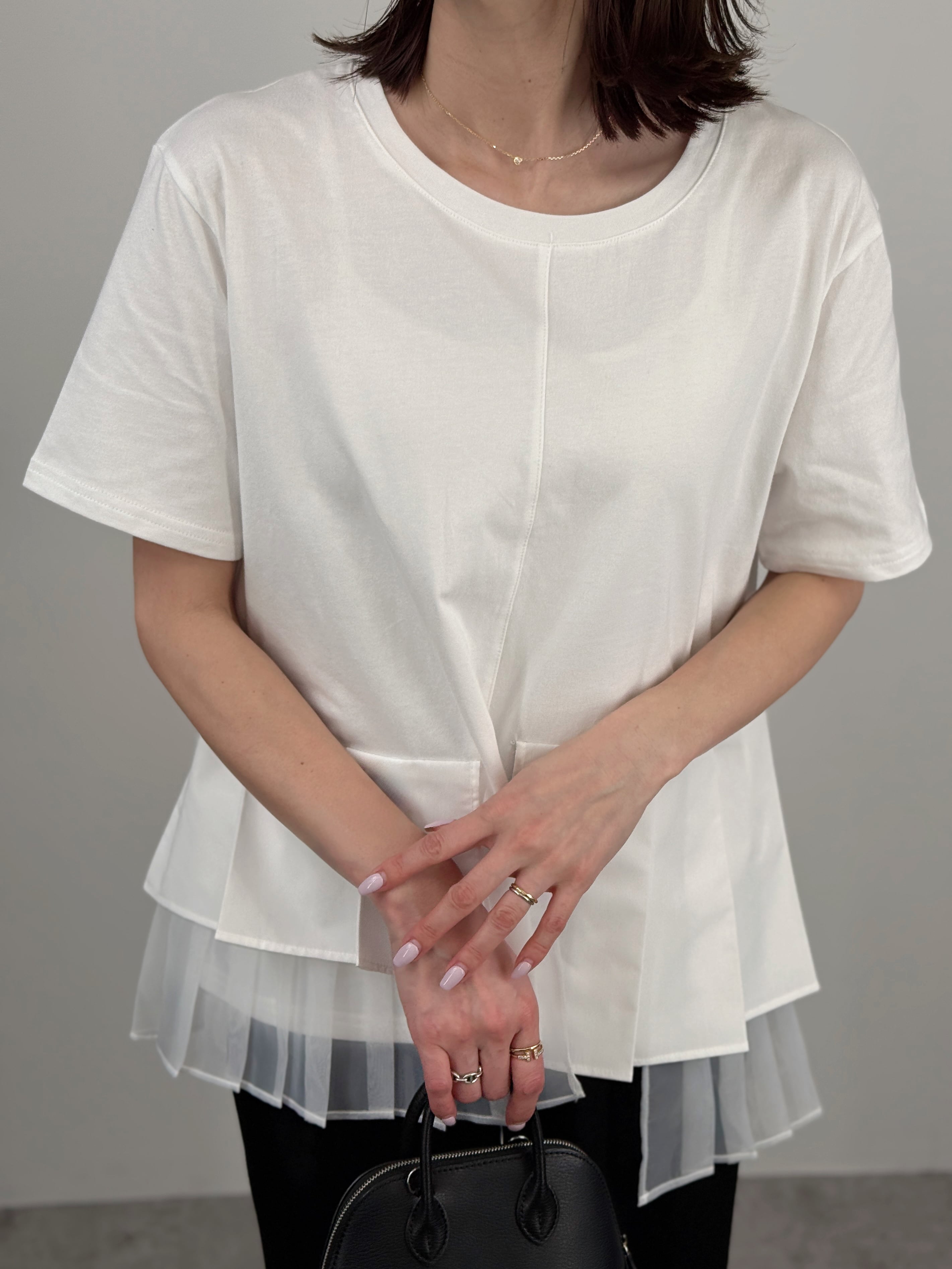 柔らかな綿100%のカットソーに、ハリのあるタック生地とシアーなオーガンジーを重ねた贅沢なデザインです。