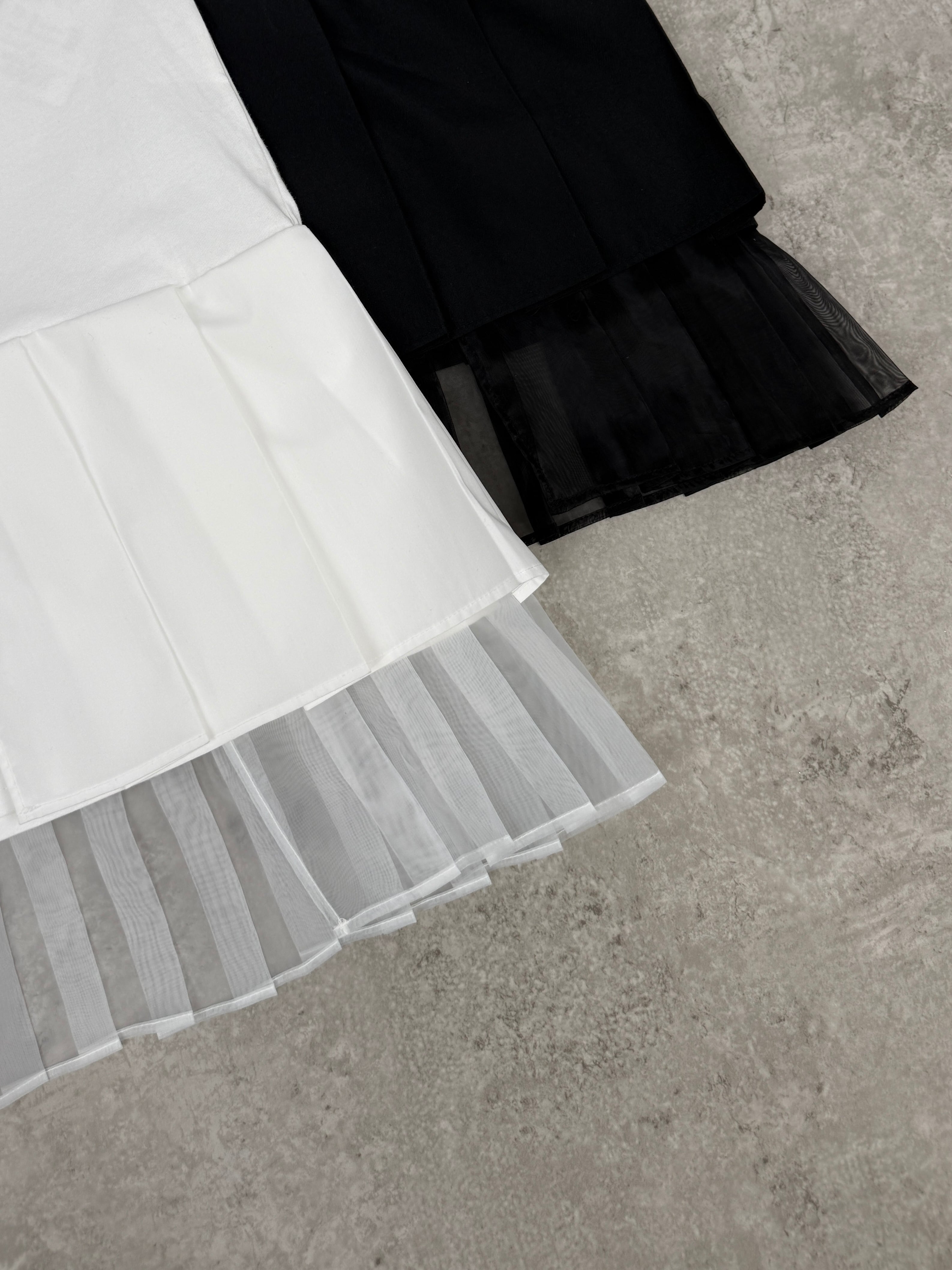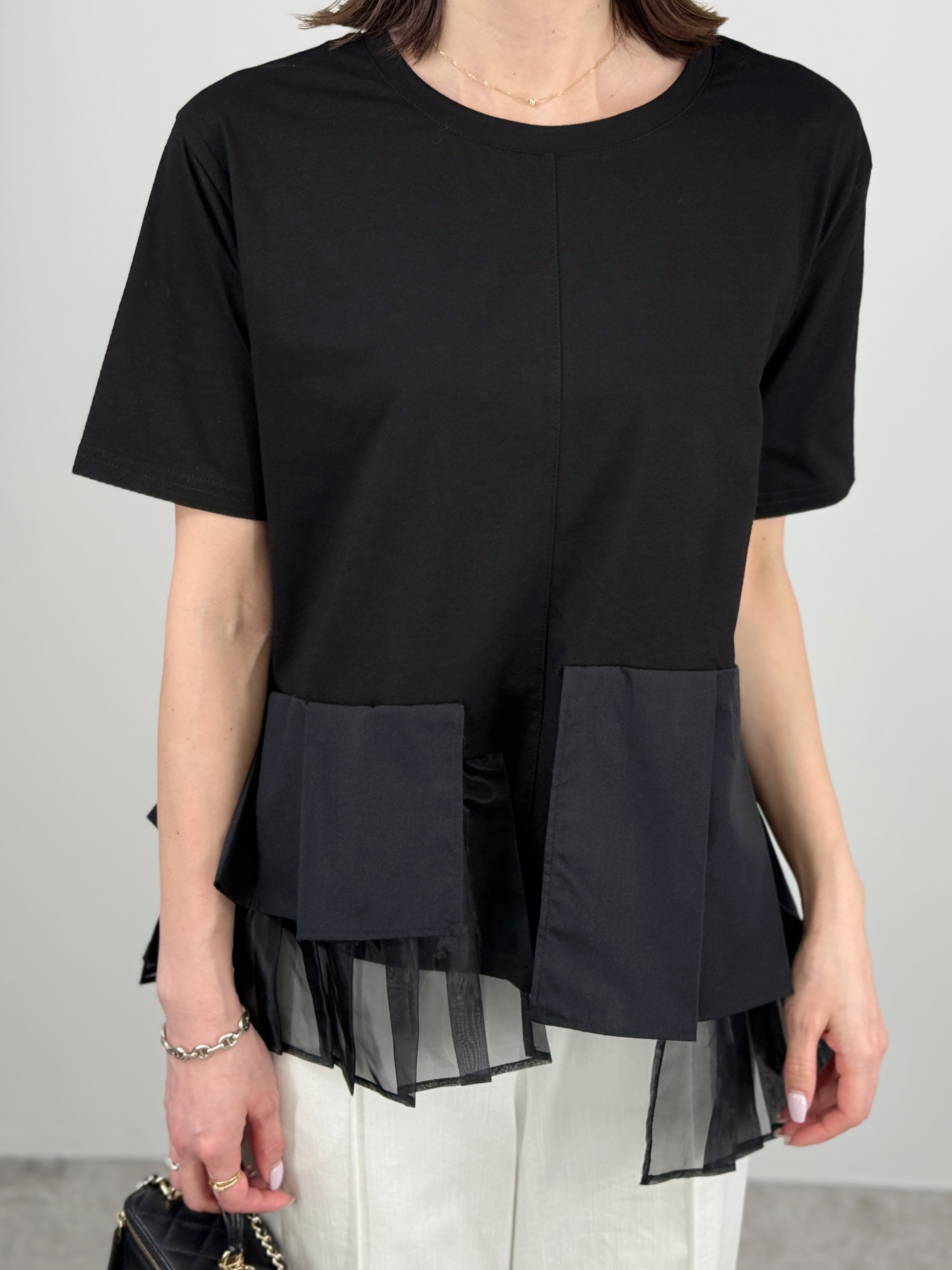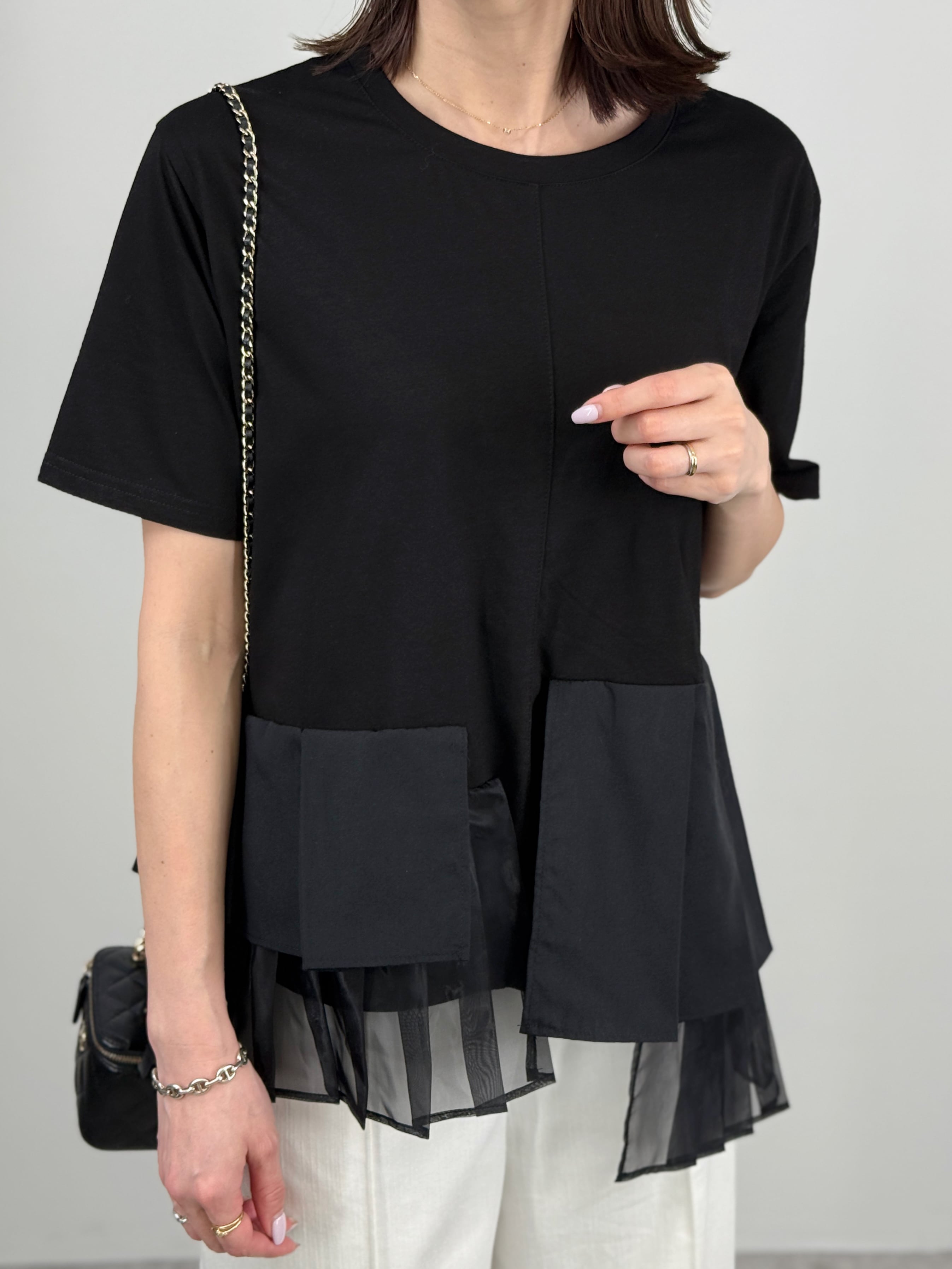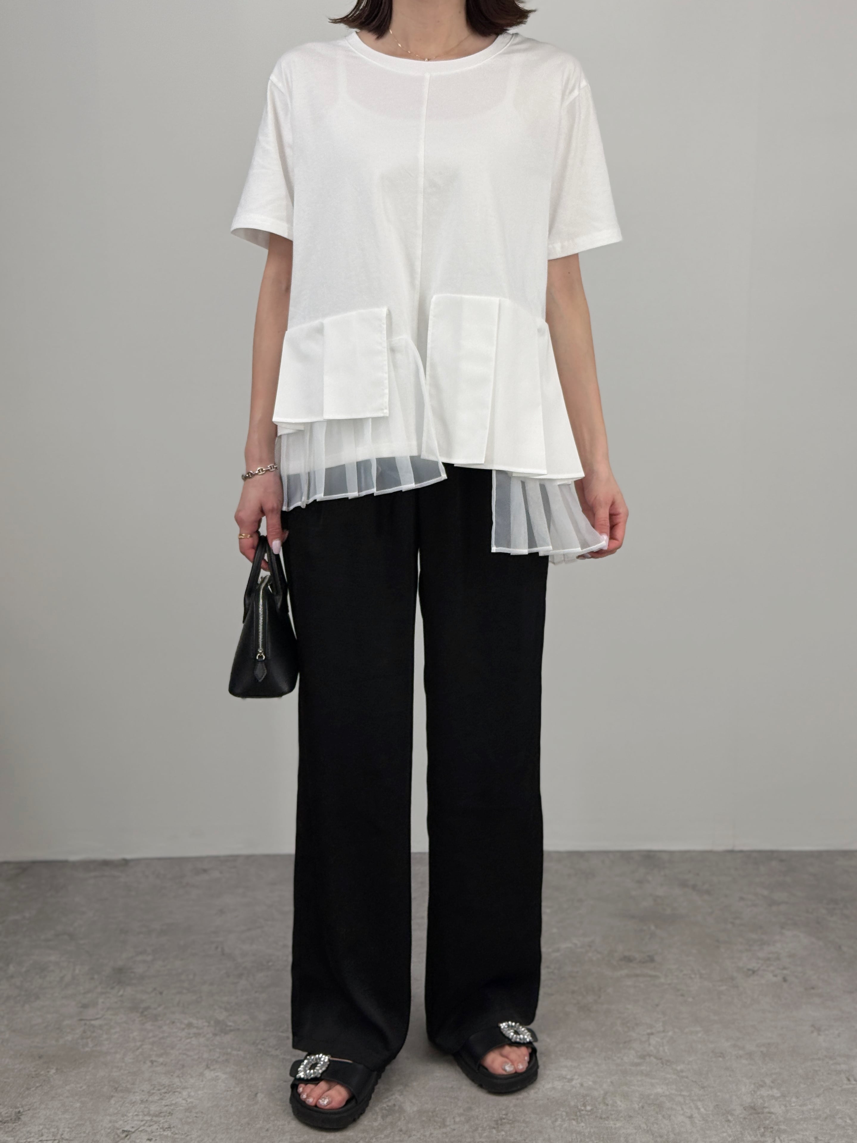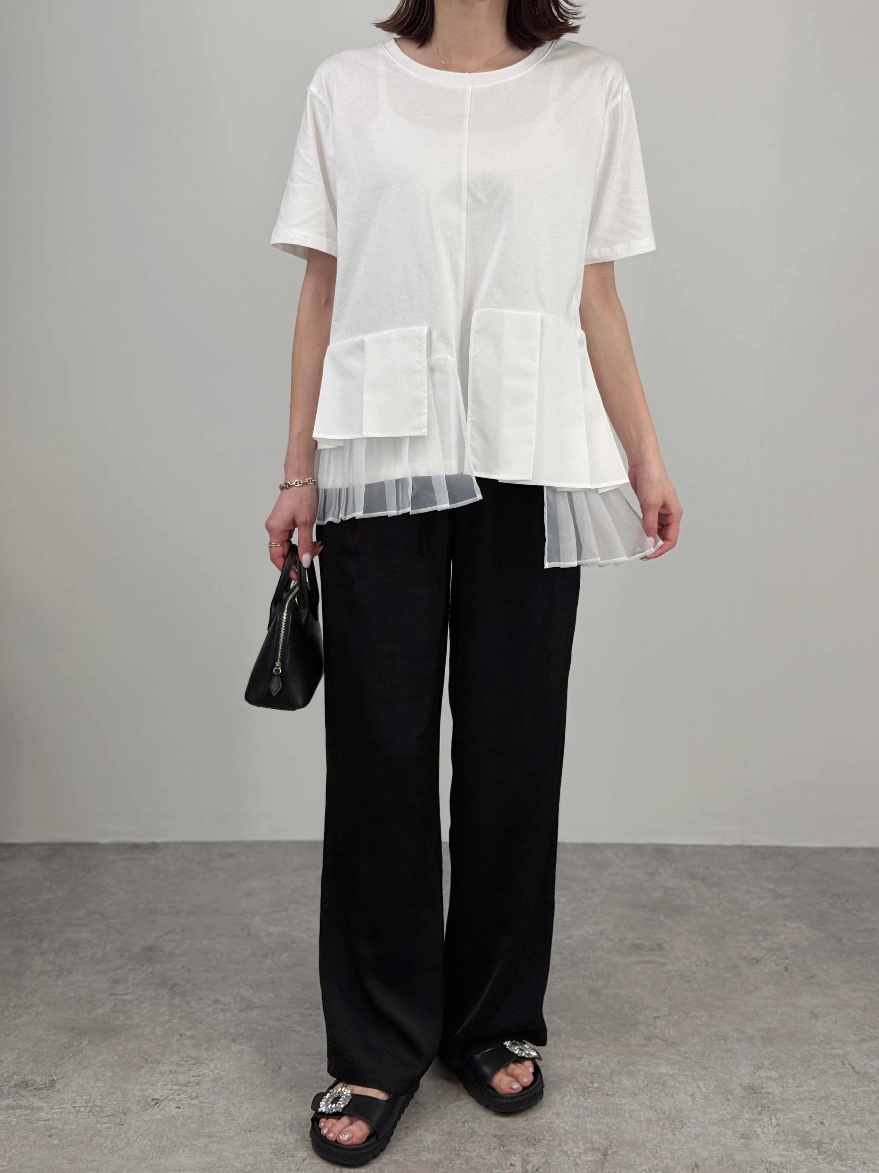 柔らかな綿100%のカットソーに、ハリのあるタック生地とシアーなオーガンジーを重ねた贅沢なデザインです。