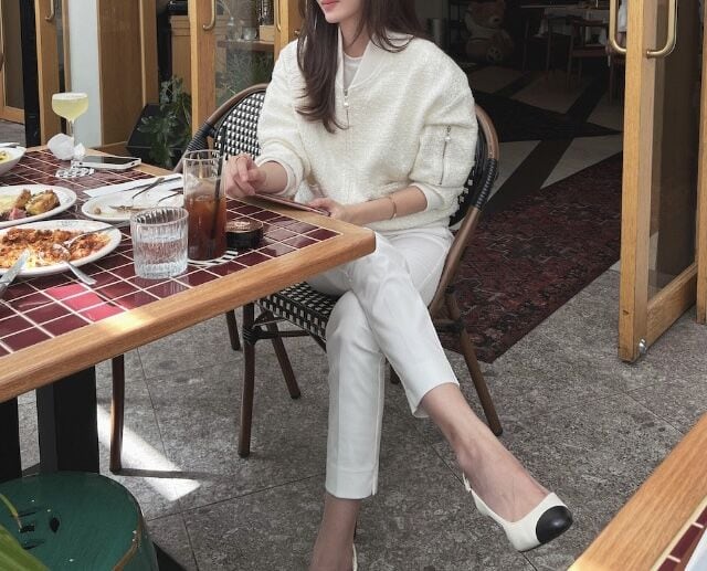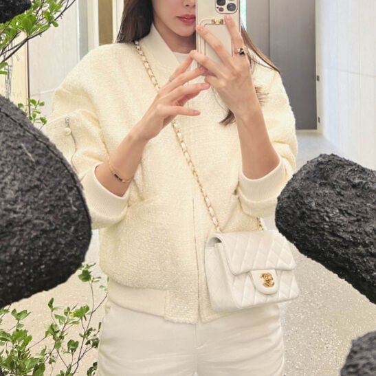 ツイード生地のブルゾンでカジュアルさもあり、パールのジップボタンで可愛いさ倍増!