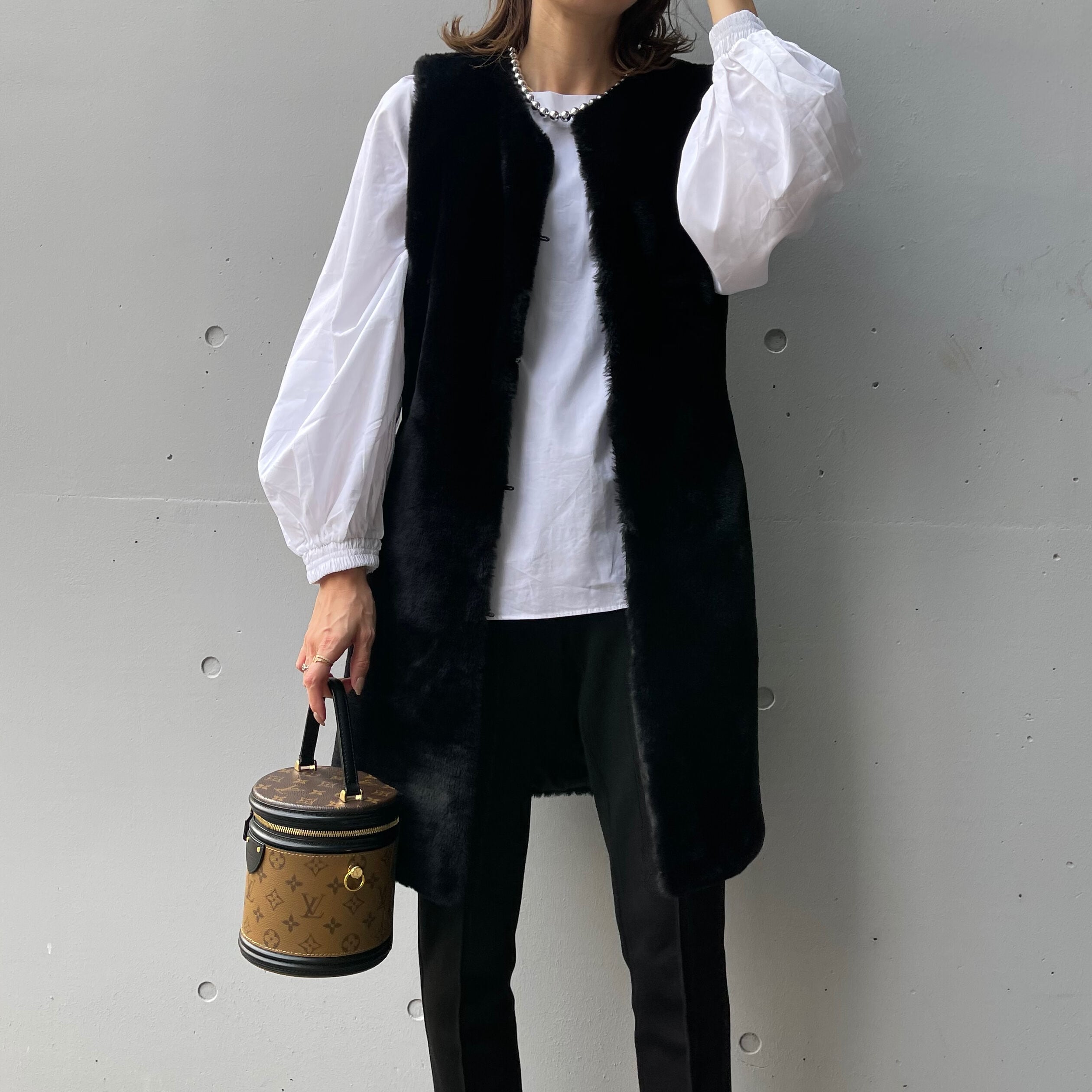 毛の短いファーベストは着丈が長めでヒップラインをカバー!