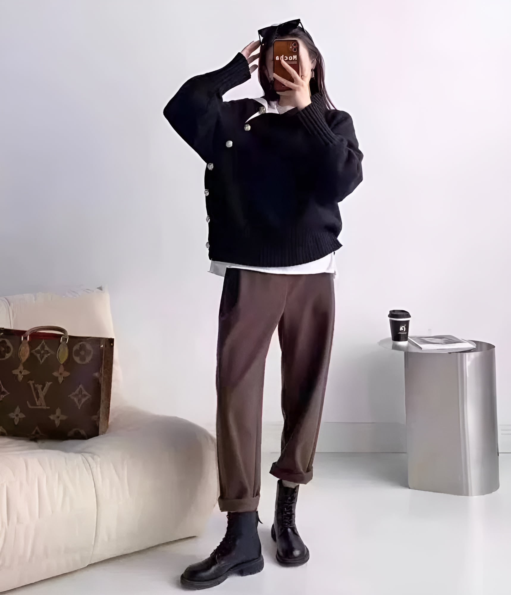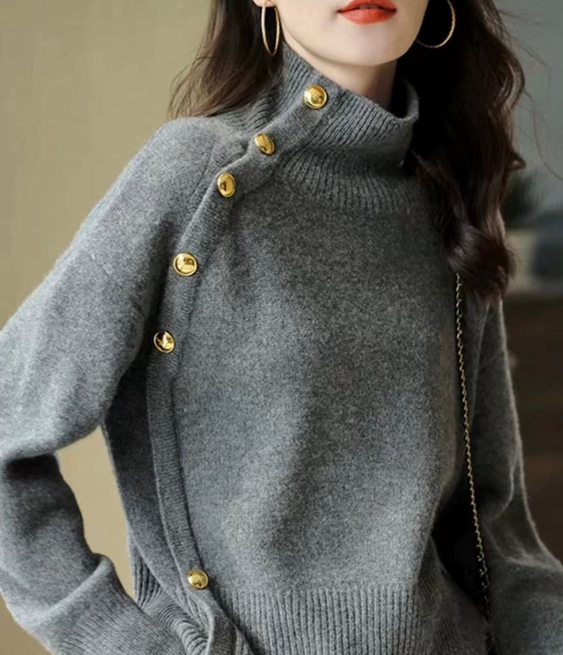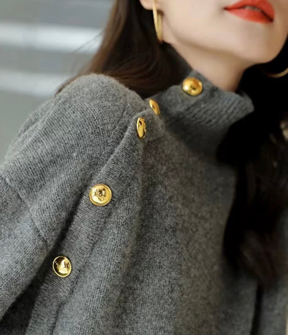 ハイネックデザインに、上品なゴールドボタンのアクセントが加わり、洗練されたスタイルを演出♡