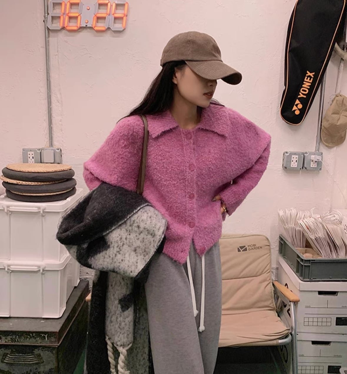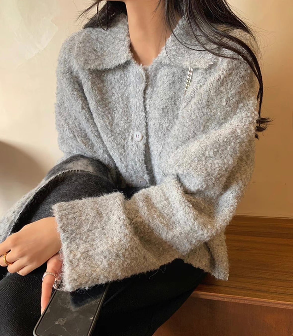 ふわもこ素材のニットは襟付き、ボタン付きでいつもと違う印象を。