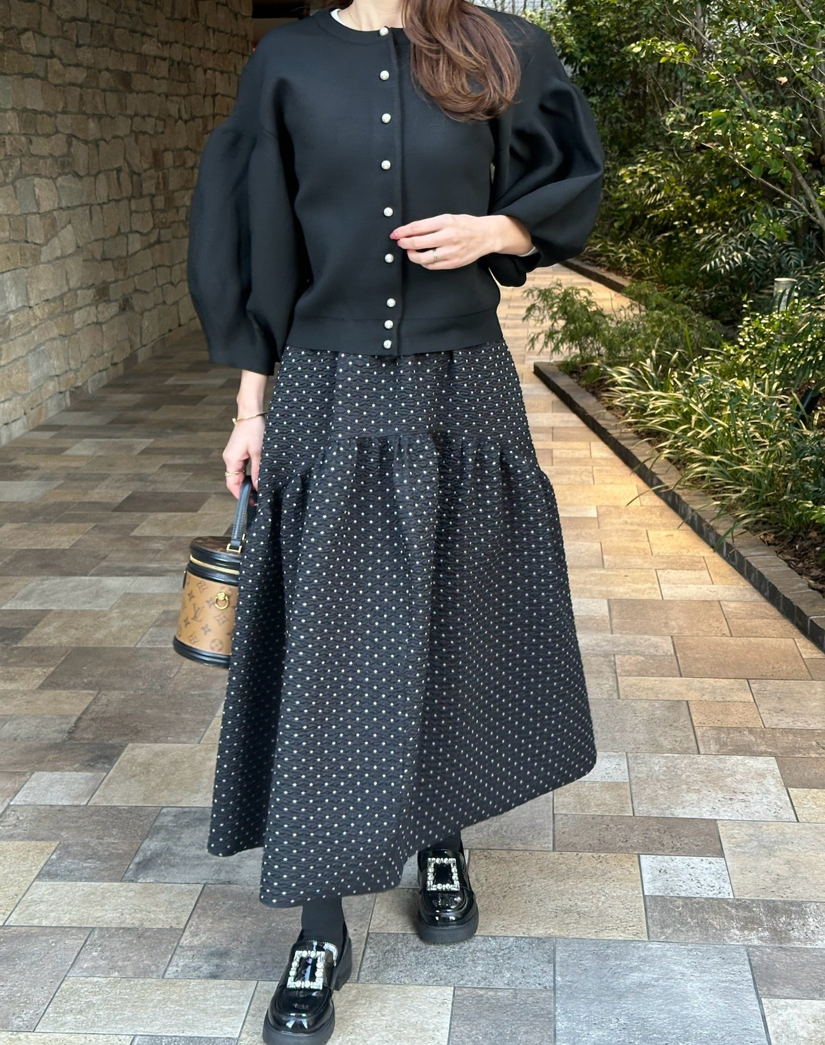 トレンドのパールボタンとボリュームスリーブがポイントのカーディガン♪
