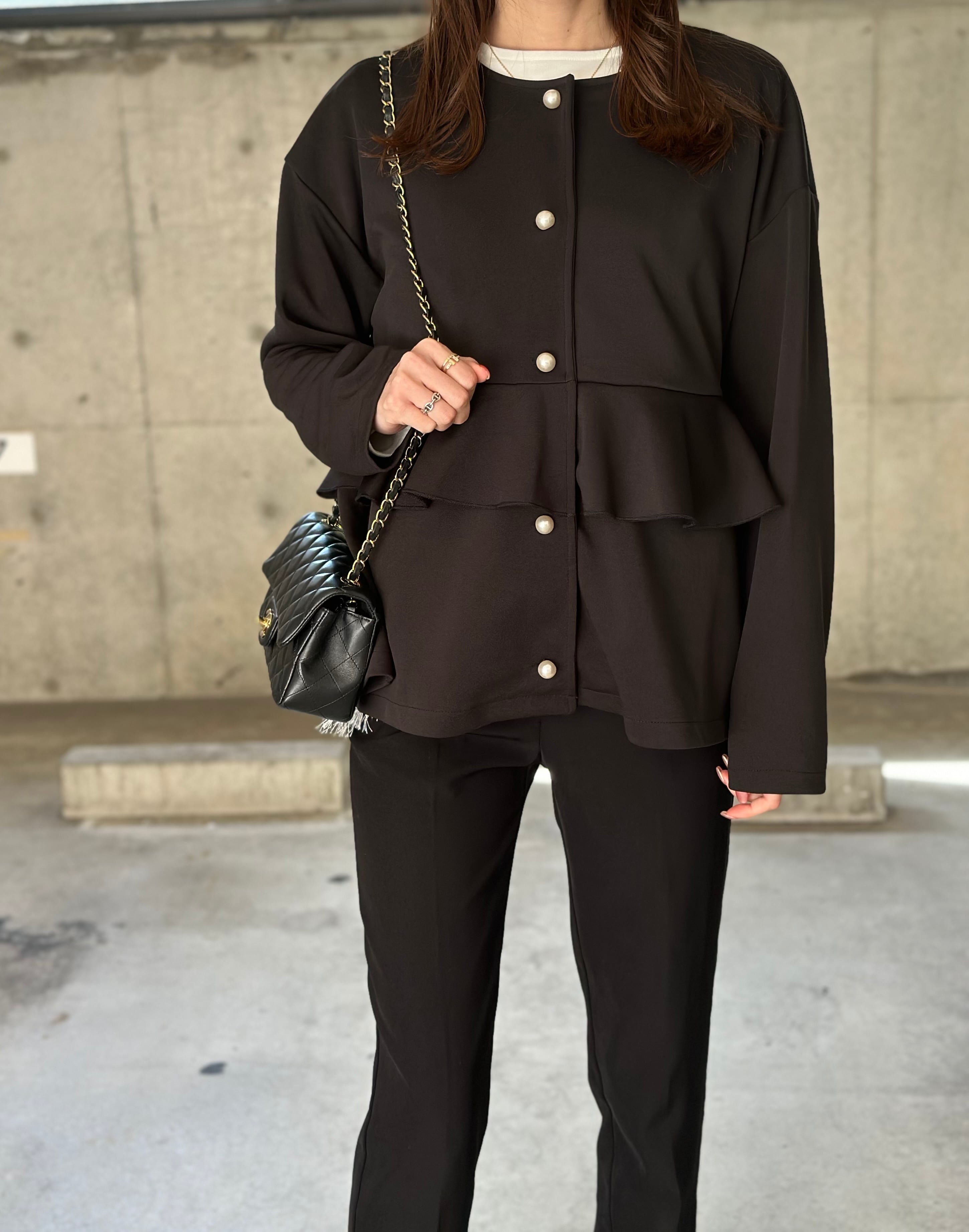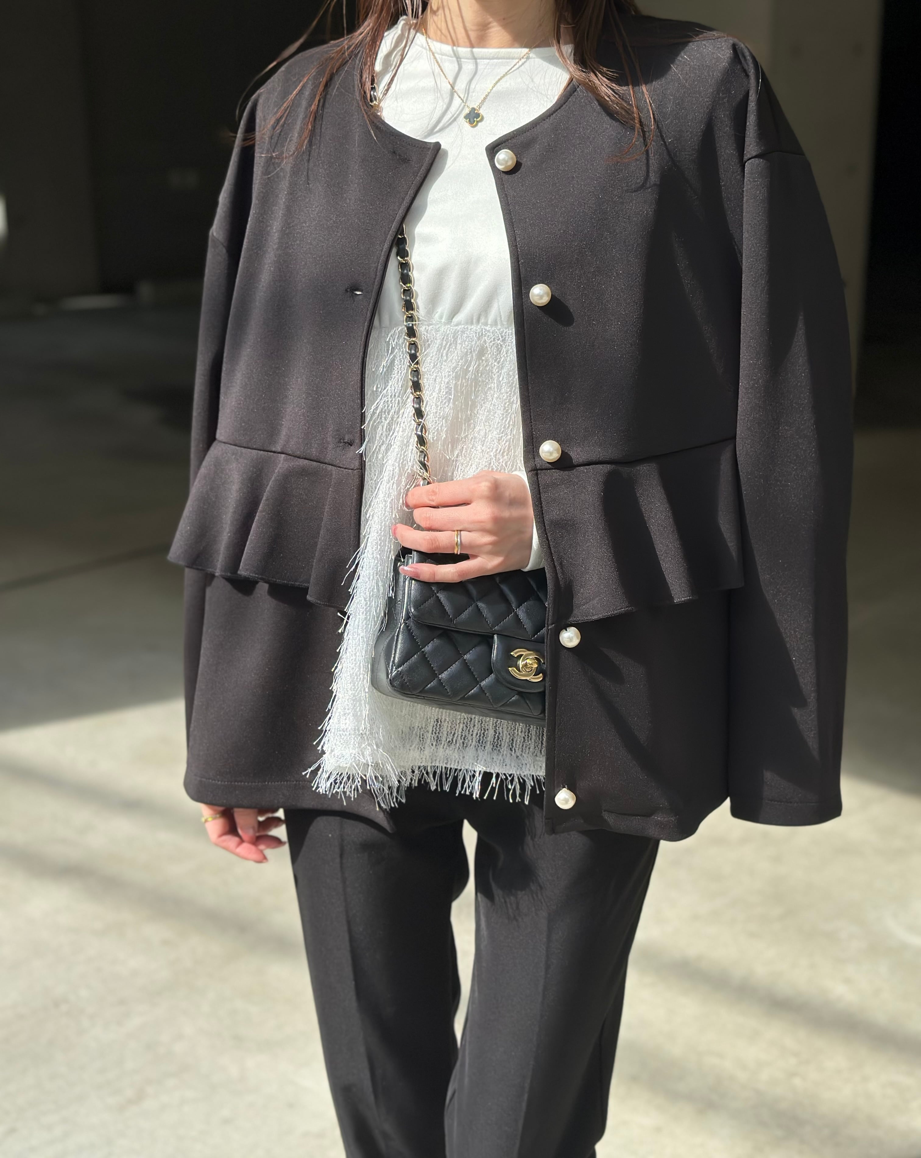 手持ちのボトムスと合わせるだけで、着映え間違いなしのパール×フリルのデザインジャケット